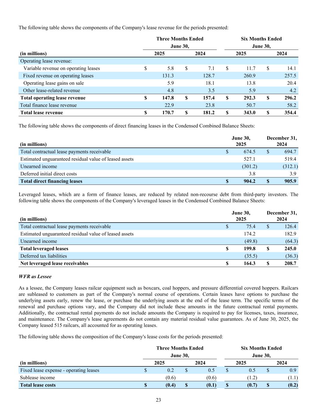 The following table shows the components of the Company's lease revenue for the periods presented: Three Months Ended Six Months Ended June 30, June 30, (in millions) 2025 2024 2025 2024 Operating lease revenue: Variable revenue on operating leases $ 5.8 $ 7.1 $ 11.7 $ 14.1 Fixed revenue on operating leases 131.3 128.7 260.9 257.5 Operating lease gains on sale 5.9 18.1 13.8 20.4 Other lease-related revenue 4.8 3.5 5.9 4.2 Total operating lease revenue $ 147.8 $ 157.4 $ 292.3 $ 296.2 Total finance lease revenue 22.9 23.8 50.7 58.2 Total lease revenue $ 170.7 $ 181.2 $ 343.0 $ 354.4 The following table shows the components of direct financing leases in the Condensed Combined Balance Sheets: (in millions) June 30, 2025 December 31, 2024 Total contractual lease payments receivable $ 674.5 $ 694.7 Estimated unguaranteed residual value of leased assets 527.1 519.4 Unearned income (301.2) (312.1) Deferred initial direct costs 3.8 3.9 Total direct financing leases $ 904.2 $ 905.9 Leveraged leases, which are a form of finance leases, are reduced by related non-recourse debt from third-party investors. The following table shows the components of the Company's leveraged leases in the Condensed Combined Balance Sheets: (in millions) June 30, 2025 December 31, 2024 Total contractual lease payments receivable $ 75.4 $ 126.4 Estimated unguaranteed residual value of leased assets 174.2 182.9 Unearned income (49.8) (64.3) Total leveraged leases $ 199.8 $ 245.0 Deferred tax liabilities (35.5) (36.3) Net leveraged lease receivables $ 164.3 $ 208.7 WFR as Lessee As a lessee, the Company leases railcar equipment such as boxcars, coal hoppers, and pressure differential covered hoppers. Railcars are subleased to customers as part of the Company's normal course of operations. Certain leases have options to purchase the underlying assets early, renew the lease, or purchase the underlying assets at the end of the lease term. The specific terms of the renewal and purchase options vary, and the Company did not include these amounts in the future contractual rental payments. Additionally, the contractual rental payments do not include amounts the Company is required to pay for licenses, taxes, insurance, and maintenance. The Company's lease agreements do not contain any material residual value guarantees. As of June 30, 2025, the Company leased 515 railcars, all accounted for as operating leases. The following table shows the composition of the Company's lease costs for the periods presented: Three Months Ended Six Months Ended June 30, June 30, (in millions) 2025 2024 2025 2024 Fixed lease expense - operating leases $ 0.2 $ 0.5 $ 0.5 $ 0.9 Sublease income (0.6) (0.6) (1.2) (1.1) Total lease costs $ (0.4) $ (0.1) $ (0.7) $ (0.2) 23