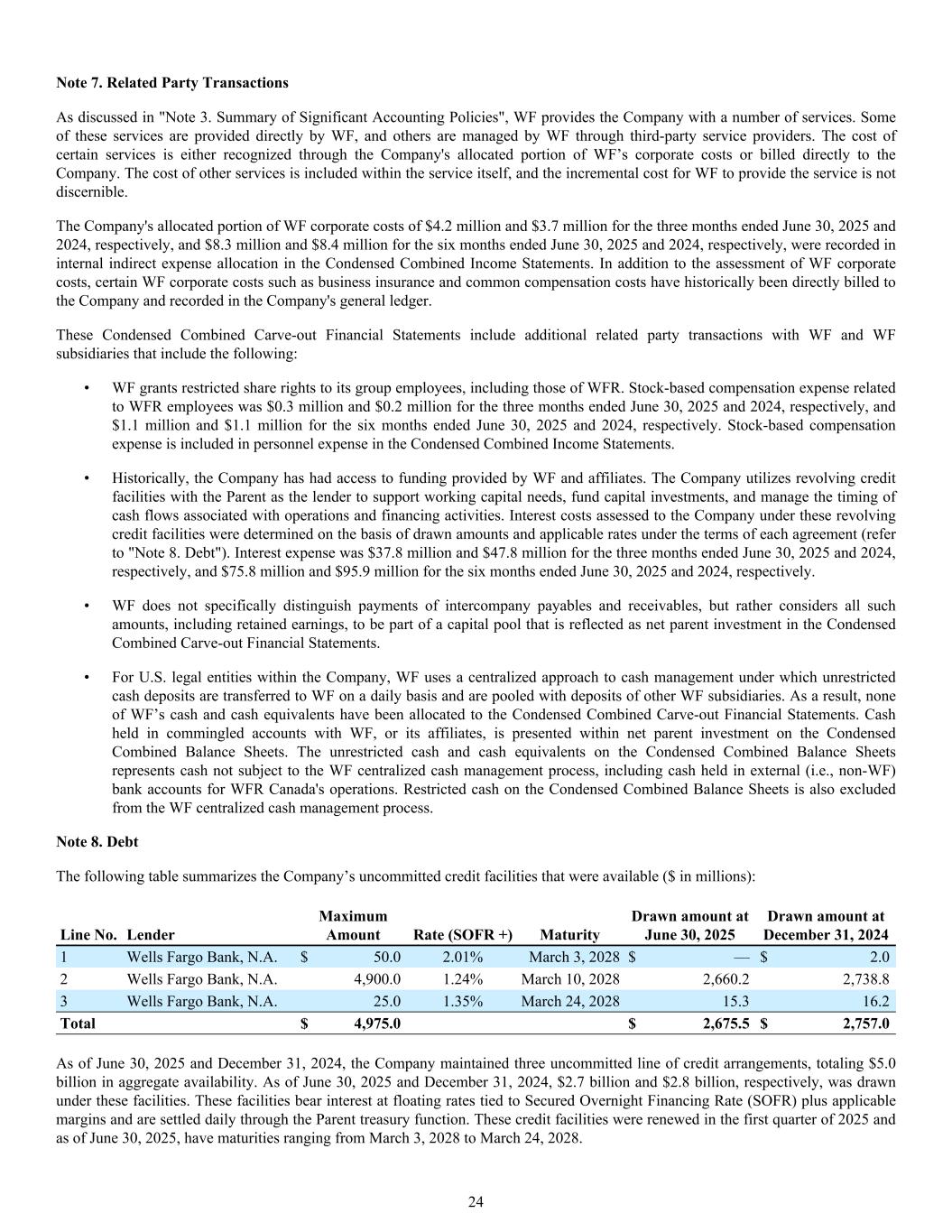 Note 7. Related Party Transactions As discussed in "Note 3. Summary of Significant Accounting Policies", WF provides the Company with a number of services. Some of these services are provided directly by WF, and others are managed by WF through third-party service providers. The cost of certain services is either recognized through the Company's allocated portion of WF’s corporate costs or billed directly to the Company. The cost of other services is included within the service itself, and the incremental cost for WF to provide the service is not discernible. The Company's allocated portion of WF corporate costs of $4.2 million and $3.7 million for the three months ended June 30, 2025 and 2024, respectively, and $8.3 million and $8.4 million for the six months ended June 30, 2025 and 2024, respectively, were recorded in internal indirect expense allocation in the Condensed Combined Income Statements. In addition to the assessment of WF corporate costs, certain WF corporate costs such as business insurance and common compensation costs have historically been directly billed to the Company and recorded in the Company's general ledger. These Condensed Combined Carve-out Financial Statements include additional related party transactions with WF and WF subsidiaries that include the following: • WF grants restricted share rights to its group employees, including those of WFR. Stock-based compensation expense related to WFR employees was $0.3 million and $0.2 million for the three months ended June 30, 2025 and 2024, respectively, and $1.1 million and $1.1 million for the six months ended June 30, 2025 and 2024, respectively. Stock-based compensation expense is included in personnel expense in the Condensed Combined Income Statements. • Historically, the Company has had access to funding provided by WF and affiliates. The Company utilizes revolving credit facilities with the Parent as the lender to support working capital needs, fund capital investments, and manage the timing of cash flows associated with operations and financing activities. Interest costs assessed to the Company under these revolving credit facilities were determined on the basis of drawn amounts and applicable rates under the terms of each agreement (refer to "Note 8. Debt"). Interest expense was $37.8 million and $47.8 million for the three months ended June 30, 2025 and 2024, respectively, and $75.8 million and $95.9 million for the six months ended June 30, 2025 and 2024, respectively. • WF does not specifically distinguish payments of intercompany payables and receivables, but rather considers all such amounts, including retained earnings, to be part of a capital pool that is reflected as net parent investment in the Condensed Combined Carve-out Financial Statements. • For U.S. legal entities within the Company, WF uses a centralized approach to cash management under which unrestricted cash deposits are transferred to WF on a daily basis and are pooled with deposits of other WF subsidiaries. As a result, none of WF’s cash and cash equivalents have been allocated to the Condensed Combined Carve-out Financial Statements. Cash held in commingled accounts with WF, or its affiliates, is presented within net parent investment on the Condensed Combined Balance Sheets. The unrestricted cash and cash equivalents on the Condensed Combined Balance Sheets represents cash not subject to the WF centralized cash management process, including cash held in external (i.e., non-WF) bank accounts for WFR Canada's operations. Restricted cash on the Condensed Combined Balance Sheets is also excluded from the WF centralized cash management process. Note 8. Debt The following table summarizes the Company’s uncommitted credit facilities that were available ($ in millions): Line No. Lender Maximum Amount Rate (SOFR +) Maturity Drawn amount at June 30, 2025 Drawn amount at December 31, 2024 1 Wells Fargo Bank, N.A. $ 50.0 2.01% March 3, 2028 $ — $ 2.0 2 Wells Fargo Bank, N.A. 4,900.0 1.24% March 10, 2028 2,660.2 2,738.8 3 Wells Fargo Bank, N.A. 25.0 1.35% March 24, 2028 15.3 16.2 Total $ 4,975.0 $ 2,675.5 $ 2,757.0 As of June 30, 2025 and December 31, 2024, the Company maintained three uncommitted line of credit arrangements, totaling $5.0 billion in aggregate availability. As of June 30, 2025 and December 31, 2024, $2.7 billion and $2.8 billion, respectively, was drawn under these facilities. These facilities bear interest at floating rates tied to Secured Overnight Financing Rate (SOFR) plus applicable margins and are settled daily through the Parent treasury function. These credit facilities were renewed in the first quarter of 2025 and as of June 30, 2025, have maturities ranging from March 3, 2028 to March 24, 2028. 24