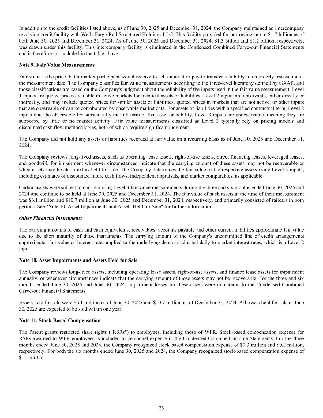 In addition to the credit facilities listed above, as of June 30, 2025 and December 31, 2024, the Company maintained an intercompany revolving credit facility with Wells Fargo Rail Structured Holdings LLC. This facility provided for borrowings up to $1.7 billion as of both June 30, 2025 and December 31, 2024. As of June 30, 2025 and December 31, 2024, $1.3 billion and $1.2 billion, respectively, was drawn under this facility. This intercompany facility is eliminated in the Condensed Combined Carve-out Financial Statements and is therefore not included in the table above. Note 9. Fair Value Measurements Fair value is the price that a market participant would receive to sell an asset or pay to transfer a liability in an orderly transaction at the measurement date. The Company classifies fair value measurements according to the three-level hierarchy defined by GAAP, and those classifications are based on the Company's judgment about the reliability of the inputs used in the fair value measurement. Level 1 inputs are quoted prices available in active markets for identical assets or liabilities. Level 2 inputs are observable, either directly or indirectly, and may include quoted prices for similar assets or liabilities, quoted prices in markets that are not active, or other inputs that are observable or can be corroborated by observable market data. For assets or liabilities with a specified contractual term, Level 2 inputs must be observable for substantially the full term of that asset or liability. Level 3 inputs are unobservable, meaning they are supported by little or no market activity. Fair value measurements classified as Level 3 typically rely on pricing models and discounted cash flow methodologies, both of which require significant judgment. The Company did not hold any assets or liabilities recorded at fair value on a recurring basis as of June 30, 2025 and December 31, 2024. The Company reviews long-lived assets, such as operating lease assets, right-of-use assets, direct financing leases, leveraged leases, and goodwill, for impairment whenever circumstances indicate that the carrying amount of these assets may not be recoverable or when assets may be classified as held for sale. The Company determines the fair value of the respective assets using Level 3 inputs, including estimates of discounted future cash flows, independent appraisals, and market comparables, as applicable. Certain assets were subject to non-recurring Level 3 fair value measurements during the three and six months ended June 30, 2025 and 2024 and continue to be held at June 30, 2025 and December 31, 2024. The fair value of such assets at the time of their measurement was $6.1 million and $10.7 million at June 30, 2025 and December 31, 2024, respectively, and primarily consisted of railcars in both periods. See "Note 10. Asset Impairments and Assets Held for Sale" for further information. Other Financial Instruments The carrying amounts of cash and cash equivalents, receivables, accounts payable and other current liabilities approximate fair value due to the short maturity of those instruments. The carrying amount of the Company's uncommitted line of credit arrangements approximates fair value as interest rates applied to the underlying debt are adjusted daily to market interest rates, which is a Level 2 input. Note 10. Asset Impairments and Assets Held for Sale The Company reviews long-lived assets, including operating lease assets, right-of-use assets, and finance lease assets for impairment annually, or whenever circumstances indicate that the carrying amount of those assets may not be recoverable. For the three and six months ended June 30, 2025 and June 30, 2024, impairment losses for these assets were immaterial to the Condensed Combined Carve-out Financial Statements. Assets held for sale were $6.1 million as of June 30, 2025 and $10.7 million as of December 31, 2024. All assets held for sale at June 30, 2025 are expected to be sold within one year. Note 11. Stock-Based Compensation The Parent grants restricted share rights ("RSRs") to employees, including those of WFR. Stock-based compensation expense for RSRs awarded to WFR employees is included in personnel expense in the Condensed Combined Income Statements. For the three months ended June 30, 2025 and 2024, the Company recognized stock-based compensation expense of $0.3 million and $0.2 million, respectively. For both the six months ended June 30, 2025 and 2024, the Company recognized stock-based compensation expense of $1.1 million. 25