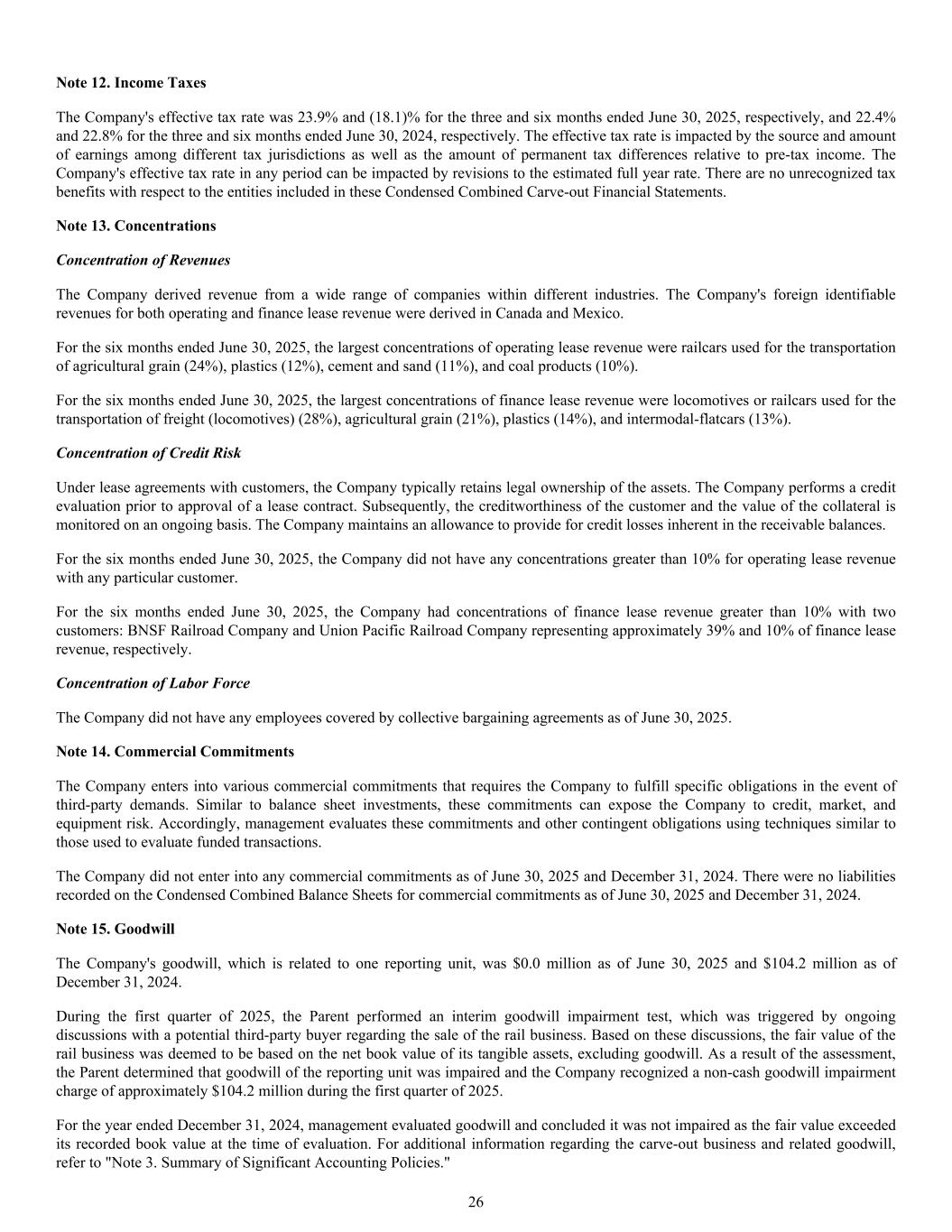 Note 12. Income Taxes The Company's effective tax rate was 23.9% and (18.1)% for the three and six months ended June 30, 2025, respectively, and 22.4% and 22.8% for the three and six months ended June 30, 2024, respectively. The effective tax rate is impacted by the source and amount of earnings among different tax jurisdictions as well as the amount of permanent tax differences relative to pre-tax income. The Company's effective tax rate in any period can be impacted by revisions to the estimated full year rate. There are no unrecognized tax benefits with respect to the entities included in these Condensed Combined Carve-out Financial Statements. Note 13. Concentrations Concentration of Revenues The Company derived revenue from a wide range of companies within different industries. The Company's foreign identifiable revenues for both operating and finance lease revenue were derived in Canada and Mexico. For the six months ended June 30, 2025, the largest concentrations of operating lease revenue were railcars used for the transportation of agricultural grain (24%), plastics (12%), cement and sand (11%), and coal products (10%). For the six months ended June 30, 2025, the largest concentrations of finance lease revenue were locomotives or railcars used for the transportation of freight (locomotives) (28%), agricultural grain (21%), plastics (14%), and intermodal-flatcars (13%). Concentration of Credit Risk Under lease agreements with customers, the Company typically retains legal ownership of the assets. The Company performs a credit evaluation prior to approval of a lease contract. Subsequently, the creditworthiness of the customer and the value of the collateral is monitored on an ongoing basis. The Company maintains an allowance to provide for credit losses inherent in the receivable balances. For the six months ended June 30, 2025, the Company did not have any concentrations greater than 10% for operating lease revenue with any particular customer. For the six months ended June 30, 2025, the Company had concentrations of finance lease revenue greater than 10% with two customers: BNSF Railroad Company and Union Pacific Railroad Company representing approximately 39% and 10% of finance lease revenue, respectively. Concentration of Labor Force The Company did not have any employees covered by collective bargaining agreements as of June 30, 2025. Note 14. Commercial Commitments The Company enters into various commercial commitments that requires the Company to fulfill specific obligations in the event of third-party demands. Similar to balance sheet investments, these commitments can expose the Company to credit, market, and equipment risk. Accordingly, management evaluates these commitments and other contingent obligations using techniques similar to those used to evaluate funded transactions. The Company did not enter into any commercial commitments as of June 30, 2025 and December 31, 2024. There were no liabilities recorded on the Condensed Combined Balance Sheets for commercial commitments as of June 30, 2025 and December 31, 2024. Note 15. Goodwill The Company's goodwill, which is related to one reporting unit, was $0.0 million as of June 30, 2025 and $104.2 million as of December 31, 2024. During the first quarter of 2025, the Parent performed an interim goodwill impairment test, which was triggered by ongoing discussions with a potential third-party buyer regarding the sale of the rail business. Based on these discussions, the fair value of the rail business was deemed to be based on the net book value of its tangible assets, excluding goodwill. As a result of the assessment, the Parent determined that goodwill of the reporting unit was impaired and the Company recognized a non-cash goodwill impairment charge of approximately $104.2 million during the first quarter of 2025. For the year ended December 31, 2024, management evaluated goodwill and concluded it was not impaired as the fair value exceeded its recorded book value at the time of evaluation. For additional information regarding the carve-out business and related goodwill, refer to "Note 3. Summary of Significant Accounting Policies." 26