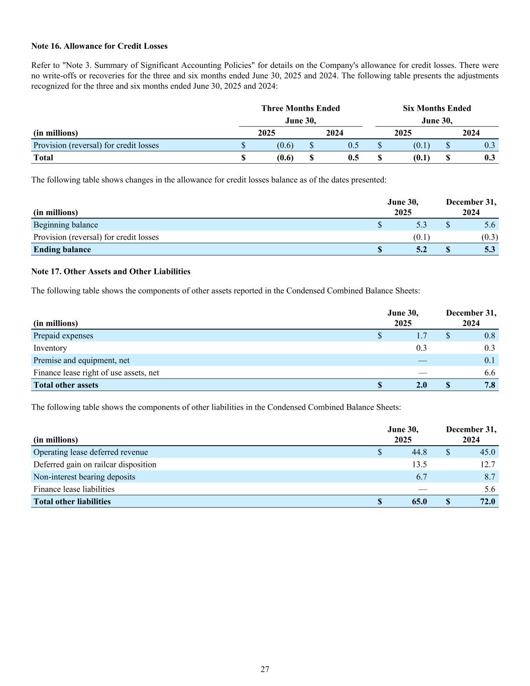 Note 16. Allowance for Credit Losses Refer to "Note 3. Summary of Significant Accounting Policies" for details on the Company's allowance for credit losses. There were no write-offs or recoveries for the three and six months ended June 30, 2025 and 2024. The following table presents the adjustments recognized for the three and six months ended June 30, 2025 and 2024: Three Months Ended Six Months Ended June 30, June 30, (in millions) 2025 2024 2025 2024 Provision (reversal) for credit losses $ (0.6) $ 0.5 $ (0.1) $ 0.3 Total $ (0.6) $ 0.5 $ (0.1) $ 0.3 The following table shows changes in the allowance for credit losses balance as of the dates presented: (in millions) June 30, 2025 December 31, 2024 Beginning balance $ 5.3 $ 5.6 Provision (reversal) for credit losses (0.1) (0.3) Ending balance $ 5.2 $ 5.3 Note 17. Other Assets and Other Liabilities The following table shows the components of other assets reported in the Condensed Combined Balance Sheets: (in millions) June 30, 2025 December 31, 2024 Prepaid expenses $ 1.7 $ 0.8 Inventory 0.3 0.3 Premise and equipment, net — 0.1 Finance lease right of use assets, net — 6.6 Total other assets $ 2.0 $ 7.8 The following table shows the components of other liabilities in the Condensed Combined Balance Sheets: (in millions) June 30, 2025 December 31, 2024 Operating lease deferred revenue $ 44.8 $ 45.0 Deferred gain on railcar disposition 13.5 12.7 Non-interest bearing deposits 6.7 8.7 Finance lease liabilities — 5.6 Total other liabilities $ 65.0 $ 72.0 27