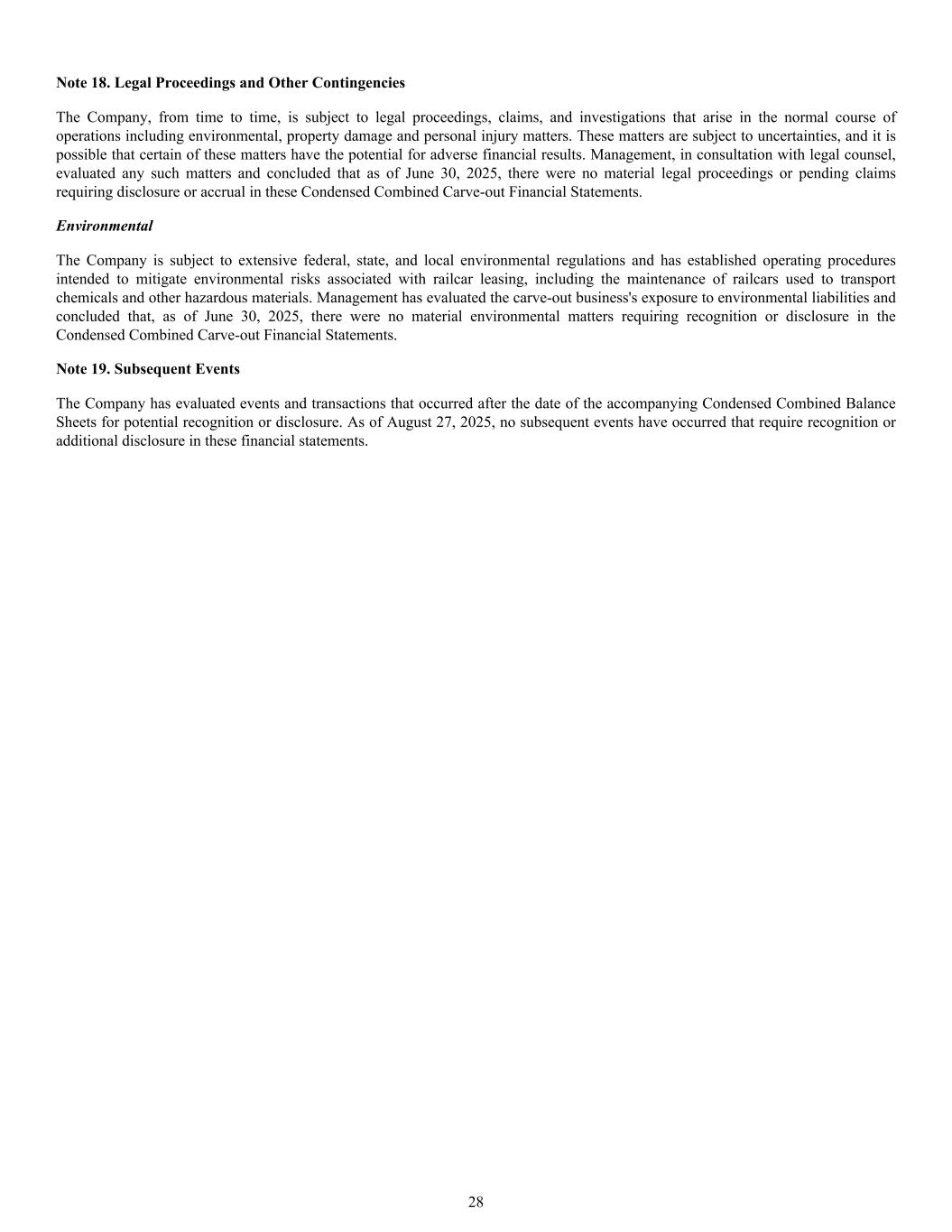 Note 18. Legal Proceedings and Other Contingencies The Company, from time to time, is subject to legal proceedings, claims, and investigations that arise in the normal course of operations including environmental, property damage and personal injury matters. These matters are subject to uncertainties, and it is possible that certain of these matters have the potential for adverse financial results. Management, in consultation with legal counsel, evaluated any such matters and concluded that as of June 30, 2025, there were no material legal proceedings or pending claims requiring disclosure or accrual in these Condensed Combined Carve-out Financial Statements. Environmental The Company is subject to extensive federal, state, and local environmental regulations and has established operating procedures intended to mitigate environmental risks associated with railcar leasing, including the maintenance of railcars used to transport chemicals and other hazardous materials. Management has evaluated the carve-out business's exposure to environmental liabilities and concluded that, as of June 30, 2025, there were no material environmental matters requiring recognition or disclosure in the Condensed Combined Carve-out Financial Statements. Note 19. Subsequent Events The Company has evaluated events and transactions that occurred after the date of the accompanying Condensed Combined Balance Sheets for potential recognition or disclosure. As of August 27, 2025, no subsequent events have occurred that require recognition or additional disclosure in these financial statements. 28