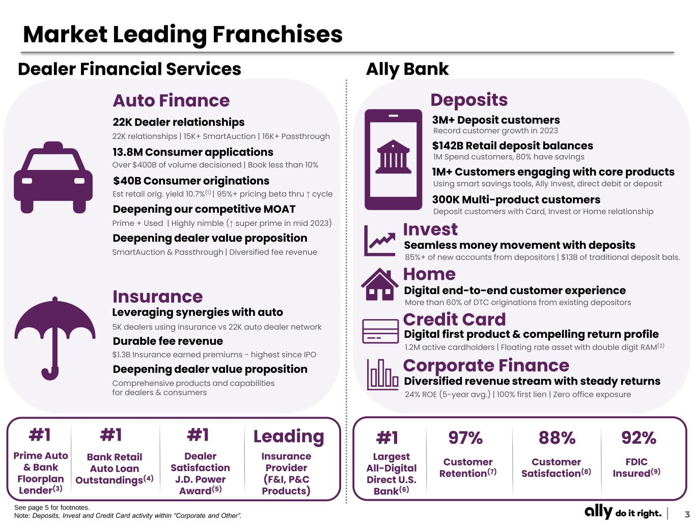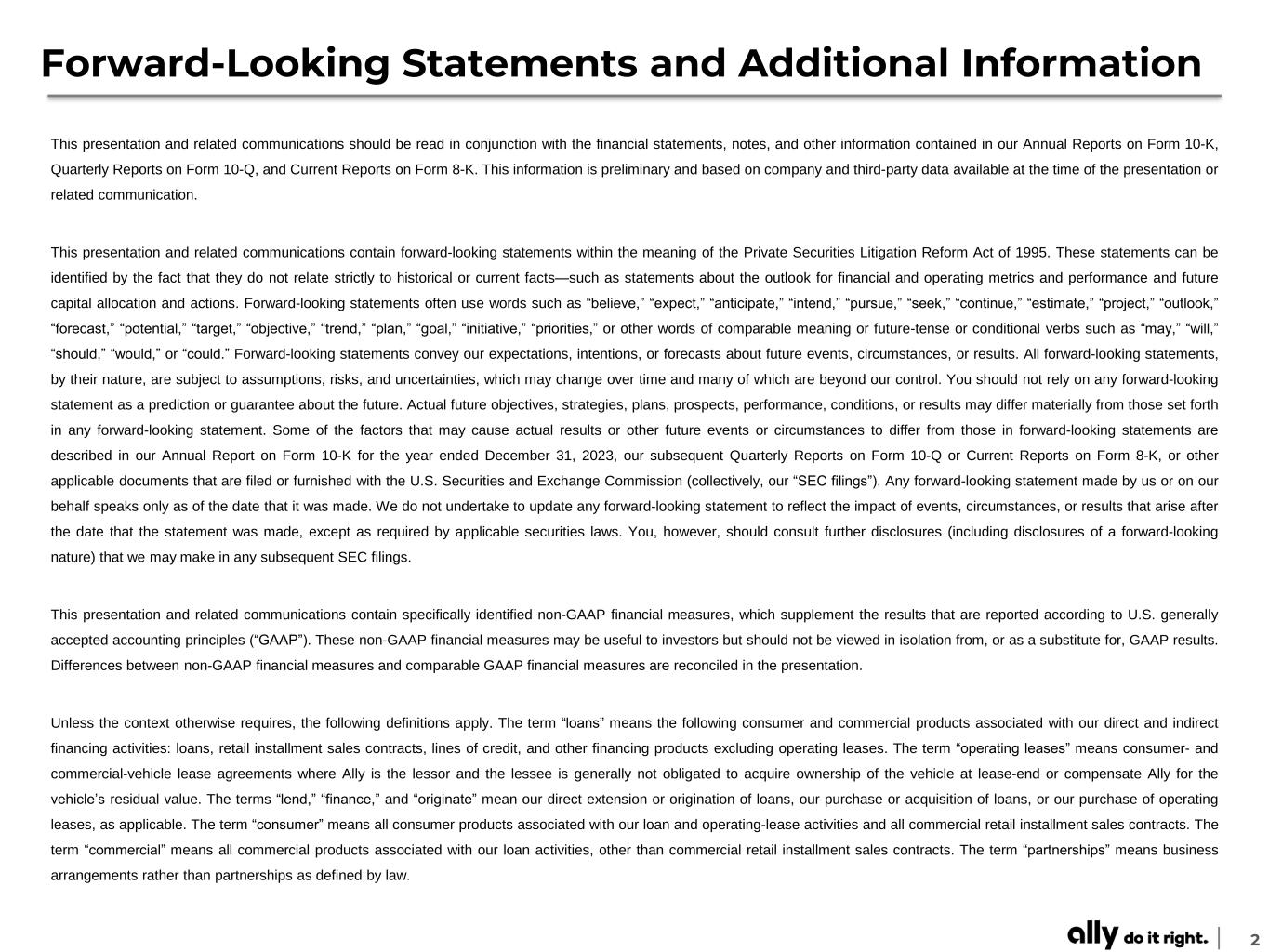 2 Forward-Looking Statements and Additional Information This presentation and related communications should be read in conjunction with the financial statements, notes, and other information contained in our Annual Reports on Form 10-K, Quarterly Reports on Form 10-Q, and Current Reports on Form 8-K. This information is preliminary and based on company and third-party data available at the time of the presentation or related communication. This presentation and related communications contain forward-looking statements within the meaning of the Private Securities Litigation Reform Act of 1995. These statements can be identified by the fact that they do not relate strictly to historical or current facts—such as statements about the outlook for financial and operating metrics and performance and future capital allocation and actions. Forward-looking statements often use words such as “believe,” “expect,” “anticipate,” “intend,” “pursue,” “seek,” “continue,” “estimate,” “project,” “outlook,” “forecast,” “potential,” “target,” “objective,” “trend,” “plan,” “goal,” “initiative,” “priorities,” or other words of comparable meaning or future-tense or conditional verbs such as “may,” “will,” “should,” “would,” or “could.” Forward-looking statements convey our expectations, intentions, or forecasts about future events, circumstances, or results. All forward-looking statements, by their nature, are subject to assumptions, risks, and uncertainties, which may change over time and many of which are beyond our control. You should not rely on any forward-looking statement as a prediction or guarantee about the future. Actual future objectives, strategies, plans, prospects, performance, conditions, or results may differ materially from those set forth in any forward-looking statement. Some of the factors that may cause actual results or other future events or circumstances to differ from those in forward-looking statements are described in our Annual Report on Form 10-K for the year ended December 31, 2023, our subsequent Quarterly Reports on Form 10-Q or Current Reports on Form 8-K, or other applicable documents that are filed or furnished with the U.S. Securities and Exchange Commission (collectively, our “SEC filings”). Any forward-looking statement made by us or on our behalf speaks only as of the date that it was made. We do not undertake to update any forward-looking statement to reflect the impact of events, circumstances, or results that arise after the date that the statement was made, except as required by applicable securities laws. You, however, should consult further disclosures (including disclosures of a forward-looking nature) that we may make in any subsequent SEC filings. This presentation and related communications contain specifically identified non-GAAP financial measures, which supplement the results that are reported according to U.S. generally accepted accounting principles (“GAAP”). These non-GAAP financial measures may be useful to investors but should not be viewed in isolation from, or as a substitute for, GAAP results. Differences between non-GAAP financial measures and comparable GAAP financial measures are reconciled in the presentation. Unless the context otherwise requires, the following definitions apply. The term “loans” means the following consumer and commercial products associated with our direct and indirect financing activities: loans, retail installment sales contracts, lines of credit, and other financing products excluding operating leases. The term “operating leases” means consumer- and commercial-vehicle lease agreements where Ally is the lessor and the lessee is generally not obligated to acquire ownership of the vehicle at lease-end or compensate Ally for the vehicle’s residual value. The terms “lend,” “finance,” and “originate” mean our direct extension or origination of loans, our purchase or acquisition of loans, or our purchase of operating leases, as applicable. The term “consumer” means all consumer products associated with our loan and operating-lease activities and all commercial retail installment sales contracts. The term “commercial” means all commercial products associated with our loan activities, other than commercial retail installment sales contracts. The term “partnerships” means business arrangements rather than partnerships as defined by law.