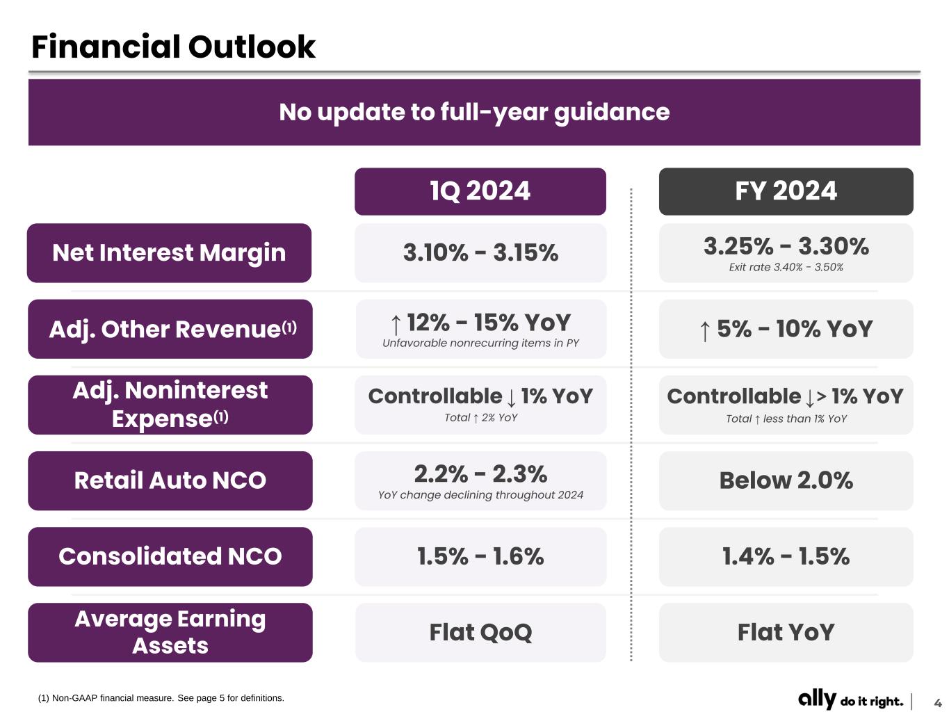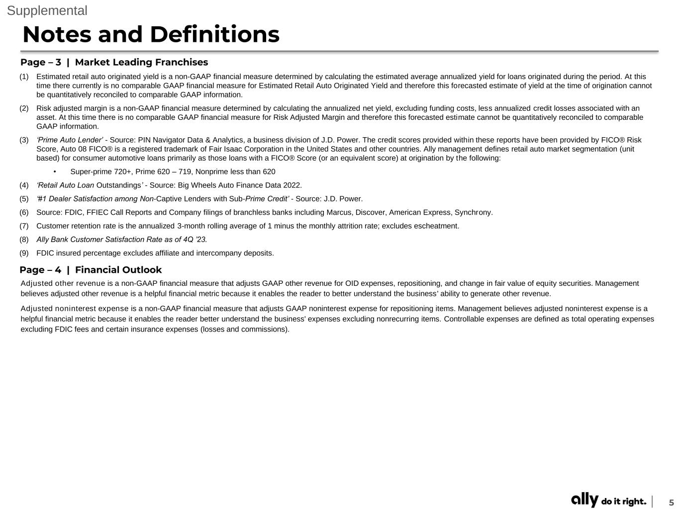 5 Supplemental Notes and Definitions Page – 3 | Market Leading Franchises (1) Estimated retail auto originated yield is a non-GAAP financial measure determined by calculating the estimated average annualized yield for loans originated during the period. At this time there currently is no comparable GAAP financial measure for Estimated Retail Auto Originated Yield and therefore this forecasted estimate of yield at the time of origination cannot be quantitatively reconciled to comparable GAAP information. (2) Risk adjusted margin is a non-GAAP financial measure determined by calculating the annualized net yield, excluding funding costs, less annualized credit losses associated with an asset. At this time there is no comparable GAAP financial measure for Risk Adjusted Margin and therefore this forecasted estimate cannot be quantitatively reconciled to comparable GAAP information. (3) ‘Prime Auto Lender’ - Source: PIN Navigator Data & Analytics, a business division of J.D. Power. The credit scores provided within these reports have been provided by FICO® Risk Score, Auto 08 FICO® is a registered trademark of Fair Isaac Corporation in the United States and other countries. Ally management defines retail auto market segmentation (unit based) for consumer automotive loans primarily as those loans with a FICO® Score (or an equivalent score) at origination by the following: • Super-prime 720+, Prime 620 – 719, Nonprime less than 620 (4) ‘Retail Auto Loan Outstandings’ - Source: Big Wheels Auto Finance Data 2022. (5) ‘#1 Dealer Satisfaction among Non-Captive Lenders with Sub-Prime Credit’ - Source: J.D. Power. (6) Source: FDIC, FFIEC Call Reports and Company filings of branchless banks including Marcus, Discover, American Express, Synchrony. (7) Customer retention rate is the annualized 3-month rolling average of 1 minus the monthly attrition rate; excludes escheatment. (8) Ally Bank Customer Satisfaction Rate as of 4Q ’23. (9) FDIC insured percentage excludes affiliate and intercompany deposits. Page – 4 | Financial Outlook Adjusted other revenue is a non-GAAP financial measure that adjusts GAAP other revenue for OID expenses, repositioning, and change in fair value of equity securities. Management believes adjusted other revenue is a helpful financial metric because it enables the reader to better understand the business' ability to generate other revenue. Adjusted noninterest expense is a non-GAAP financial measure that adjusts GAAP noninterest expense for repositioning items. Management believes adjusted noninterest expense is a helpful financial metric because it enables the reader better understand the business' expenses excluding nonrecurring items. Controllable expenses are defined as total operating expenses excluding FDIC fees and certain insurance expenses (losses and commissions).