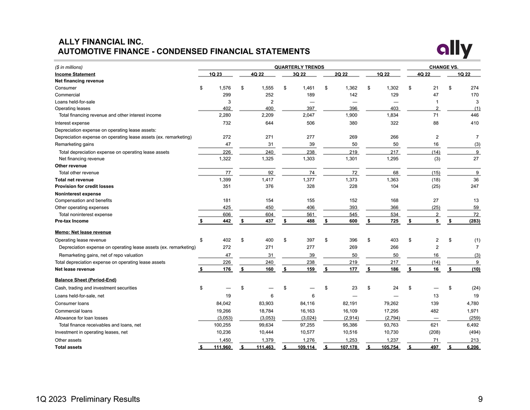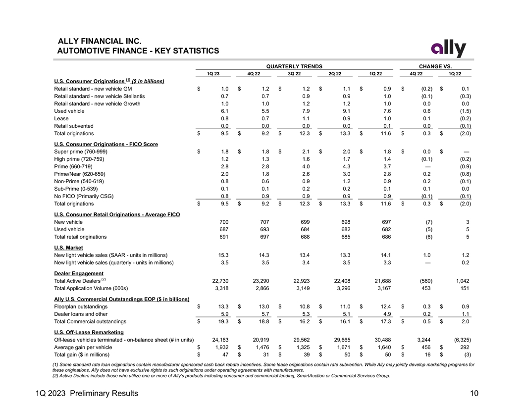 ALLY FINANCIAL INC. AUTOMOTIVE FINANCE - CONDENSED FINANCIAL STATEMENTS ($ in millions) QUARTERLY TRENDS CHANGE VS. Income Statement 1Q 23 4Q 22 3Q 22 2Q 22 1Q 22 4Q 22 1Q 22 Net financing revenue Consumer $ 1,576 $ 1,555 $ 1,461 $ 1,362 $ 1,302 $ 21 $ 274 Commercial 299 252 189 142 129 47 170 Loans held-for-sale 3 2 — — — 1 3 Operating leases 402 400 397 396 403 2 (1) Total financing revenue and other interest income 2,280 2,209 2,047 1,900 1,834 71 446 Interest expense 732 644 506 380 322 88 410 Depreciation expense on operating lease assets: Depreciation expense on operating lease assets (ex. remarketing) 272 271 277 269 266 2 7 Remarketing gains 47 31 39 50 50 16 (3) Total depreciation expense on operating lease assets 226 240 238 219 217 (14) 9 Net financing revenue 1,322 1,325 1,303 1,301 1,295 (3) 27 Other revenue Total other revenue 77 92 74 72 68 (15) 9 Total net revenue 1,399 1,417 1,377 1,373 1,363 (18) 36 Provision for credit losses 351 376 328 228 104 (25) 247 Noninterest expense Compensation and benefits 181 154 155 152 168 27 13 Other operating expenses 425 450 406 393 366 (25) 59 Total noninterest expense 606 604 561 545 534 2 72 Pre-tax Income $ 442 $ 437 $ 488 $ 600 $ 725 $ 5 $ (283) Memo: Net lease revenue Operating lease revenue $ 402 $ 400 $ 397 $ 396 $ 403 $ 2 $ (1) Depreciation expense on operating lease assets (ex. remarketing) 272 271 277 269 266 2 7 Remarketing gains, net of repo valuation 47 31 39 50 50 16 (3) Total depreciation expense on operating lease assets 226 240 238 219 217 (14) 9 Net lease revenue $ 176 $ 160 $ 159 $ 177 $ 186 $ 16 $ (10) Balance Sheet (Period-End) Cash, trading and investment securities $ — $ — $ — $ 23 $ 24 $ — $ (24) Loans held-for-sale, net 19 6 6 — — 13 19 Consumer loans 84,042 83,903 84,116 82,191 79,262 139 4,780 Commercial loans 19,266 18,784 16,163 16,109 17,295 482 1,971 Allowance for loan losses (3,053) (3,053) (3,024) (2,914) (2,794) — (259) Total finance receivables and loans, net 100,255 99,634 97,255 95,386 93,763 621 6,492 Investment in operating leases, net 10,236 10,444 10,577 10,516 10,730 (208) (494) Other assets 1,450 1,379 1,276 1,253 1,237 71 213 Total assets $ 111,960 $ 111,463 $ 109,114 $ 107,178 $ 105,754 $ 497 $ 6,206 1Q 2023 Preliminary Results9