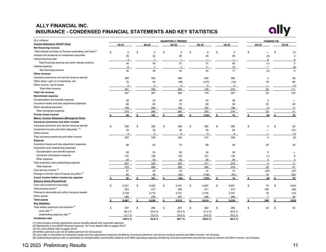 ALLY FINANCIAL INC. INSURANCE - CONDENSED FINANCIAL STATEMENTS AND KEY STATISTICS ($ in millions) QUARTERLY TRENDS CHANGE VS. Income Statement (GAAP View) 1Q 23 4Q 22 3Q 22 2Q 22 1Q 22 4Q 22 1Q 22 Net financing revenue (1) Total interest and fees on finance receivables and loans $ 2 $ 2 $ 2 $ 2 $ 3 $ — $ (1) Interest and dividends on investment securities 29 32 28 29 26 (3) 3 Interest bearing cash 3 1 1 — — 2 3 Total financing revenue and other interest revenue 34 35 31 31 29 (1) 5 Interest expense 8 7 7 11 12 1 (4) Net financing revenue 26 28 24 20 17 (2) 9 Other revenue Insurance premiums and service revenue earned 306 302 289 280 280 4 26 Other (loss) / gain on investments, net 72 54 (56) (127) (14) 18 86 Other income, net of losses 3 3 3 5 4 — (1) Total other revenue 381 359 236 158 270 22 111 Total net revenue 407 387 260 178 287 20 120 Noninterest expense Compensation and benefits expense 28 23 26 24 28 5 — Insurance losses and loss adjustment expenses 88 63 70 89 58 25 30 Other operating expenses 199 200 194 187 188 (1) 11 Total noninterest expense 315 286 290 300 274 29 41 Pre-tax (loss) income $ 92 $ 101 $ (30) $ (122) $ 13 $ (9) $ 79 Memo: Income Statement (Managerial View) Insurance premiums and other income Insurance premiums and service revenue earned $ 306 $ 302 $ 289 $ 280 $ 280 $ 4 $ 26 (2) Investment income and other (adjusted) 33 33 30 29 64 — (31) Other income 3 3 3 5 4 — (1) Total insurance premiums and other income 342 338 322 314 348 4 (6) Expense Insurance losses and loss adjustment expenses 88 63 70 89 58 25 30 Acquisition and underwriting expenses Compensation and benefit expense 28 23 26 24 28 5 — Insurance commission expense 157 158 152 151 149 (1) 8 Other expense 42 42 42 36 39 0 3 Total acquistion and underwriting expense 227 223 220 211 216 4 11 Total expense 315 286 290 300 274 29 41 (2) Core pre-tax income 27 52 32 14 74 (25) (47) (3) Change in the fair value of equity securities 65 49 (62) (136) (61) 16 126 (Loss) income before income tax expense $ 92 $ 101 $ (30) $ (122) $ 13 $ (9) $ 79 Balance Sheet (Period-End) Cash and investment securities $ 5,331 $ 5,252 $ 5,161 $ 5,407 $ 5,651 $ 79 $ (320) (1) Intercompany loans 523 417 390 411 572 106 (49) Premiums receivable and other insurance assets 2,728 2,712 2,731 2,755 2,741 16 (13) Other assets 285 278 251 246 256 7 29 Total assets $ 8,867 $ 8,659 $ 8,533 $ 8,819 $ 9,220 $ 208 $ (353) Key Statistics (4) Total written premiums and revenue $ 307 $ 285 $ 291 $ 262 $ 265 $ 22 $ 42 (5) Loss ratio 28.3 % 2 0.6 % 2 3.9 % 31.2 % 20.5 % (6) Underwriting expense ratio 7 3.7 % 7 3.0 % 74.8 % 7 4.8 % 76.0 % Combined ratio 1 02.0 % 93.6 % 98.7 % 1 06.0 % 9 6.5 % (1) Intercompany activity represents excess liquidity placed with corporate segment. (2) Represents a non-GAAP financial measure. For more details refer to pages 25-27. (3) For more details refer to pages 25-27. (4) Written premiums are net of ceded premium for reinsurance. (5) Loss ratio is calculated as Insurance losses and loss adjustment expenses divided by Insurance premiums and service revenue earned and Other Income, net of losses. (6) Underwriting expense ratio is calculated as Compensation and benefits expense and Other operating expenses divided by Insurance premiums and service revenue earned and Other income, net of losses. 1Q 2023 Preliminary Results11