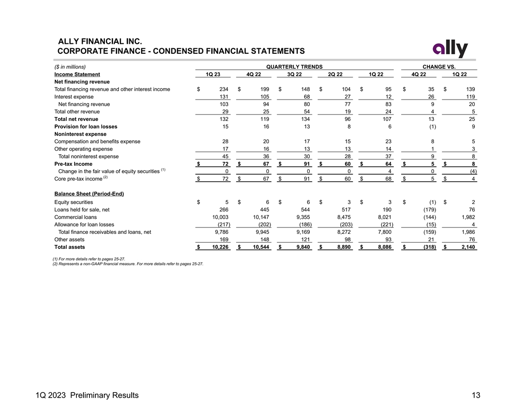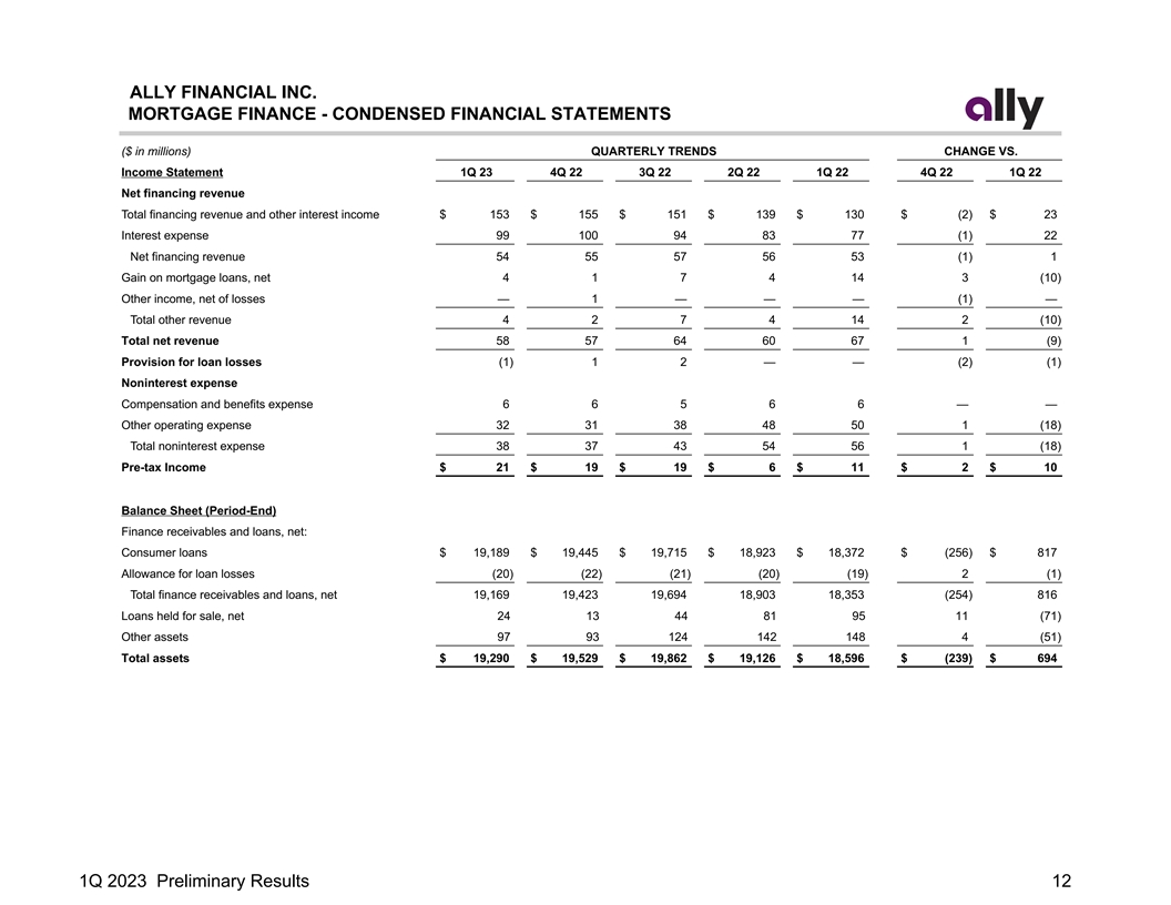 ALLY FINANCIAL INC. MORTGAGE FINANCE - CONDENSED FINANCIAL STATEMENTS ($ in millions) QUARTERLY TRENDS CHANGE VS. Income Statement 1Q 23 4Q 22 3Q 22 2Q 22 1Q 22 4Q 22 1Q 22 Net financing revenue Total financing revenue and other interest income $ 153 $ 155 $ 151 $ 139 $ 130 $ (2) $ 23 Interest expense 99 100 94 83 77 (1) 22 Net financing revenue 54 55 57 56 53 (1) 1 Gain on mortgage loans, net 4 1 7 4 14 3 (10) Other income, net of losses — 1 — — — (1) — Total other revenue 4 2 7 4 14 2 (10) Total net revenue 58 57 64 60 67 1 (9) Provision for loan losses (1) 1 2 — — (2) (1) Noninterest expense Compensation and benefits expense 6 6 5 6 6 — — Other operating expense 32 31 38 48 50 1 (18) Total noninterest expense 38 37 43 54 56 1 (18) Pre-tax Income $ 21 $ 19 $ 19 $ 6 $ 11 $ 2 $ 10 Balance Sheet (Period-End) Finance receivables and loans, net: Consumer loans $ 19,189 $ 19,445 $ 19,715 $ 18,923 $ 18,372 $ (256) $ 817 Allowance for loan losses (20) (22) (21) (20) (19) 2 (1) Total finance receivables and loans, net 19,169 19,423 19,694 18,903 18,353 (254) 816 Loans held for sale, net 24 13 44 81 95 11 (71) Other assets 97 93 124 142 148 4 (51) Total assets $ 19,290 $ 19,529 $ 19,862 $ 19,126 $ 18,596 $ (239) $ 694 1Q 2023 Preliminary Results12
