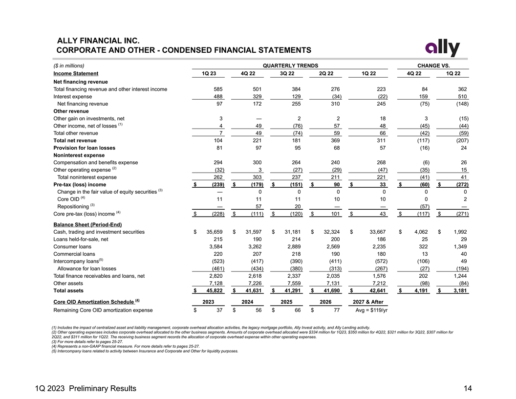 ALLY FINANCIAL INC. CORPORATE FINANCE - CONDENSED FINANCIAL STATEMENTS ($ in millions) QUARTERLY TRENDS CHANGE VS. Income Statement 1Q 23 4Q 22 3Q 22 2Q 22 1Q 22 4Q 22 1Q 22 Net financing revenue Total financing revenue and other interest income $ 234 $ 199 $ 148 $ 104 $ 95 $ 35 $ 139 Interest expense 131 105 68 27 12 26 119 Net financing revenue 103 94 80 77 83 9 20 Total other revenue 29 25 54 19 24 4 5 Total net revenue 132 119 134 96 107 13 25 Provision for loan losses 15 16 13 8 6 (1) 9 Noninterest expense Compensation and benefits expense 28 20 17 15 23 8 5 Other operating expense 17 16 13 13 14 1 3 Total noninterest expense 45 36 30 28 37 9 8 Pre-tax Income $ 72 $ 67 $ 91 $ 60 $ 64 $ 5 $ 8 (1) Change in the fair value of equity securities 0 0 0 0 4 0 (4) (2) Core pre-tax income $ 72 $ 67 $ 91 $ 60 $ 68 $ 5 $ 4 Balance Sheet (Period-End) Equity securities $ 5 $ 6 $ 6 $ 3 $ 3 $ (1) $ 2 Loans held for sale, net 266 445 544 517 190 (179) 76 Commercial loans 10,003 10,147 9,355 8,475 8,021 (144) 1,982 Allowance for loan losses (217) (202) (186) (203) (221) (15) 4 Total finance receivables and loans, net 9,786 9,945 9,169 8,272 7,800 (159) 1,986 Other assets 169 148 121 98 93 21 76 Total assets $ 10,226 $ 10,544 $ 9,840 $ 8,890 $ 8,086 $ (318) $ 2,140 (1) For more details refer to pages 25-27. (2) Represents a non-GAAP financial measure. For more details refer to pages 25-27. 1Q 2023 Preliminary Results13