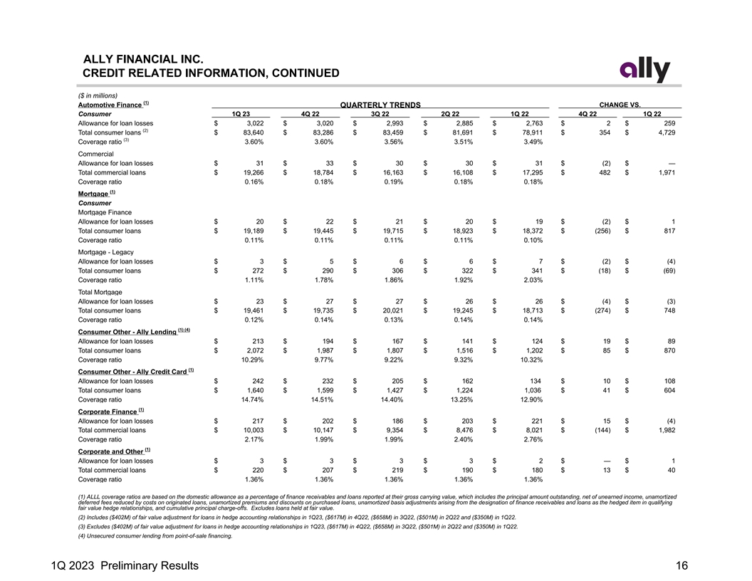 ALLY FINANCIAL INC. CREDIT RELATED INFORMATION $ in millions QUARTERLY TRENDS CHANGE VS. (1) Asset Quality - Consolidated 1Q 23 4Q 22 3Q 22 2Q 22 1Q 22 4Q 22 1Q 22 Ending loan balance $ 136,302 $ 135,745 $ 132,450 $ 128,450 $ 125,358 $ 557 $ 10,944 30+ Accruing DPD $ 2,834 $ 3,128 $ 2,608 $ 2,198 $ 1,684 $ (294) $ 1,150 30+ Accruing DPD % 2.08% 2 .30% 1.97 % 1 .71% 1 .34 % 60+ Accruing DPD $ 707 $ 779 $ 609 $ 491 $ 380 $ (72) $ 327 60+ Accruing DPD % 0 .52% 0.57 % 0 .46 % 0 .38 % 0.30% Non-performing loans (NPLs) $ 1,384 $ 1,454 $ 1,383 $ 1,380 $ 1,388 $ (70) $ (4) Net charge-offs (NCOs) $ 409 $ 390 $ 276 $ 153 $ 133 $ 19 $ 276 (2) Net charge-off rate 1.20% 1.16% 0.85 % 0 .49% 0 .43% Provision for loan losses $ 446 $ 490 $ 438 $ 304 $ 167 $ (44) $ 279 Allowance for loan losses (ALLL) $ 3,751 $ 3,711 $ 3,611 $ 3,450 $ 3,301 $ 40 $ 450 (3) (4) ALLL as % of Loans 2.74 % 2.72 % 2 .71 % 2 .68 % 2 .63 % (3) ALLL as % of NPLs 271% 255 % 2 61 % 250% 238% (3) ALLL as % of NCOs 230% 238% 327 % n/m n/m US Auto Delinquencies - HFI Retail Contract $'s 30+ Delinquent contract $ $ 2,714 $ 2,962 $ 2,442 $ 2,061 $ 1,594 $ (248) $ 1,120 % of retail contract $ outstanding 3 .24 % 3 .56 % 2 .93 % 2 .52 % 2 .02% 60+ Delinquent contract $ $ 666 $ 738 $ 577 $ 470 $ 362 % of retail contract $ outstanding 0.80% 0 .89% 0.69% 0 .57 % 0 .46 % U.S. Auto Annualized Net Charge-Offs - HFI Retail Contract $'s Net charge-offs $ 351 $ 347 $ 217 $ 108 $ 113 $ 4 $ 238 (2) % of avg. HFI assets 1 .68% 1.66 % 1 .05% 0 .54 % 0.58 % U.S. Auto Annualized Net Charge-Offs - HFI Commercial Contract $'s Net charge-offs $ 0 $ 0 $ 0 $ (1) $ (1) $ 0 $ 1 (2) % of avg. HFI assets —% — % — % (0.03)% ( 0.01) % (1) Loans within this table are classified as held-for-investment recorded at amortized cost as these loans are included in our allowance for loan losses. (2) Net charge-off ratios are calculated as annualized net charge-offs divided by average outstanding finance recievables and loans excluding loans measured at fair value, conditional repurchase loans and loans held-for-sale during the year for each loan category. (3) Excludes provision for credit losses related to our reserve for unfunded commitments. (4) ALLL coverage ratios are based on the allowance for loan losses related to loans held-for-investment excluding those loans held at fair value as a percentage of the unpaid principal balance, net of premiums and discounts. 1Q 2023 Preliminary Results15