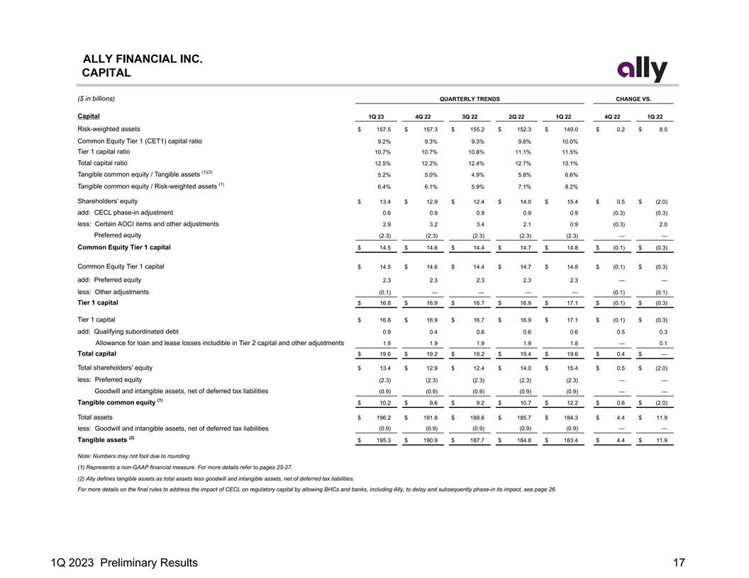 ALLY FINANCIAL INC. CREDIT RELATED INFORMATION, CONTINUED ($ in millions) (1) Automotive Finance CHANGE VS. QUARTERLY TRENDS Consumer 1Q 23 4Q 22 3Q 22 2Q 22 1Q 22 4Q 22 1Q 22 Allowance for loan losses $ 3,022 $ 3,020 $ 2,993 $ 2,885 $ 2,763 $ 2 $ 259 (2) Total consumer loans $ 83,640 $ 83,286 $ 83,459 $ 81,691 $ 78,911 $ 354 $ 4,729 (3) Coverage ratio 3.60 % 3.60 % 3.56% 3 .51 % 3 .49 % Commercial Allowance for loan losses $ 31 $ 33 $ 30 $ 30 $ 31 $ (2) $ — Total commercial loans $ 19,266 $ 18,784 $ 16,163 $ 16,108 $ 17,295 $ 482 $ 1,971 Coverage ratio 0.16% 0.18% 0.19% 0 .18% 0.18 % (1) Mortgage Consumer Mortgage Finance Allowance for loan losses $ 20 $ 22 $ 21 $ 20 $ 19 $ (2) $ 1 Total consumer loans $ 19,189 $ 19,445 $ 19,715 $ 18,923 $ 18,372 $ (256) $ 817 Coverage ratio 0.11 % 0 .11 % 0 .11 % 0 .11 % 0.10% Mortgage - Legacy Allowance for loan losses $ 3 $ 5 $ 6 $ 6 $ 7 $ (2) $ (4) Total consumer loans $ 272 $ 290 $ 306 $ 322 $ 341 $ (18) $ (69) Coverage ratio 1 .11% 1 .78% 1.86 % 1.92% 2.03 % Total Mortgage Allowance for loan losses $ 23 $ 27 $ 27 $ 26 $ 26 $ (4) $ (3) Total consumer loans $ 19,461 $ 19,735 $ 20,021 $ 19,245 $ 18,713 $ (274) $ 748 Coverage ratio 0.12 % 0.14% 0 .13 % 0 .14 % 0 .14% (1) (4) Consumer Other - Ally Lending Allowance for loan losses $ 213 $ 194 $ 167 $ 141 $ 124 $ 19 $ 89 Total consumer loans $ 2,072 $ 1,987 $ 1,807 $ 1,516 $ 1,202 $ 85 $ 870 Coverage ratio 10.29 % 9 .77 % 9 .22% 9 .32 % 10.32 % (1) Consumer Other - Ally Credit Card Allowance for loan losses $ 242 $ 232 $ 205 $ 162 134 $ 10 $ 108 Total consumer loans $ 1,640 $ 1,599 $ 1,427 $ 1,224 1,036 $ 41 $ 604 Coverage ratio 1 4.74% 1 4.51% 1 4.40% 1 3.25% 1 2.90 % (1) Corporate Finance Allowance for loan losses $ 217 $ 202 $ 186 $ 203 $ 221 $ 15 $ (4) Total commercial loans $ 10,003 $ 10,147 $ 9,354 $ 8,476 $ 8,021 $ (144) $ 1,982 Coverage ratio 2 .17% 1.99% 1.99% 2.40% 2 .76% (1) Corporate and Other Allowance for loan losses $ 3 $ 3 $ 3 $ 3 $ 2 $ — $ 1 Total commercial loans $ 220 $ 207 $ 219 $ 190 $ 180 $ 13 $ 40 Coverage ratio 1 .36 % 1 .36 % 1 .36% 1.36 % 1 .36 % (1) ALLL coverage ratios are based on the domestic allowance as a percentage of finance receivables and loans reported at their gross carrying value, which includes the principal amount outstanding, net of unearned income, unamortized deferred fees reduced by costs on originated loans, unamortized premiums and discounts on purchased loans, unamortized basis adjustments arising from the designation of finance receivables and loans as the hedged item in qualifying fair value hedge relationships, and cumulative principal charge-offs. Excludes loans held at fair value. (2) Includes ($402M) of fair value adjustment for loans in hedge accounting relationships in 1Q23, ($617M) in 4Q22, ($658M) in 3Q22, ($501M) in 2Q22 and ($350M) in 1Q22. (3) Excludes ($402M) of fair value adjustment for loans in hedge accounting relationships in 1Q23, ($617M) in 4Q22, ($658M) in 3Q22, ($501M) in 2Q22 and ($350M) in 1Q22. (4) Unsecured consumer lending from point-of-sale financing. 1Q 2023 Preliminary Results16