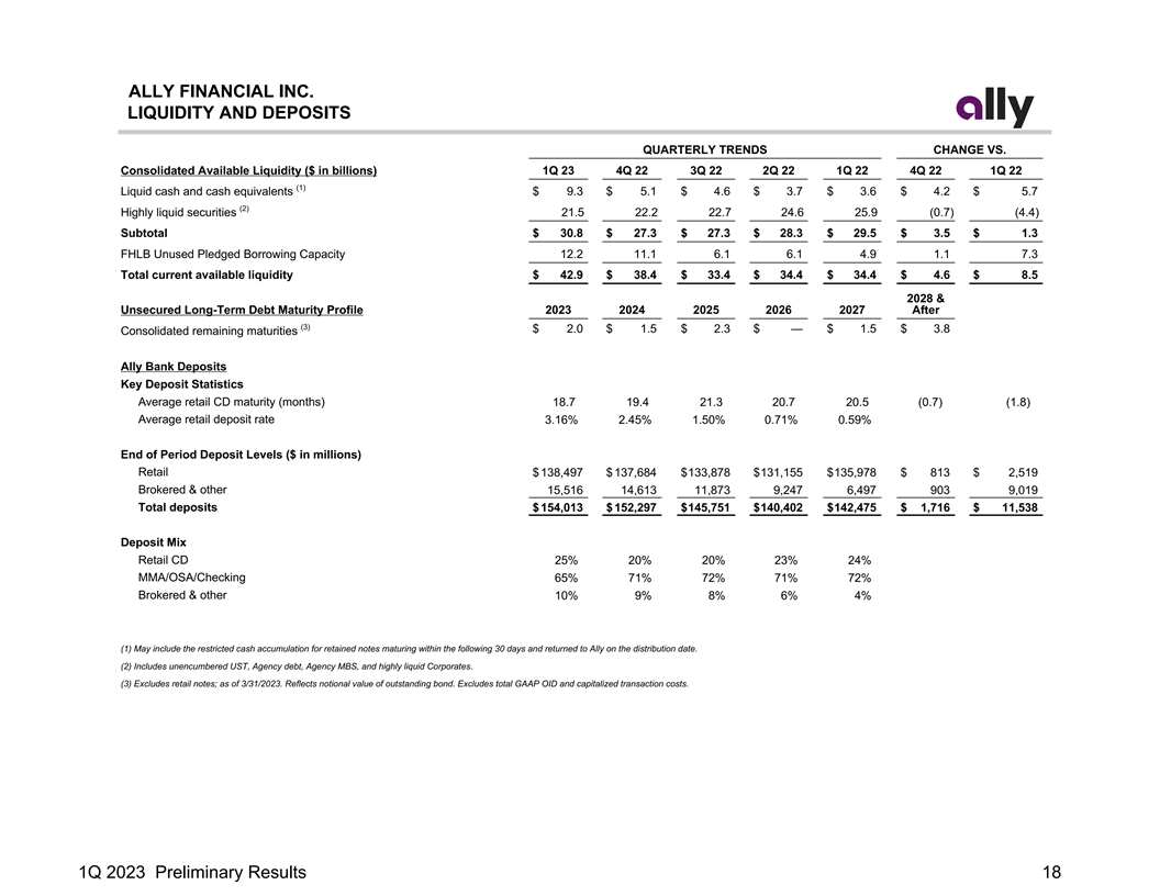 ALLY FINANCIAL INC. CAPITAL ($ in billions) QUARTERLY TRENDS CHANGE VS. Capital 1Q 23 4Q 22 3Q 22 2Q 22 1Q 22 4Q 22 1Q 22 Risk-weighted assets $ 157.5 $ 157.3 $ 155.2 $ 152.3 $ 149.0 $ 0.2 $ 8.5 Common Equity Tier 1 (CET1) capital ratio 9.2 % 9 .3 % 9 .3 % 9.6% 1 0.0 % Tier 1 capital ratio 1 0.7% 10.7% 1 0.8% 1 1.1 % 1 1.5% Total capital ratio 1 2.5 % 1 2.2% 1 2.4 % 1 2.7 % 13.1 % (1)(2) Tangible common equity / Tangible assets 5.2 % 5 .0% 4.9% 5 .8 % 6 .6% (1) Tangible common equity / Risk-weighted assets 6 .4 % 6.1% 5.9 % 7.1 % 8.2% Shareholders’ equity $ 13.4 $ 12.9 $ 12.4 $ 14.0 $ 15.4 $ 0.5 $ (2.0) add: CECL phase-in adjustment 0.6 0.9 0.9 0.9 0.9 (0.3) (0.3) less: Certain AOCI items and other adjustments 2.9 3.2 3.4 2.1 0.9 (0.3) 2.0 Preferred equity (2.3) (2.3) (2.3) (2.3) (2.3) — — Common Equity Tier 1 capital $ 14.5 $ 14.6 $ 14.4 $ 14.7 $ 14.8 $ (0.1) $ (0.3) Common Equity Tier 1 capital $ 14.5 $ 14.6 $ 14.4 $ 14.7 $ 14.8 $ (0.1) $ (0.3) add: Preferred equity 2.3 2.3 2.3 2.3 2.3 — — less: Other adjustments (0.1) — — — — (0.1) (0.1) Tier 1 capital $ 16.8 $ 16.9 $ 16.7 $ 16.9 $ 17.1 $ (0.1) $ (0.3) Tier 1 capital $ 16.8 $ 16.9 $ 16.7 $ 16.9 $ 17.1 $ (0.1) $ (0.3) add: Qualifying subordinated debt 0.9 0.4 0.6 0.6 0.6 0.5 0.3 Allowance for loan and lease losses includible in Tier 2 capital and other adjustments 1.9 1.9 1.9 1.9 1.8 — 0.1 Total capital $ 19.6 $ 19.2 $ 19.2 $ 19.4 $ 19.6 $ 0.4 $ — Total shareholders' equity $ 13.4 $ 12.9 $ 12.4 $ 14.0 $ 15.4 $ 0.5 $ (2.0) less: Preferred equity (2.3) (2.3) (2.3) (2.3) (2.3) — — Goodwill and intangible assets, net of deferred tax liabilities (0.9) (0.9) (0.9) (0.9) (0.9) — — (1) Tangible common equity $ 10.2 $ 9.6 $ 9.2 $ 10.7 $ 12.2 $ 0.6 $ (2.0) Total assets $ 196.2 $ 191.8 $ 188.6 $ 185.7 $ 184.3 $ 4.4 $ 11.9 less: Goodwill and intangible assets, net of deferred tax liabilities (0.9) (0.9) (0.9) (0.9) (0.9) — — (2) Tangible assets $ 195.3 $ 190.9 $ 187.7 $ 184.8 $ 183.4 $ 4.4 $ 11.9 Note: Numbers may not foot due to rounding (1) Represents a non-GAAP financial measure. For more details refer to pages 25-27. (2) Ally defines tangible assets as total assets less goodwill and intangible assets, net of deferred tax liabilities. For more details on the final rules to address the impact of CECL on regulatory capital by allowing BHCs and banks, including Ally, to delay and subsequently phase-in its impact, see page 26. 1Q 2023 Preliminary Results17