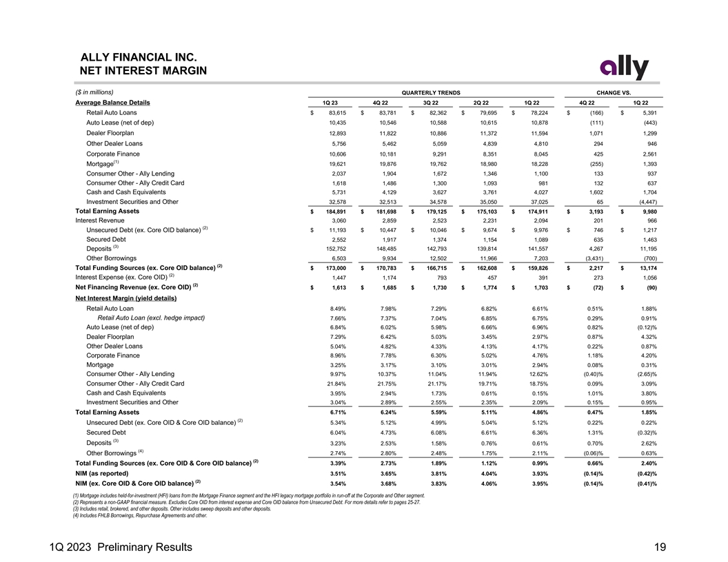 ALLY FINANCIAL INC. LIQUIDITY AND DEPOSITS QUARTERLY TRENDS CHANGE VS. Consolidated Available Liquidity ($ in billions) 1Q 23 4Q 22 3Q 22 2Q 22 1Q 22 4Q 22 1Q 22 (1) Liquid cash and cash equivalents $ 9.3 $ 5.1 $ 4.6 $ 3.7 $ 3.6 $ 4.2 $ 5.7 (2) Highly liquid securities 21.5 22.2 22.7 24.6 25.9 (0.7) (4.4) Subtotal $ 30.8 $ 27.3 $ 27.3 $ 28.3 $ 29.5 $ 3.5 $ 1.3 FHLB Unused Pledged Borrowing Capacity 12.2 11.1 6.1 6.1 4.9 1.1 7.3 Total current available liquidity $ 42.9 $ 38.4 $ 33.4 $ 34.4 $ 34.4 $ 4.6 $ 8.5 2028 & Unsecured Long-Term Debt Maturity Profile 2023 2024 2025 2026 2027 After (3) $ 2.0 $ 1.5 $ 2.3 $ — $ 1.5 $ 3.8 Consolidated remaining maturities Ally Bank Deposits Key Deposit Statistics Average retail CD maturity (months) 18.7 19.4 21.3 20.7 20.5 (0.7) (1.8) Average retail deposit rate 3 .16% 2 .45 % 1.50% 0 .71% 0 .59 % End of Period Deposit Levels ($ in millions) Retail $ 138,497 $ 137,684 $ 133,878 $ 131,155 $ 135,978 $ 813 $ 2,519 Brokered & other 15,516 14,613 11,873 9,247 6,497 903 9,019 Total deposits $ 154,013 $ 152,297 $ 145,751 $ 140,402 $ 142,475 $ 1,716 $ 11,538 Deposit Mix Retail CD 2 5 % 20 % 20 % 2 3 % 24 % MMA/OSA/Checking 65% 71% 7 2% 7 1% 72% Brokered & other 1 0% 9% 8% 6% 4% (1) May include the restricted cash accumulation for retained notes maturing within the following 30 days and returned to Ally on the distribution date. (2) Includes unencumbered UST, Agency debt, Agency MBS, and highly liquid Corporates. (3) Excludes retail notes; as of 3/31/2023. Reflects notional value of outstanding bond. Excludes total GAAP OID and capitalized transaction costs. 1Q 2023 Preliminary Results18