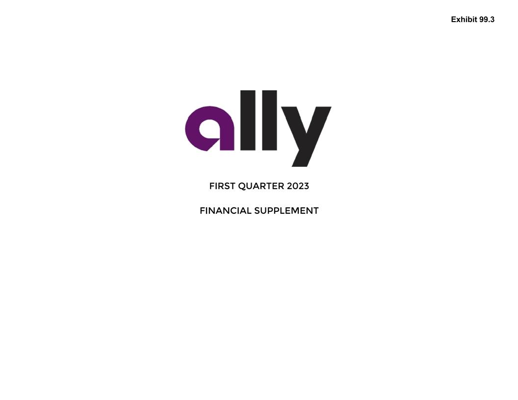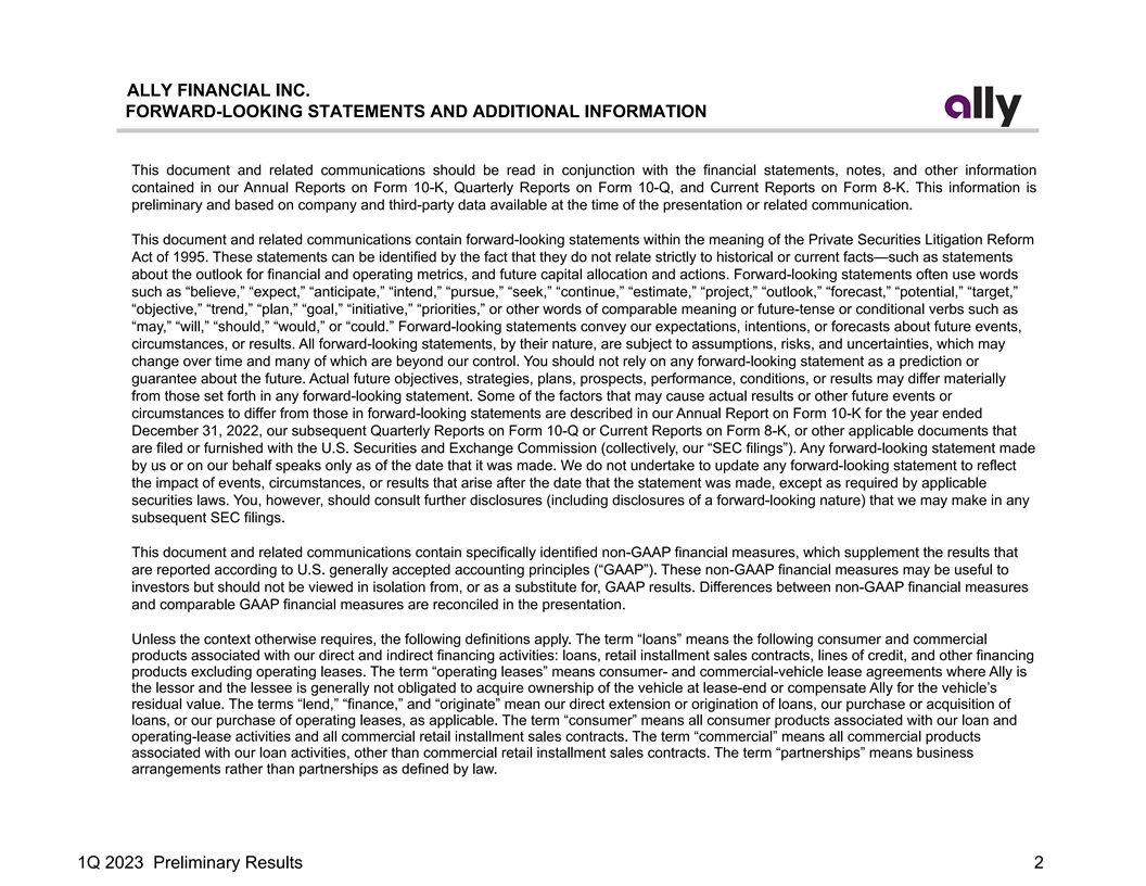 ALLY FINANCIAL INC. FORWARD-LOOKING STATEMENTS AND ADDITIONAL INFORMATION This document and related communications should be read in conjunction with the financial statements, notes, and other information contained in our Annual Reports on Form 10-K, Quarterly Reports on Form 10-Q, and Current Reports on Form 8-K. This information is preliminary and based on company and third-party data available at the time of the presentation or related communication. This document and related communications contain forward-looking statements within the meaning of the Private Securities Litigation Reform Act of 1995. These statements can be identified by the fact that they do not relate strictly to historical or current facts—such as statements about the outlook for financial and operating metrics, and future capital allocation and actions. Forward-looking statements often use words such as “believe,” “expect,” “anticipate,” “intend,” “pursue,” “seek,” “continue,” “estimate,” “project,” “outlook,” “forecast,” “potential,” “target,” “objective,” “trend,” “plan,” “goal,” “initiative,” “priorities,” or other words of comparable meaning or future-tense or conditional verbs such as “may,” “will,” “should,” “would,” or “could.” Forward-looking statements convey our expectations, intentions, or forecasts about future events, circumstances, or results. All forward-looking statements, by their nature, are subject to assumptions, risks, and uncertainties, which may change over time and many of which are beyond our control. You should not rely on any forward-looking statement as a prediction or guarantee about the future. Actual future objectives, strategies, plans, prospects, performance, conditions, or results may differ materially from those set forth in any forward-looking statement. Some of the factors that may cause actual results or other future events or circumstances to differ from those in forward-looking statements are described in our Annual Report on Form 10-K for the year ended December 31, 2022, our subsequent Quarterly Reports on Form 10-Q or Current Reports on Form 8-K, or other applicable documents that are filed or furnished with the U.S. Securities and Exchange Commission (collectively, our “SEC filings”). Any forward-looking statement made by us or on our behalf speaks only as of the date that it was made. We do not undertake to update any forward-looking statement to reflect the impact of events, circumstances, or results that arise after the date that the statement was made, except as required by applicable securities laws. You, however, should consult further disclosures (including disclosures of a forward-looking nature) that we may make in any subsequent SEC filings. This document and related communications contain specifically identified non-GAAP financial measures, which supplement the results that are reported according to U.S. generally accepted accounting principles (“GAAP”). These non-GAAP financial measures may be useful to investors but should not be viewed in isolation from, or as a substitute for, GAAP results. Differences between non-GAAP financial measures and comparable GAAP financial measures are reconciled in the presentation. Unless the context otherwise requires, the following definitions apply. The term “loans” means the following consumer and commercial products associated with our direct and indirect financing activities: loans, retail installment sales contracts, lines of credit, and other financing products excluding operating leases. The term “operating leases” means consumer- and commercial-vehicle lease agreements where Ally is the lessor and the lessee is generally not obligated to acquire ownership of the vehicle at lease-end or compensate Ally for the vehicle’s residual value. The terms “lend,” “finance,” and “originate” mean our direct extension or origination of loans, our purchase or acquisition of loans, or our purchase of operating leases, as applicable. The term “consumer” means all consumer products associated with our loan and operating-lease activities and all commercial retail installment sales contracts. The term “commercial” means all commercial products associated with our loan activities, other than commercial retail installment sales contracts. The term “partnerships” means business arrangements rather than partnerships as defined by law. 1Q 2023 Preliminary Results2