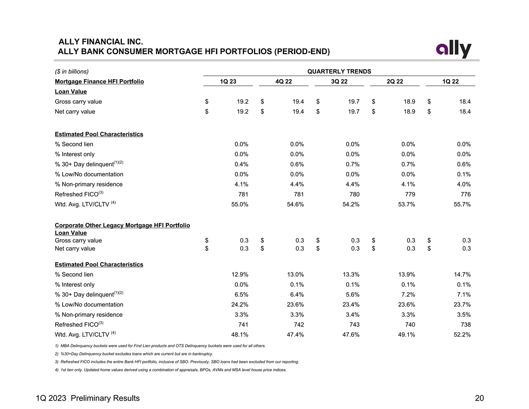 ALLY FINANCIAL INC. NET INTEREST MARGIN ($ in millions) QUARTERLY TRENDS CHANGE VS. Average Balance Details 1Q 23 4Q 22 3Q 22 2Q 22 1Q 22 4Q 22 1Q 22 Retail Auto Loans $ 83,615 $ 83,781 $ 82,362 $ 79,695 $ 78,224 $ (166) $ 5,391 Auto Lease (net of dep) 10,435 10,546 10,588 10,615 10,878 (111) (443) Dealer Floorplan 12,893 11,822 10,886 11,372 11,594 1,071 1,299 Other Dealer Loans 5,756 5,462 5,059 4,839 4,810 294 946 Corporate Finance 10,606 10,181 9,291 8,351 8,045 425 2,561 (1) Mortgage 19,621 19,876 19,762 18,980 18,228 (255) 1,393 2,037 1,904 1,672 1,346 1,100 133 937 Consumer Other - Ally Lending Consumer Other - Ally Credit Card 1,618 1,486 1,300 1,093 981 132 637 Cash and Cash Equivalents 5,731 4,129 3,627 3,761 4,027 1,602 1,704 Investment Securities and Other 32,578 32,513 34,578 35,050 37,025 65 (4,447) Total Earning Assets $ 184,891 $ 181,698 $ 179,125 $ 175,103 $ 174,911 $ 3,193 $ 9,980 3,060 2,859 2,523 2,231 2,094 201 966 Interest Revenue (2) Unsecured Debt (ex. Core OID balance) $ 11,193 $ 10,447 $ 10,046 $ 9,674 $ 9,976 $ 746 $ 1,217 Secured Debt 2,552 1,917 1,374 1,154 1,089 635 1,463 (3) Deposits 152,752 148,485 142,793 139,814 141,557 4,267 11,195 Other Borrowings 6,503 9,934 12,502 11,966 7,203 (3,431) (700) (2) Total Funding Sources (ex. Core OID balance) $ 173,000 $ 170,783 $ 166,715 $ 162,608 $ 159,826 $ 2,217 $ 13,174 (2) Interest Expense (ex. Core OID) 1,447 1,174 793 457 391 273 1,056 (2) Net Financing Revenue (ex. Core OID) $ 1,613 $ 1,685 $ 1,730 $ 1,774 $ 1,703 $ (72) $ (90) Net Interest Margin (yield details) 8 .49% 7.98 % 7 .29% 6 .82% 6.61% 0 .51% 1.88 % Retail Auto Loan Retail Auto Loan (excl. hedge impact) 7 .66% 7 .37 % 7 .04 % 6 .85 % 6.75 % 0.29% 0.91% Auto Lease (net of dep) 6 .84 % 6 .02% 5 .98% 6 .66 % 6.96 % 0 .82 % ( 0.12)% Dealer Floorplan 7.29% 6.42% 5 .03 % 3.45 % 2.97% 0 .87% 4.32 % Other Dealer Loans 5 .04% 4.82% 4 .33 % 4 .13 % 4 .17% 0.22 % 0 .87 % 8.96 % 7.78 % 6.30 % 5 .02% 4 .76 % 1 .18% 4 .20 % Corporate Finance Mortgage 3 .25 % 3.17 % 3.10 % 3.01% 2 .94 % 0 .08 % 0.31 % Consumer Other - Ally Lending 9 .97% 10.37% 1 1.04% 1 1.94% 1 2.62% (0.40) % (2.65)% Consumer Other - Ally Credit Card 21.84% 2 1.75 % 2 1.17% 1 9.71% 1 8.75 % 0.09 % 3 .09% Cash and Cash Equivalents 3.95% 2.94 % 1 .73 % 0.61% 0 .15% 1 .01% 3 .80 % 3 .04% 2.89% 2.55% 2.35% 2.09 % 0 .15 % 0 .95% Investment Securities and Other Total Earning Assets 6.71% 6 .24% 5 .59 % 5.11% 4.86% 0.47% 1 .85% (2) Unsecured Debt (ex. Core OID & Core OID balance) 5.34 % 5.12 % 4.99% 5 .04 % 5 .12 % 0.22 % 0 .22% 6 .04% 4.73 % 6.08 % 6 .61% 6.36% 1.31 % ( 0.32) % Secured Debt (3) Deposits 3 .23% 2.53% 1 .58 % 0 .76% 0.61 % 0 .70% 2.62% (4) Other Borrowings 2 .74 % 2.80 % 2 .48 % 1 .75% 2.11 % ( 0.06) % 0.63% (2) Total Funding Sources (ex. Core OID & Core OID balance) 3 .39% 2.73% 1.89% 1 .12% 0.99 % 0.66% 2.40% NIM (as reported) 3 .51 % 3.65 % 3.81% 4 .04% 3 .93 % ( 0.14) % (0.42)% (2) NIM (ex. Core OID & Core OID balance) 3.54% 3.68% 3.83% 4.06 % 3 .95 % ( 0.14)% (0.41) % (1) Mortgage includes held-for-investment (HFI) loans from the Mortgage Finance segment and the HFI legacy mortgage portfolio in run-off at the Corporate and Other segment. (2) Represents a non-GAAP financial measure. Excludes Core OID from interest expense and Core OID balance from Unsecured Debt. For more details refer to pages 25-27. (3) Includes retail, brokered, and other deposits. Other includes sweep deposits and other deposits. (4) Includes FHLB Borrowings, Repurchase Agreements and other. 1Q 2023 Preliminary Results19