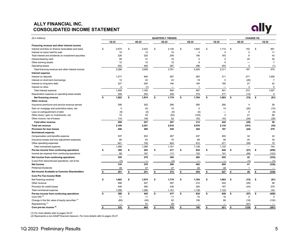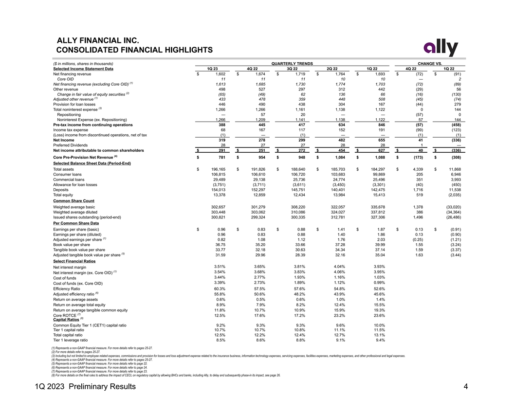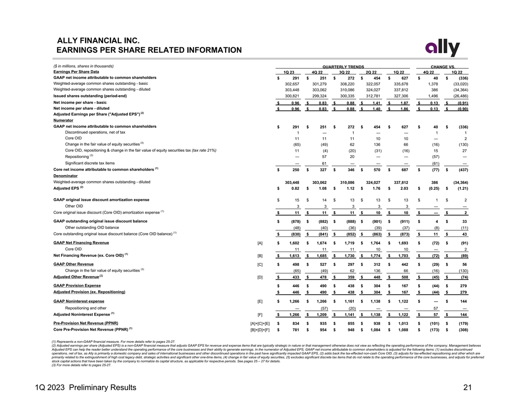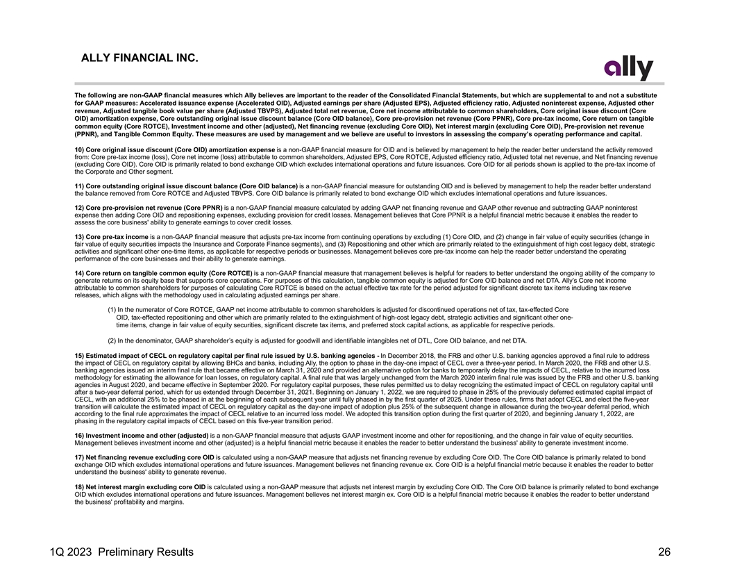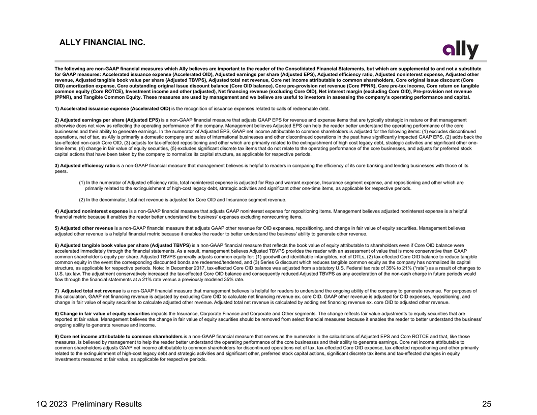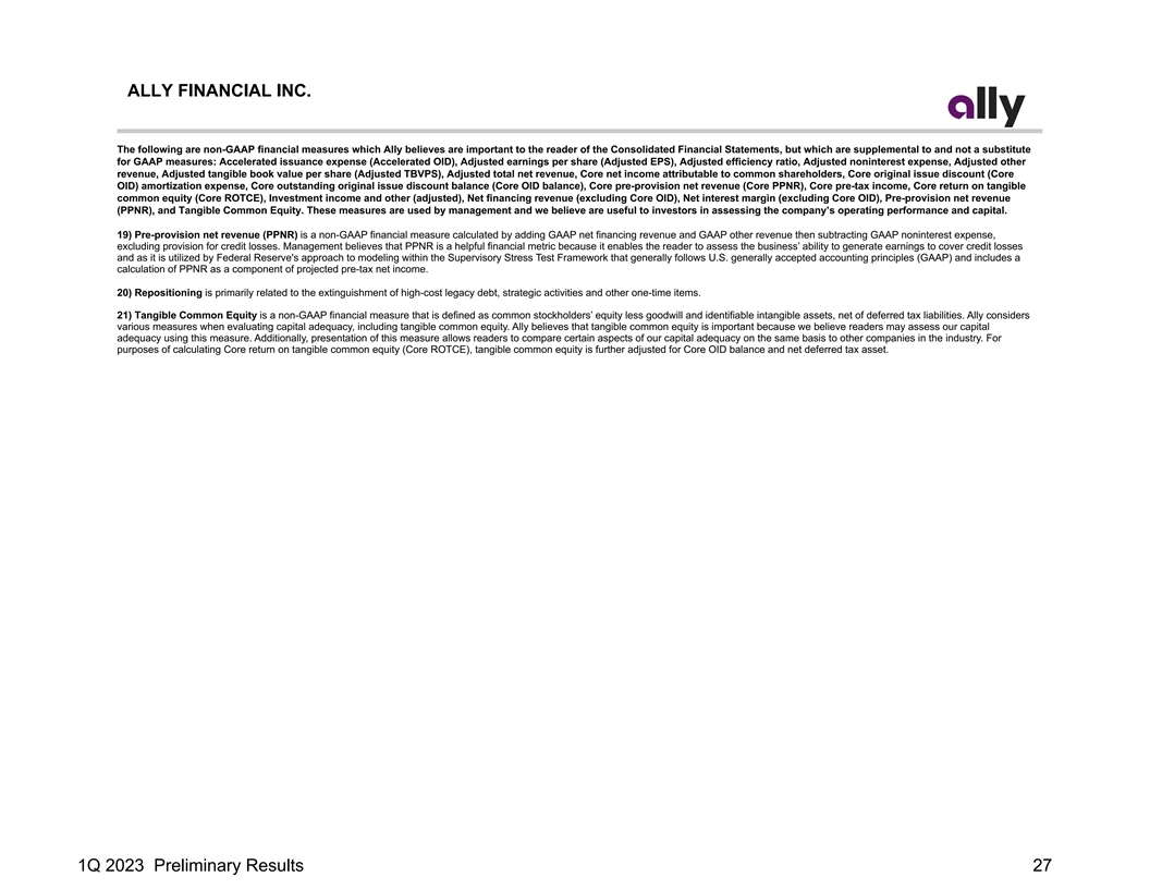 ALLY FINANCIAL INC. The following are non-GAAP financial measures which Ally believes are important to the reader of the Consolidated Financial Statements, but which are supplemental to and not a substitute for GAAP measures: Accelerated issuance expense (Accelerated OID), Adjusted earnings per share (Adjusted EPS), Adjusted efficiency ratio, Adjusted noninterest expense, Adjusted other revenue, Adjusted tangible book value per share (Adjusted TBVPS), Adjusted total net revenue, Core net income attributable to common shareholders, Core original issue discount (Core OID) amortization expense, Core outstanding original issue discount balance (Core OID balance), Core pre-provision net revenue (Core PPNR), Core pre-tax income, Core return on tangible common equity (Core ROTCE), Investment income and other (adjusted), Net financing revenue (excluding Core OID), Net interest margin (excluding Core OID), Pre-provision net revenue (PPNR), and Tangible Common Equity. These measures are used by management and we believe are useful to investors in assessing the company’s operating performance and capital. 19) Pre-provision net revenue (PPNR) is a non-GAAP financial measure calculated by adding GAAP net financing revenue and GAAP other revenue then subtracting GAAP noninterest expense, excluding provision for credit losses. Management believes that PPNR is a helpful financial metric because it enables the reader to assess the business’ ability to generate earnings to cover credit losses and as it is utilized by Federal Reserve's approach to modeling within the Supervisory Stress Test Framework that generally follows U.S. generally accepted accounting principles (GAAP) and includes a calculation of PPNR as a component of projected pre-tax net income. 20) Repositioning is primarily related to the extinguishment of high-cost legacy debt, strategic activities and other one-time items. 21) Tangible Common Equity is a non-GAAP financial measure that is defined as common stockholders’ equity less goodwill and identifiable intangible assets, net of deferred tax liabilities. Ally considers various measures when evaluating capital adequacy, including tangible common equity. Ally believes that tangible common equity is important because we believe readers may assess our capital adequacy using this measure. Additionally, presentation of this measure allows readers to compare certain aspects of our capital adequacy on the same basis to other companies in the industry. For purposes of calculating Core return on tangible common equity (Core ROTCE), tangible common equity is further adjusted for Core OID balance and net deferred tax asset. 1Q 2023 Preliminary Results27