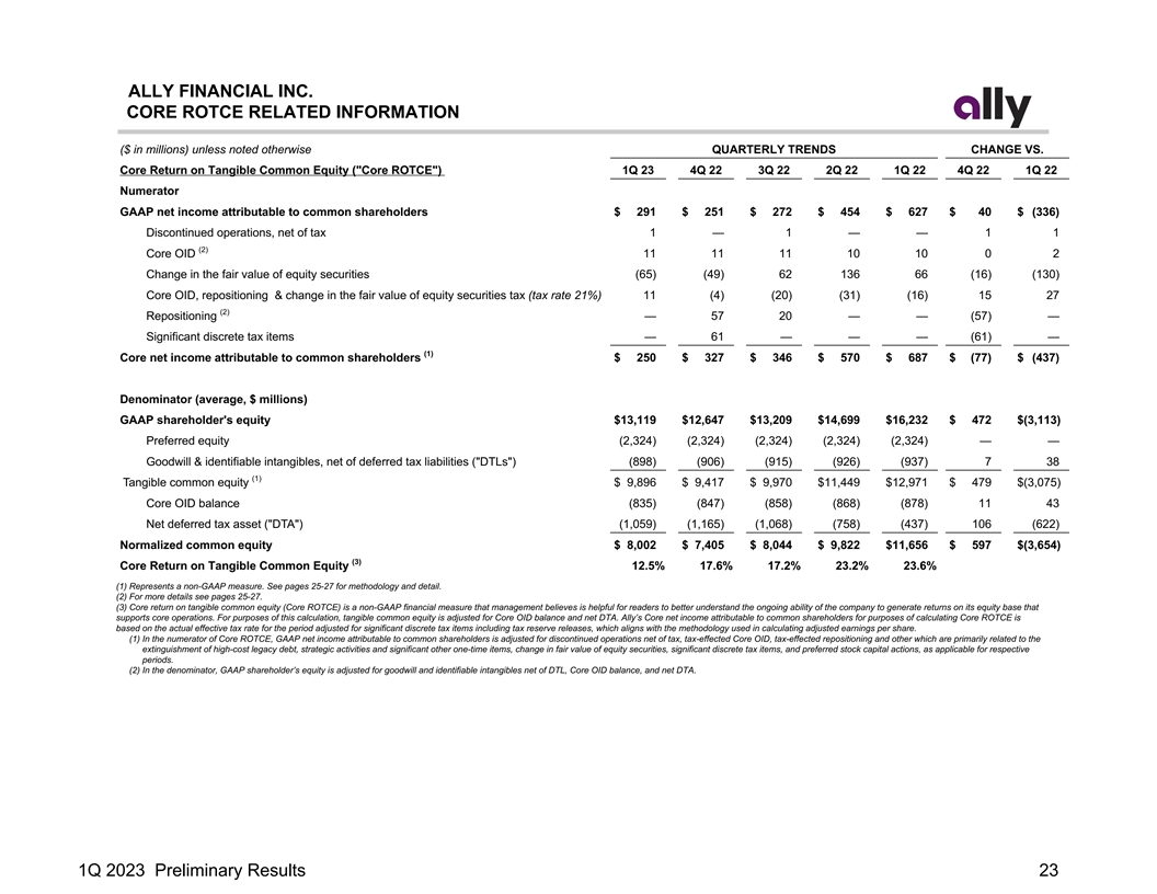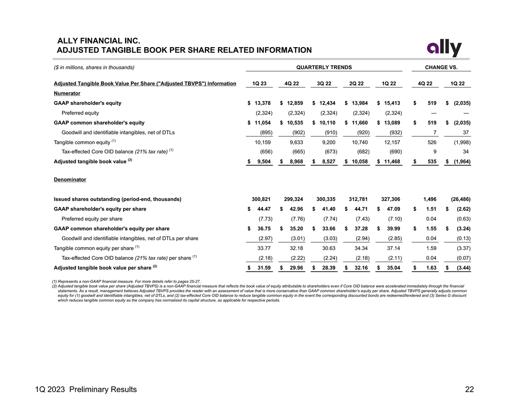 ALLY FINANCIAL INC. ADJUSTED TANGIBLE BOOK PER SHARE RELATED INFORMATION ($ in millions, shares in thousands) QUARTERLY TRENDS CHANGE VS. Adjusted Tangible Book Value Per Share ( Adjusted TBVPS ) Information 1Q 23 4Q 22 3Q 22 2Q 22 1Q 22 4Q 22 1Q 22 Numerator GAAP shareholder's equity $ 13,378 $ 12,859 $ 12,434 $ 13,984 $ 15,413 $ 519 $ (2,035) Preferred equity (2,324) (2,324) (2,324) (2,324) (2,324) — — GAAP common shareholder's equity $ 11,054 $ 10,535 $ 10,110 $ 11,660 $ 13,089 $ 519 $ (2,035) Goodwill and identifiable intangibles, net of DTLs (895) (902) (910) (920) (932) 7 37 (1) Tangible common equity 10,159 9,633 9,200 10,740 12,157 526 (1,998) (1) Tax-effected Core OID balance (21% tax rate) (656) (665) (673) (682) (690) 9 34 (2) Adjusted tangible book value $ 9,504 $ 8,968 $ 8,527 $ 10,058 $ 11,468 $ 535 $ (1,964) Denominator Issued shares outstanding (period-end, thousands) 300,821 299,324 300,335 312,781 327,306 1,496 (26,486) GAAP shareholder's equity per share $ 44.47 $ 42.96 $ 41.40 $ 44.71 $ 47.09 $ 1.51 $ (2.62) Preferred equity per share (7.73) (7.76) (7.74) (7.43) (7.10) 0.04 (0.63) GAAP common shareholder's equity per share $ 36.75 $ 35.20 $ 33.66 $ 37.28 $ 39.99 $ 1.55 $ (3.24) Goodwill and identifiable intangibles, net of DTLs per share (2.97) (3.01) (3.03) (2.94) (2.85) 0.04 (0.13) (1) Tangible common equity per share 33.77 32.18 30.63 34.34 37.14 1.59 (3.37) (1) Tax-effected Core OID balance (21% tax rate) per share (2.18) (2.22) (2.24) (2.18) (2.11) 0.04 (0.07) (2) Adjusted tangible book value per share $ 31.59 $ 29.96 $ 28.39 $ 32.16 $ 35.04 $ 1.63 $ (3.44) (1) Represents a non-GAAP financial measure. For more details refer to pages 25-27. (2) Adjusted tangible book value per share (Adjusted TBVPS) is a non-GAAP financial measure that reflects the book value of equity attributable to shareholders even if Core OID balance were accelerated immediately through the financial statements. As a result, management believes Adjusted TBVPS provides the reader with an assessment of value that is more conservative than GAAP common shareholder’s equity per share. Adjusted TBVPS generally adjusts common equity for (1) goodwill and identifiable intangibles, net of DTLs, and (2) tax-effected Core OID balance to reduce tangible common equity in the event the corresponding discounted bonds are redeemed/tendered and (3) Series G discount which reduces tangible common equity as the company has normalized its capital structure, as applicable for respective periods. 1Q 2023 Preliminary Results22
