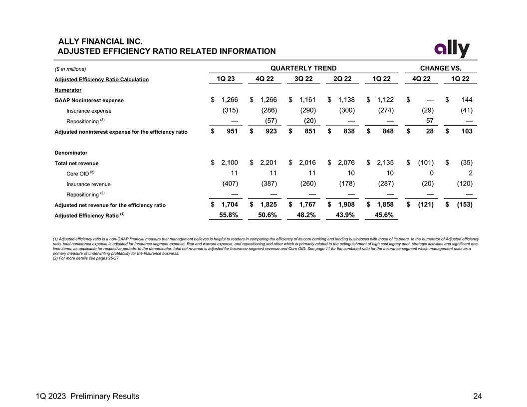ALLY FINANCIAL INC. CORE ROTCE RELATED INFORMATION ($ in millions) unless noted otherwise QUARTERLY TRENDS CHANGE VS. Core Return on Tangible Common Equity ( Core ROTCE ) 1Q 23 4Q 22 3Q 22 2Q 22 1Q 22 4Q 22 1Q 22 Numerator GAAP net income attributable to common shareholders $ 291 $ 251 $ 272 $ 454 $ 627 $ 40 $ (336) Discontinued operations, net of tax 1 — 1 — — 1 1 (2) Core OID 11 11 11 10 10 0 2 Change in the fair value of equity securities (65) (49) 62 136 66 (16) (130) Core OID, repositioning & change in the fair value of equity securities tax (tax rate 21%) 11 (4) (20) (31) (16) 15 27 (2) Repositioning — 57 20 — — (57) — Significant discrete tax items — 61 — — — (61) — (1) Core net income attributable to common shareholders $ 250 $ 327 $ 346 $ 570 $ 687 $ (77) $ (437) Denominator (average, $ millions) GAAP shareholder's equity $ 13,119 $ 12,647 $ 13,209 $ 14,699 $ 16,232 $ 472 $( 3,113) Preferred equity (2,324) (2,324) (2,324) (2,324) (2,324) — — Goodwill & identifiable intangibles, net of deferred tax liabilities ( DTLs ) (898) (906) (915) (926) (937) 7 38 (1) Tangible common equity $ 9,896 $ 9,417 $ 9,970 $ 11,449 $ 12,971 $ 479 $ (3,075) Core OID balance (835) (847) (858) (868) (878) 11 43 Net deferred tax asset ( DTA ) (1,059) (1,165) (1,068) (758) (437) 106 (622) Normalized common equity $ 8,002 $ 7,405 $ 8,044 $ 9,822 $ 11,656 $ 597 $ (3,654) (3) Core Return on Tangible Common Equity 1 2.5% 17.6% 17.2% 2 3.2 % 23.6 % (1) Represents a non-GAAP measure. See pages 25-27 for methodology and detail. (2) For more details see pages 25-27. (3) Core return on tangible common equity (Core ROTCE) is a non-GAAP financial measure that management believes is helpful for readers to better understand the ongoing ability of the company to generate returns on its equity base that supports core operations. For purposes of this calculation, tangible common equity is adjusted for Core OID balance and net DTA. Ally’s Core net income attributable to common shareholders for purposes of calculating Core ROTCE is based on the actual effective tax rate for the period adjusted for significant discrete tax items including tax reserve releases, which aligns with the methodology used in calculating adjusted earnings per share. (1) In the numerator of Core ROTCE, GAAP net income attributable to common shareholders is adjusted for discontinued operations net of tax, tax-effected Core OID, tax-effected repositioning and other which are primarily related to the extinguishment of high-cost legacy debt, strategic activities and significant other one-time items, change in fair value of equity securities, significant discrete tax items, and preferred stock capital actions, as applicable for respective periods. (2) In the denominator, GAAP shareholder’s equity is adjusted for goodwill and identifiable intangibles net of DTL, Core OID balance, and net DTA. 1Q 2023 Preliminary Results23