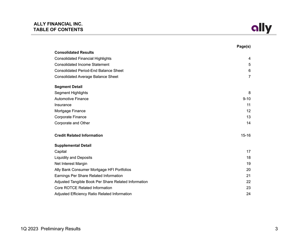 ALLY FINANCIAL INC. TABLE OF CONTENTS Page(s) Consolidated Results Consolidated Financial Highlights 4 Consolidated Income Statement 5 Consolidated Period-End Balance Sheet 6 Consolidated Average Balance Sheet 7 Segment Detail Segment Highlights 8 Automotive Finance 9-10 Insurance 11 Mortgage Finance 12 Corporate Finance 13 Corporate and Other 14 Credit Related Information 15-16 Supplemental Detail Capital 17 Liquidity and Deposits 18 Net Interest Margin 19 Ally Bank Consumer Mortgage HFI Portfolios 20 Earnings Per Share Related Information 21 Adjusted Tangible Book Per Share Related Information 22 Core ROTCE Related Information 23 Adjusted Efficiency Ratio Related Information 24 1Q 2023 Preliminary Results3