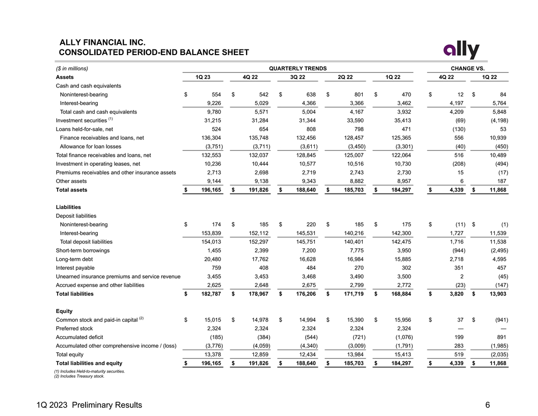 ALLY FINANCIAL INC. CONSOLIDATED INCOME STATEMENT ($ in millions) QUARTERLY TRENDS CHANGE VS. 1Q 23 4Q 22 3Q 22 2Q 22 1Q 22 4Q 22 1Q 22 Financing revenue and other interest income Interest and fees on finance receivables and loans $ 2,575 $ 2,423 $ 2,120 $ 1,842 $ 1,714 $ 152 $ 861 Interest on loans held-for-sale 15 13 10 4 4 2 11 Total interest and dividends on investment securities 226 220 206 195 183 6 43 Interest-bearing cash 56 31 16 5 2 25 54 Other earning assets 12 12 12 8 5 — 7 Operating leases 402 400 397 396 403 2 (1) Total financing revenue and other interest income 3,286 3,099 2,761 2,450 2,311 187 975 Interest expense Interest on deposits 1,217 946 567 263 211 271 1,006 Interest on short-term borrowings 12 40 43 19 5 (28) 7 Interest on long-term debt 227 200 194 184 185 27 42 Interest on other 2 (1) — 1 — 3 2 Total interest expense 1,458 1,185 804 467 401 273 1,057 Depreciation expense on operating lease assets 226 240 238 219 217 (14) 9 Net financing revenue $ 1,602 $ 1,674 $ 1,719 $ 1,764 $ 1,693 $ (72) $ (91) Other revenue Insurance premiums and service revenue earned 306 302 289 280 280 4 26 Gain on mortgage and automotive loans, net 4 24 10 4 14 (20) (10) Loss on extinguishment of debt (0) (0) (0) (0) — 0 (0) Other (loss) / gain on investments, net 74 53 (54) (124) 5 21 69 Other income, net of losses 114 148 52 152 143 (34) (29) Total other revenue 498 527 297 312 442 (29) 56 Total net revenue 2,100 2,201 2,016 2,076 2,135 (101) (35) Provision for loan losses 446 490 438 304 167 (44) 279 Noninterest expense Compensation and benefits expense 537 503 467 437 493 34 44 Insurance losses and loss adjustment expenses 88 63 70 89 58 25 30 Other operating expenses 641 700 624 612 571 (59) 70 Total noninterest expense 1,266 1,266 1,161 1,138 1,122 — 144 Pre-tax income from continuing operations $ 388 $ 445 $ 417 $ 634 $ 846 $ (57) $ (458) Income tax expense from continuing operations 68 167 117 152 191 (99) (123) Net income from continuing operations 320 278 300 482 655 42 (335) (Loss) from discontinued operations, net of tax (1) — (1) — — (1) (1) Net income 319 278 299 482 655 41 (336) Preferred Dividends 28 27 27 28 28 1 — Net Income Available to Common Shareholders $ 291 $ 251 $ 272 $ 454 $ 627 $ 40 $ (336) Core Pre-Tax Income Walk Net financing revenue $ 1,602 $ 1,674 $ 1,719 $ 1,764 $ 1,693 $ (72) $ (91) Other revenue 498 527 297 312 442 (29) 56 Provision for credit losses 446 490 438 304 167 (44) 279 Total noninterest expense 1,266 1,266 1,161 1,138 1,122 — 144 Pre-tax income from continuing operations $ 388 $ 445 $ 417 $ 634 $ 846 $ (57) $ (458) (2) Core OID 11 11 11 10 10 0 2 (1) Change in the fair value of equity securities (65) (49) 62 136 66 (16) (130) (1) Repositioning — 57 20 — — (57) — (2) Core pre-tax income $ 335 $ 464 $ 510 $ 780 $ 921 $ (129) $ (587) (1) For more details refer to pages 25-27. (2) Represents a non-GAAP financial measure. For more details refer to pages 25-27. 1Q 2023 Preliminary Results5