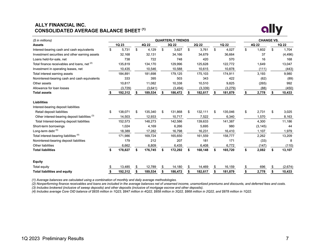 ALLY FINANCIAL INC. CONSOLIDATED PERIOD-END BALANCE SHEET ($ in millions) QUARTERLY TRENDS CHANGE VS. Assets 1Q 23 4Q 22 3Q 22 2Q 22 1Q 22 4Q 22 1Q 22 Cash and cash equivalents Noninterest-bearing $ 554 $ 542 $ 638 $ 801 $ 470 $ 12 $ 84 Interest-bearing 9,226 5,029 4,366 3,366 3,462 4,197 5,764 Total cash and cash equivalents 9,780 5,571 5,004 4,167 3,932 4,209 5,848 (1) Investment securities 31,215 31,284 31,344 33,590 35,413 (69) (4,198) Loans held-for-sale, net 524 654 808 798 471 (130) 53 Finance receivables and loans, net 136,304 135,748 132,456 128,457 125,365 556 10,939 Allowance for loan losses (3,751) (3,711) (3,611) (3,450) (3,301) (40) (450) Total finance receivables and loans, net 132,553 132,037 128,845 125,007 122,064 516 10,489 Investment in operating leases, net 10,236 10,444 10,577 10,516 10,730 (208) (494) Premiums receivables and other insurance assets 2,713 2,698 2,719 2,743 2,730 15 (17) Other assets 9,144 9,138 9,343 8,882 8,957 6 187 Total assets $ 196,165 $ 191,826 $ 188,640 $ 185,703 $ 184,297 $ 4,339 $ 11,868 Liabilities Deposit liabilities Noninterest-bearing $ 174 $ 185 $ 220 $ 185 $ 175 $ (11) $ (1) Interest-bearing 153,839 152,112 145,531 140,216 142,300 1,727 11,539 Total deposit liabilities 154,013 152,297 145,751 140,401 142,475 1,716 11,538 Short-term borrowings 1,455 2,399 7,200 7,775 3,950 (944) (2,495) Long-term debt 20,480 17,762 16,628 16,984 15,885 2,718 4,595 Interest payable 759 408 484 270 302 351 457 Unearned insurance premiums and service revenue 3,455 3,453 3,468 3,490 3,500 2 (45) Accrued expense and other liabilities 2,625 2,648 2,675 2,799 2,772 (23) (147) Total liabilities $ 182,787 $ 178,967 $ 176,206 $ 171,719 $ 168,884 $ 3,820 $ 13,903 Equity (2) Common stock and paid-in capital $ 15,015 $ 14,978 $ 14,994 $ 15,390 $ 15,956 $ 37 $ (941) Preferred stock 2,324 2,324 2,324 2,324 2,324 — — Accumulated deficit (185) (384) (544) (721) (1,076) 199 891 Accumulated other comprehensive income / (loss) (3,776) (4,059) (4,340) (3,009) (1,791) 283 (1,985) Total equity 13,378 12,859 12,434 13,984 15,413 519 (2,035) Total liabilities and equity $ 196,165 $ 191,826 $ 188,640 $ 185,703 $ 184,297 $ 4,339 $ 11,868 (1) Includes Held-to-maturity securities. (2) Includes Treasury stock. 1Q 2023 Preliminary Results6