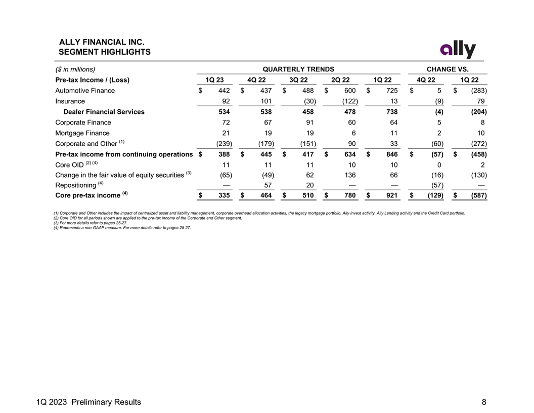 ALLY FINANCIAL INC. (1) CONSOLIDATED AVERAGE BALANCE SHEET ($ in millions) QUARTERLY TRENDS CHANGE VS. Assets 1Q 23 4Q 22 3Q 22 2Q 22 1Q 22 4Q 22 1Q 22 Interest-bearing cash and cash equivalents $ 5,731 $ 4,129 $ 3,627 $ 3,761 $ 4,027 $ 1,602 $ 1,704 Investment securities and other earning assets 32,168 32,131 34,166 34,679 36,664 37 (4,496) Loans held-for-sale, net 738 722 748 420 570 16 168 (2) Total finance receivables and loans, net 135,819 134,170 129,996 125,628 122,772 1,649 13,047 Investment in operating leases, net 10,435 10,546 10,588 10,615 10,878 (111) (443) Total interest earning assets 184,891 181,698 179,125 175,103 174,911 3,193 9,980 Noninterest-bearing cash and cash equivalents 333 395 503 343 422 (62) (89) Other assets 10,817 11,082 10,338 10,510 9,825 (265) 992 Allowance for loan losses (3,729) (3,641) (3,494) (3,339) (3,279) (88) (450) Total assets $ 192,312 $ 189,534 $ 186,472 $ 182,617 $ 181,879 $ 2,778 $ 10,433 Liabilities Interest-bearing deposit liabilities Retail deposit liabilities $ 138,071 $ 135,340 $ 131,868 $ 132,111 $ 135,046 $ 2,731 $ 3,025 (3) Other interest-bearing deposit liabilities 14,503 12,933 10,717 7,522 6,340 1,570 8,163 Total Interest-bearing deposit liabilities 152,573 148,273 142,586 139,633 141,387 4,300 11,186 Short-term borrowings 1,024 4,169 6,266 5,695 980 (3,145) 44 (4) Long-term debt 18,389 17,282 16,798 16,231 16,410 1,107 1,979 (4) Total interest-bearing liabilities 171,986 169,724 165,650 161,559 158,777 2,262 13,209 Noninterest-bearing deposit liabilities 179 212 207 181 171 (33) 8 Other liabilities 6,662 6,809 6,435 6,408 6,772 (147) (110) Total liabilities $ 178,827 $ 176,745 $ 172,292 $ 168,148 $ 165,720 $ 2,082 $ 13,107 Equity Total equity $ 13,485 $ 12,789 $ 14,180 $ 14,469 $ 16,159 $ 696 $ (2,674) Total liabilities and equity $ 192,312 $ 189,534 $ 186,472 $ 182,617 $ 181,879 $ 2,778 $ 10,433 (1) Average balances are calculated using a combination of monthly and daily average methodologies. (2) Nonperforming finance receivables and loans are included in the average balances net of unearned income, unamortized premiums and discounts, and deferred fees and costs. (3) Includes brokered (inclusive of sweep deposits) and other deposits (inclusive of mortgage escrow and other deposits). (4) Includes average Core OID balance of $835 million in 1Q23, $847 million in 4Q22, $858 million in 3Q22, $868 million in 2Q22, and $878 million in 1Q22. 1Q 2023 Preliminary Results7