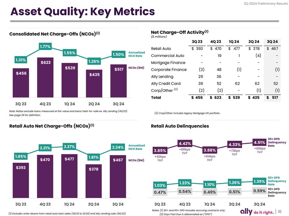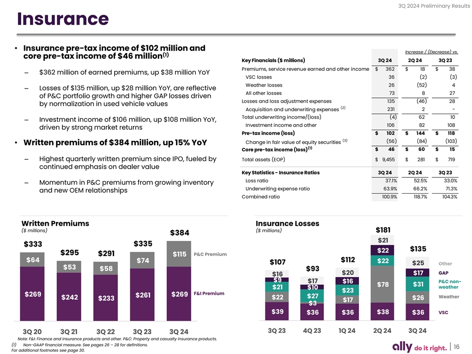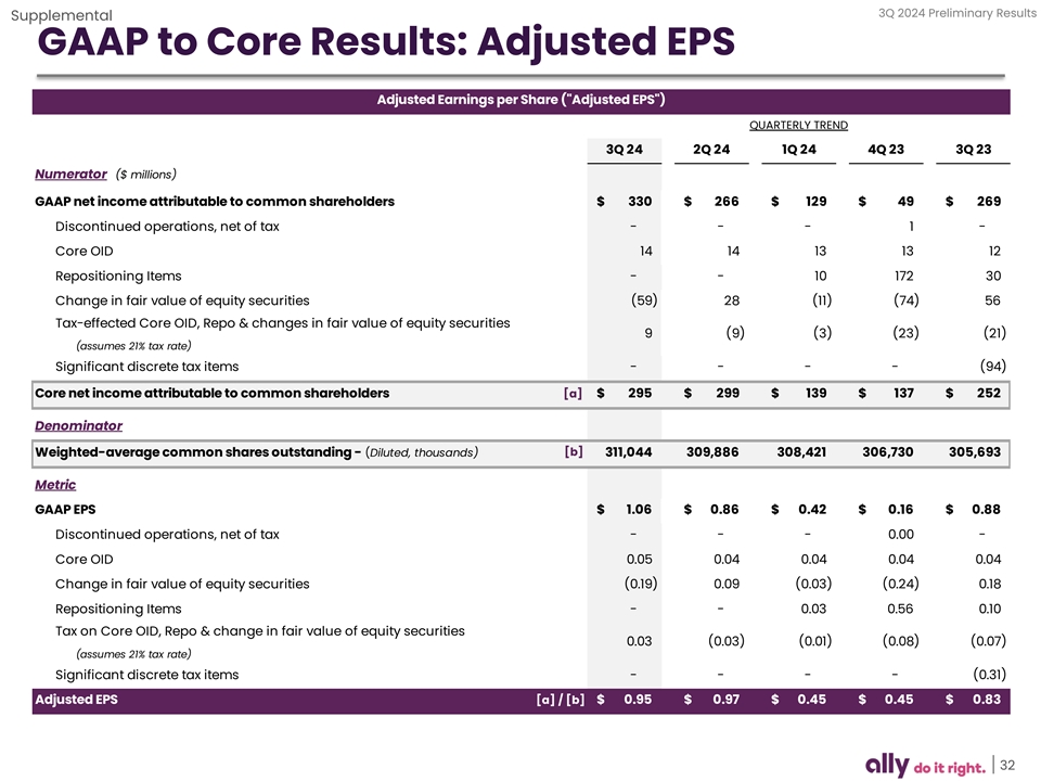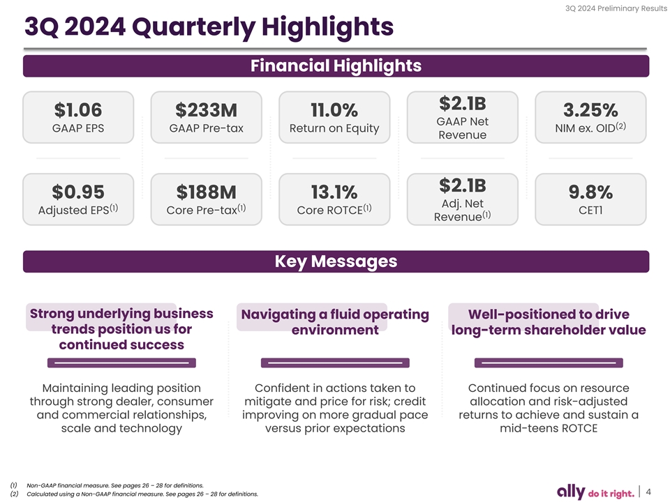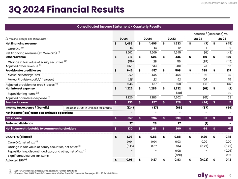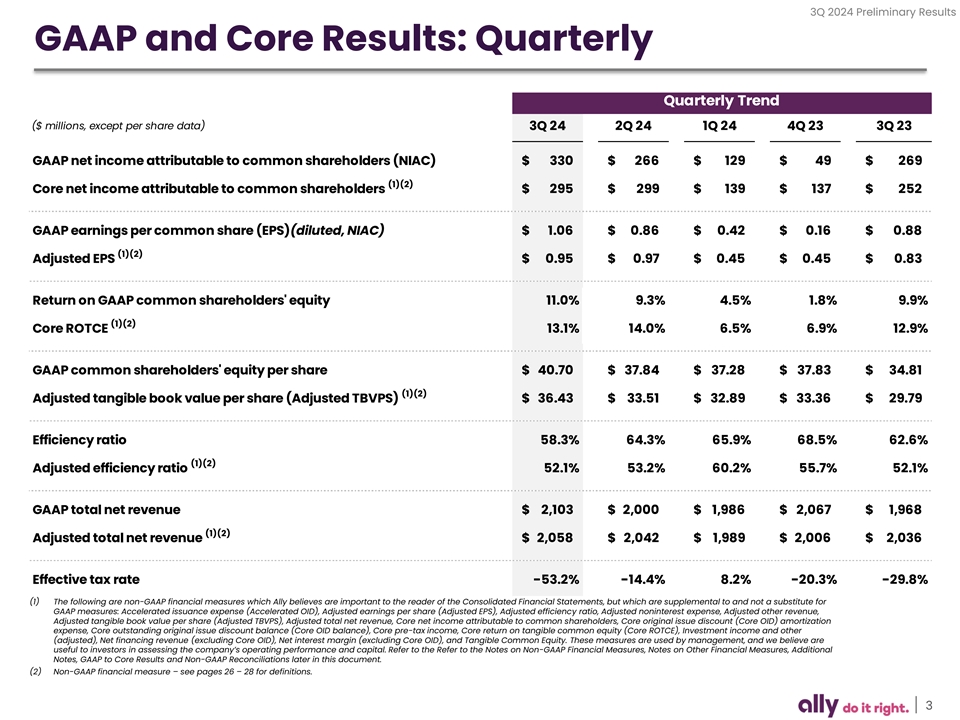 3Q 2024 Preliminary Results GAAP and Core Results: Quarterly Quarterly Trend ($ millions, except per share data) 3Q 24 2Q 24 1Q 24 4Q 23 3Q 23 GAAP net income attributable to common shareholders (NIAC) $ 330 $ 266 $ 1 29 $ 49 $ 269 (1)(2) Core net income attributable to common shareholders $ 295 $ 2 99 $ 1 39 $ 137 $ 252 GAAP earnings per common share (EPS)(diluted, NIAC) $ 1 .06 $ 0.86 $ 0.42 $ 0 .16 $ 0.88 (1)(2) Adjusted EPS $ 0 .95 $ 0.97 $ 0.45 $ 0.45 $ 0 .83 Return on GAAP common shareholders' equity 11.0% 9.3% 4.5% 1.8% 9.9% (1)(2) Core ROTCE 13.1% 14.0% 6.5% 6.9% 12.9% GAAP common shareholders' equity per share $ 4 0.70 $ 37.84 $ 37.28 $ 37.83 $ 3 4.81 (1)(2) Adjusted tangible book value per share (Adjusted TBVPS) $ 36.43 $ 33.51 $ 32.89 $ 33.36 $ 2 9.79 Efficiency ratio 58.3% 64.3% 65.9% 68.5% 62.6% (1)(2) Adjusted efficiency ratio 52.1% 53.2% 60.2% 55.7% 52.1% GAAP total net revenue $ 2,103 $ 2,000 $ 1 ,986 $ 2,067 $ 1 ,968 (1)(2) Adjusted total net revenue $ 2,058 $ 2 ,042 $ 1,989 $ 2,006 $ 2 ,036 Effective tax rate -53.2% -14.4% 8.2% -20.3% -29.8% (1) The following are non-GAAP financial measures which Ally believes are important to the reader of the Consolidated Financial Statements, but which are supplemental to and not a substitute for GAAP measures: Accelerated issuance expense (Accelerated OID), Adjusted earnings per share (Adjusted EPS), Adjusted efficiency ratio, Adjusted noninterest expense, Adjusted other revenue, Adjusted tangible book value per share (Adjusted TBVPS), Adjusted total net revenue, Core net income attributable to common shareholders, Core original issue discount (Core OID) amortization expense, Core outstanding original issue discount balance (Core OID balance), Core pre-tax income, Core return on tangible common equity (Core ROTCE), Investment income and other (adjusted), Net financing revenue (excluding Core OID), Net interest margin (excluding Core OID), and Tangible Common Equity. These measures are used by management, and we believe are useful to investors in assessing the company’s operating performance and capital. Refer to the Refer to the Notes on Non-GAAP Financial Measures, Notes on Other Financial Measures, Additional Notes, GAAP to Core Results and Non-GAAP Reconciliations later in this document. (2) Non-GAAP financial measure – see pages 26 – 28 for definitions. 3