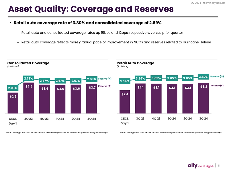 3Q 2024 Preliminary Results Asset Quality: Key Metrics (1) Net Charge-Off Activity (1) Consolidated Net Charge-Offs (NCOs) ($ millions) 3Q 23 4Q 23 1Q 24 2Q 24 3Q 24 1.77% Retail Auto $ 393 $ 470 $ 477 $ 378 $ 467 Annualized 1.55% 1.50% NCO Rate Commercial Auto - 19 1 (4) - 1.31% 1.26% $623 Mortgage Finance - - - - - NCOs ($M) $539 $517 Corporate Finance (3) 48 (1) - (1) $456 $435 Ally Lending 29 36 - - - Ally Credit Card 39 52 62 62 52 (2) Corp/Other (2) (2) - (1) (1) Total $ 456 $ 623 $ 539 $ 435 $ 517 3Q 23 4Q 23 1Q 24 2Q 24 3Q 24 Note: Ratios exclude loans measured at fair value and loans held-for-sale ex. Ally Lending (4Q’23). (2) Corp/Other includes legacy Mortgage HFI portfolio. See page 29 for definition. (1) Retail Auto Net Charge-Offs (NCOs) Retail Auto Delinquencies 30+ DPD Delinquency 4.51% 4.42% 4.33% Annualized Rate 2.27% 2.24% 2.21% +66bps NCO Rate +86bps 3.88% +73bps 3.85% YoY YoY YoY +92bps +64bps 1.85% 1.81% $477 $470 NCOs ($M) YoY YoY $467 $393 $378 60+ DPD Delinquency 1.35% 1.26% 1.23% Rate 1.10% 1.03% 90+ DPD 0.59% 0.54% 0.51% 0.49% Delinquency 0.47% Rate 3Q 23 4Q 23 1Q 24 2Q 24 3Q 24 3Q 23 4Q 23 1Q 24 2Q 24 3Q 24 Notes: [1] 30+ and 60+ DPD Includes accruing contracts only; 10 (1) Excludes write-downs from retail auto loan sales (4Q’23 & 1Q’24) and Ally Lending sale (4Q’23). Notes: [2] Days Past Due is abbreviated as (“DPD”)