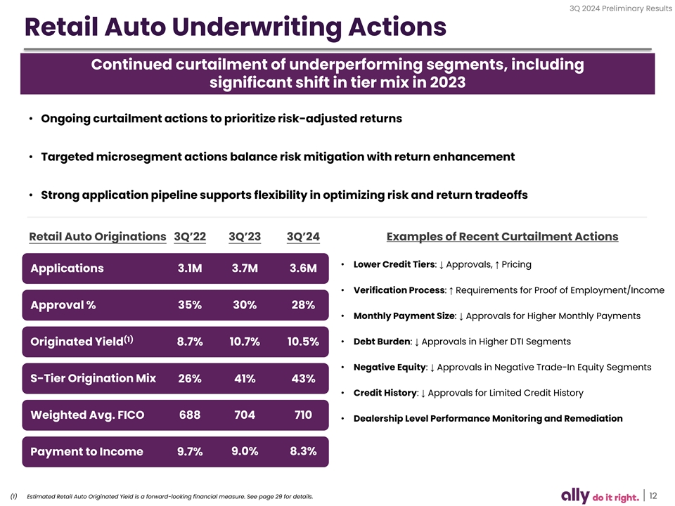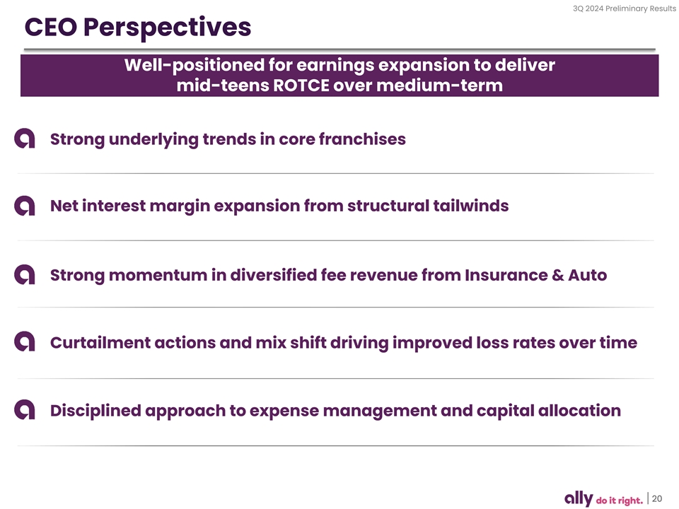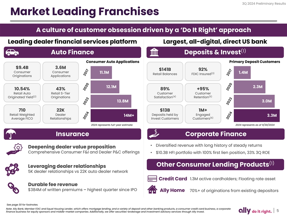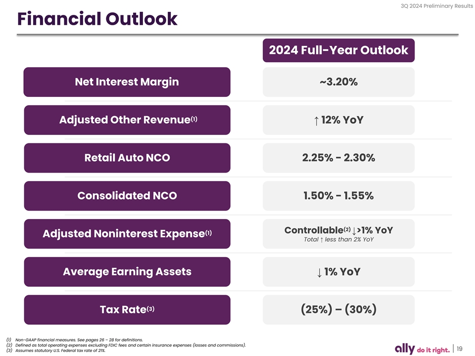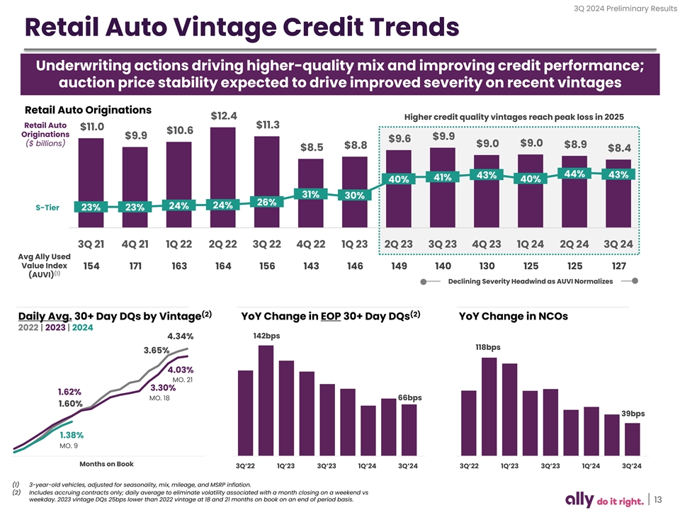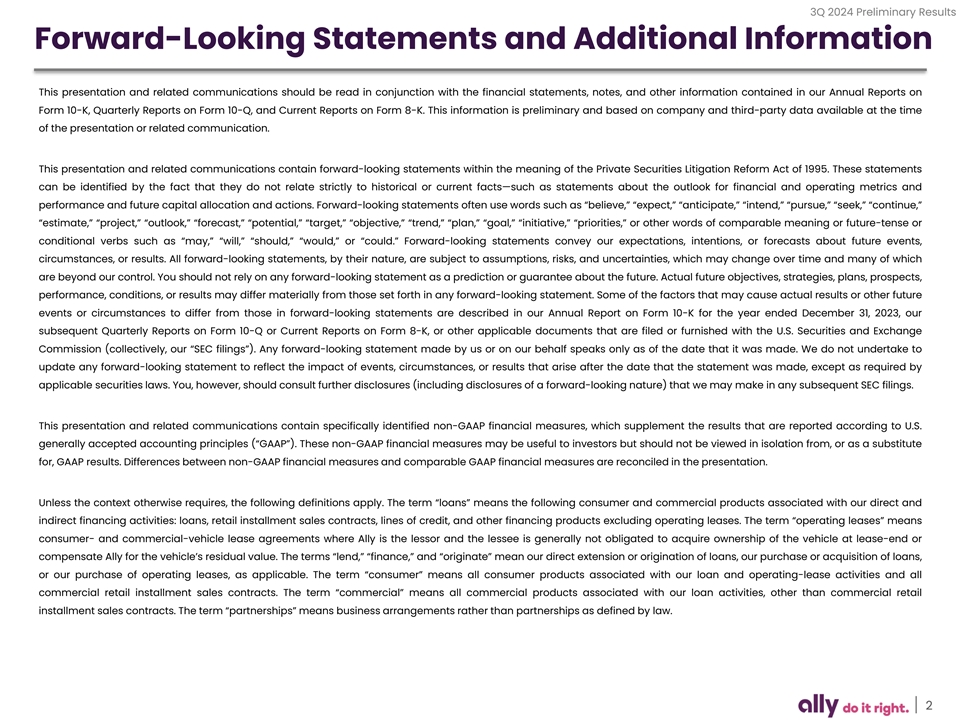 3Q 2024 Preliminary Results Forward-Looking Statements and Additional Information This presentation and related communications should be read in conjunction with the financial statements, notes, and other information contained in our Annual Reports on Form 10-K, Quarterly Reports on Form 10-Q, and Current Reports on Form 8-K. This information is preliminary and based on company and third-party data available at the time of the presentation or related communication. This presentation and related communications contain forward-looking statements within the meaning of the Private Securities Litigation Reform Act of 1995. These statements can be identified by the fact that they do not relate strictly to historical or current facts—such as statements about the outlook for financial and operating metrics and performance and future capital allocation and actions. Forward-looking statements often use words such as “believe,” “expect,” “anticipate,” “intend,” “pursue,” “seek,” “continue,” “estimate,” “project,” “outlook,” “forecast,” “potential,” “target,” “objective,” “trend,” “plan,” “goal,” “initiative,” “priorities,” or other words of comparable meaning or future-tense or conditional verbs such as “may,” “will,” “should,” “would,” or “could.” Forward-looking statements convey our expectations, intentions, or forecasts about future events, circumstances, or results. All forward-looking statements, by their nature, are subject to assumptions, risks, and uncertainties, which may change over time and many of which are beyond our control. You should not rely on any forward-looking statement as a prediction or guarantee about the future. Actual future objectives, strategies, plans, prospects, performance, conditions, or results may differ materially from those set forth in any forward-looking statement. Some of the factors that may cause actual results or other future events or circumstances to differ from those in forward-looking statements are described in our Annual Report on Form 10-K for the year ended December 31, 2023, our subsequent Quarterly Reports on Form 10-Q or Current Reports on Form 8-K, or other applicable documents that are filed or furnished with the U.S. Securities and Exchange Commission (collectively, our “SEC filings”). Any forward-looking statement made by us or on our behalf speaks only as of the date that it was made. We do not undertake to update any forward-looking statement to reflect the impact of events, circumstances, or results that arise after the date that the statement was made, except as required by applicable securities laws. You, however, should consult further disclosures (including disclosures of a forward-looking nature) that we may make in any subsequent SEC filings. This presentation and related communications contain specifically identified non-GAAP financial measures, which supplement the results that are reported according to U.S. generally accepted accounting principles (“GAAP”). These non-GAAP financial measures may be useful to investors but should not be viewed in isolation from, or as a substitute for, GAAP results. Differences between non-GAAP financial measures and comparable GAAP financial measures are reconciled in the presentation. Unless the context otherwise requires, the following definitions apply. The term “loans” means the following consumer and commercial products associated with our direct and indirect financing activities: loans, retail installment sales contracts, lines of credit, and other financing products excluding operating leases. The term “operating leases” means consumer- and commercial-vehicle lease agreements where Ally is the lessor and the lessee is generally not obligated to acquire ownership of the vehicle at lease-end or compensate Ally for the vehicle’s residual value. The terms “lend,” “finance,” and “originate” mean our direct extension or origination of loans, our purchase or acquisition of loans, or our purchase of operating leases, as applicable. The term “consumer” means all consumer products associated with our loan and operating-lease activities and all commercial retail installment sales contracts. The term “commercial” means all commercial products associated with our loan activities, other than commercial retail installment sales contracts. The term “partnerships” means business arrangements rather than partnerships as defined by law. 2