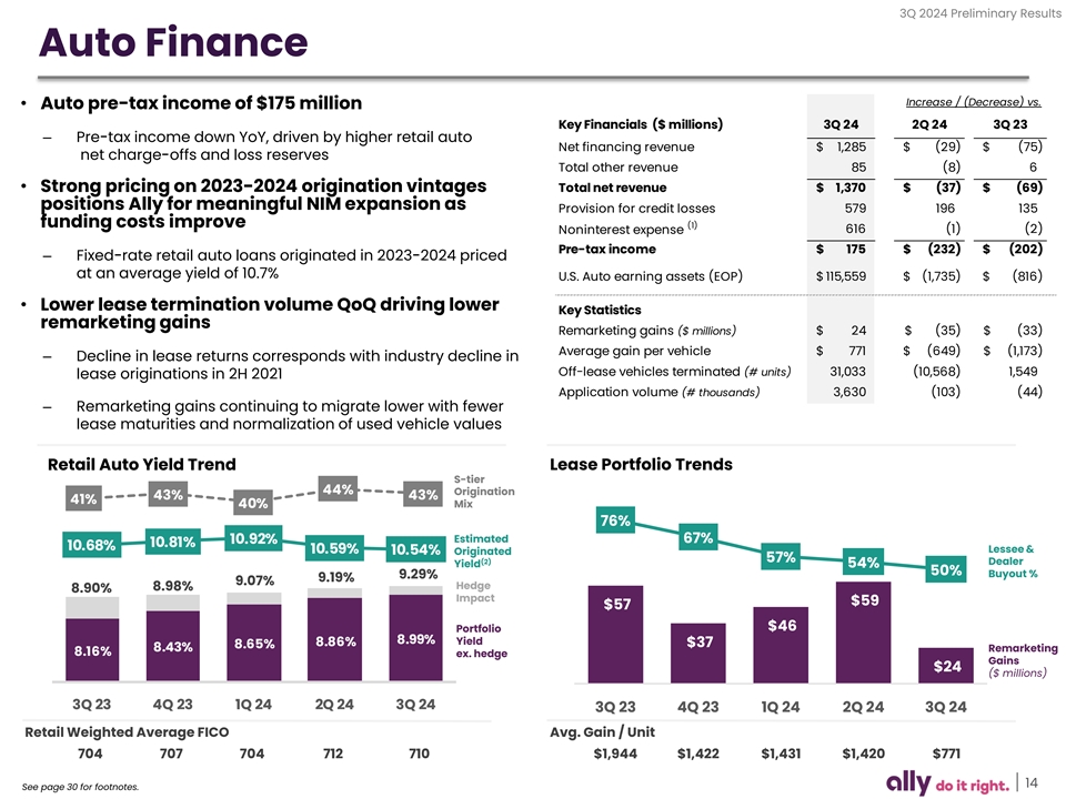 3Q 2024 Preliminary Results Retail Auto Vintage Credit Trends Underwriting actions driving higher-quality mix and improving credit performance; auction price stability expected to drive improved severity on recent vintages Retail Auto Originations $12.4 Higher credit quality vintages reach peak loss in 2025 Retail Auto $11.3 $11.0 $10.6 Originations $9.9 $9.9 $9.6 ($ billions) $9.0 $9.0 $8.9 $8.8 $8.5 $8.4 44% 43% 43% 41% 40% 40% 31% 30% 26% 24% 24% S-Tier 23% 23% 3Q 21 4Q 21 1Q 22 2Q 22 3Q 22 4Q 22 1Q 23 2Q 23 3Q 23 4Q 23 1Q 24 2Q 24 3Q 24 Avg Ally Used Value Index 154 171 163 164 156 143 146 149 140 130 125 125 127 (1) (AUVI) Declining Severity Headwind as AUVI Normalizes (2) (2) Daily Avg. 30+ Day DQs by Vintage YoY Change in EOP 30+ Day DQs YoY Change in NCOs 2022 | 2023 | 2024 4.34% 142bps 118bps 3.65% 4.03% MO. 21 3.30% 1.62% MO. 18 66bps 1.60% 39bps 1.38% MO. 9 Months on Book 3Q’22 1Q’23 3Q’23 1Q’24 3Q’24 3Q’22 1Q’23 3Q’23 1Q’24 3Q’24 (1) 3-year-old vehicles, adjusted for seasonality, mix, mileage, and MSRP inflation. (2) Includes accruing contracts only; daily average to eliminate volatility associated with a month closing on a weekend vs weekday. 2023 vintage DQs 25bps lower than 2022 vintage at 18 and 21 months on book on an end of period basis. 13