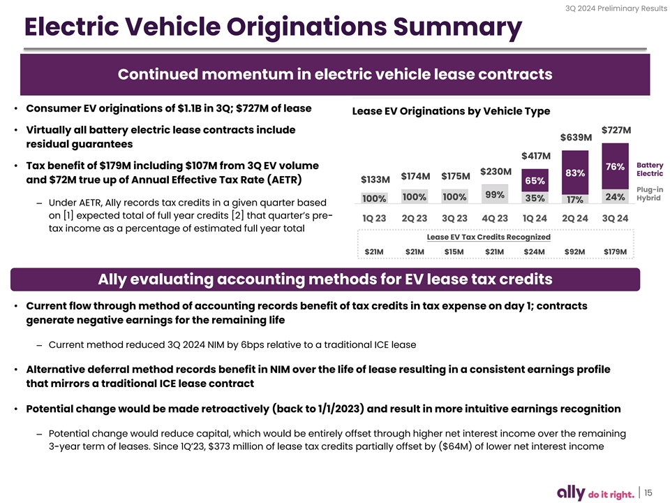 3Q 2024 Preliminary Results Electric Vehicle Originations Summary Continued momentum in electric vehicle lease contracts • Consumer EV originations of $1.1B in 3Q; $727M of lease Lease EV Originations by Vehicle Type • Virtually all battery electric lease contracts include $727M $639M residual guarantees $417M Battery • Tax benefit of $179M including $107M from 3Q EV volume 76% $230M 83% Electric $174M $175M $133M and $72M true up of Annual Effective Tax Rate (AETR) 65% Plug-in 99% 100% 100% 24% Hybrid 100% 35% 17% – Under AETR, Ally records tax credits in a given quarter based on [1] expected total of full year credits [2] that quarter’s pre- 1Q 23 2Q 23 3Q 23 4Q 23 1Q 24 2Q 24 3Q 24 tax income as a percentage of estimated full year total Lease EV Tax Credits Recognized $21M $21M $15M $21M $24M $92M $179M Ally evaluating accounting methods for EV lease tax credits • Current flow through method of accounting records benefit of tax credits in tax expense on day 1; contracts generate negative earnings for the remaining life – Current method reduced 3Q 2024 NIM by 6bps relative to a traditional ICE lease • Alternative deferral method records benefit in NIM over the life of lease resulting in a consistent earnings profile that mirrors a traditional ICE lease contract • Potential change would be made retroactively (back to 1/1/2023) and result in more intuitive earnings recognition – Potential change would reduce capital, which would be entirely offset through higher net interest income over the remaining 3-year term of leases. Since 1Q’23, $373 million of lease tax credits partially offset by ($64M) of lower net interest income 15