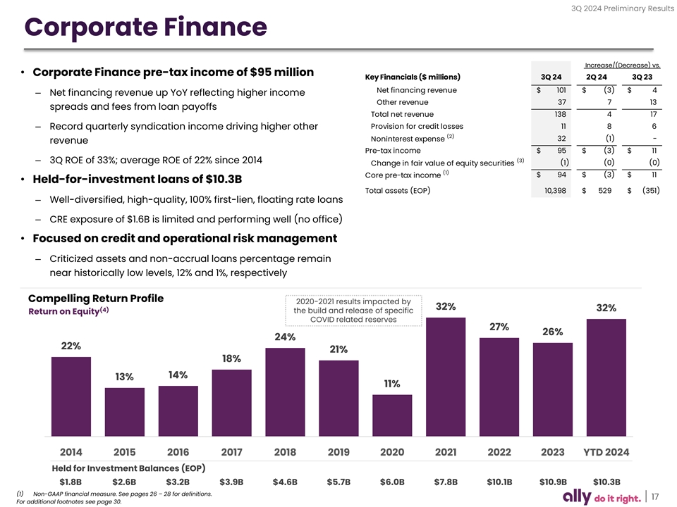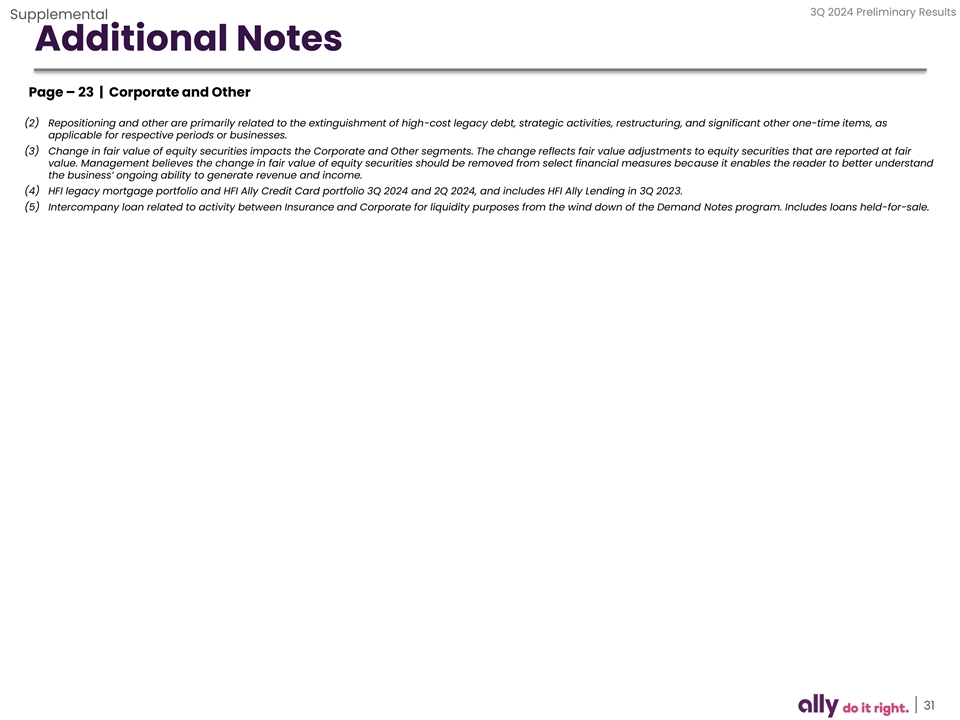 3Q 2024 Preliminary Results Supplemental Additional Notes Page – 23 | Corporate and Other (2) Repositioning and other are primarily related to the extinguishment of high-cost legacy debt, strategic activities, restructuring, and significant other one-time items, as applicable for respective periods or businesses. (3) Change in fair value of equity securities impacts the Corporate and Other segments. The change reflects fair value adjustments to equity securities that are reported at fair value. Management believes the change in fair value of equity securities should be removed from select financial measures because it enables the reader to better understand the business’ ongoing ability to generate revenue and income. (4) HFI legacy mortgage portfolio and HFI Ally Credit Card portfolio 3Q 2024 and 2Q 2024, and includes HFI Ally Lending in 3Q 2023. (5) Intercompany loan related to activity between Insurance and Corporate for liquidity purposes from the wind down of the Demand Notes program. Includes loans held-for-sale. 31