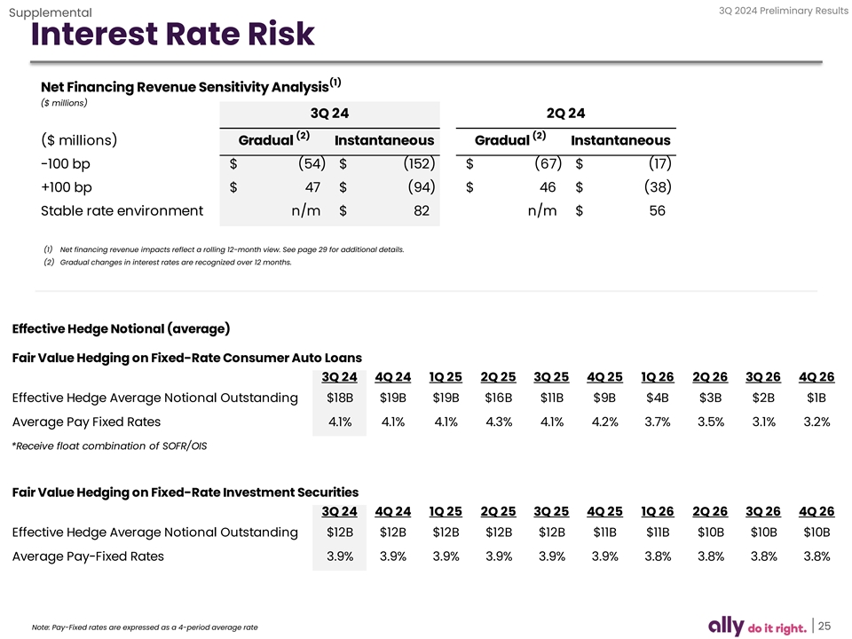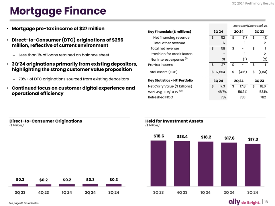 3Q 2024 Preliminary Results Supplemental Additional Notes Page – 5 | Market Leading Franchises (1) Deposits and Invest, and Other Consumer Lending Products activity is within ‘Corporate and Other’ segment. (2) Estimated Retail Auto Originated Yield is a forward-looking financial measure. See page 29 for details. (3) FDIC insured percentage excludes affiliate and intercompany deposits. (4) Bank customer satisfaction rate is calculated with data collected during 3Q 2024 in the Ally Relationship Survey and represents Top 2 Box results on a 7-point satisfaction score. (5) Customer retention rate is the annualized 3-month rolling average of 1 minus the monthly attrition rate; excludes escheatment. (6) Engaged customers are active deposit customers utilizing Invest, Direct Deposit, Debit, or Savings Toolkit (launched in 2020). Page – 14 | Auto Finance (1) Noninterest expense includes corporate allocations of $279 million in 3Q 2024, $278 million in 2Q 2024, and $288 million in 3Q 2023. (2) Estimated Retail Auto Originated Yield is a forward-looking financial measure. See page 29 for details. Page – 16 | Insurance (2) Acquisition and underwriting expenses includes corporate allocations of $22 million in 3Q 2024, $23 million in 2Q 2024, and $26 million in 3Q 2023. (3) Change in fair value of equity securities impacts the Insurance segment. The change reflects fair value adjustments to equity securities that are reported at fair value. Management believes the change in fair value of equity securities should be removed from select financial measures because it enables the reader to better understand the business’ ongoing ability to generate revenue and income. Page – 17 | Corporate Finance (2) Noninterest expense includes corporate allocations of $12 million in 3Q 2024, $13 million in 2Q 2024, and $14 million in 3Q 2023. (3) Change in fair value of equity securities impacts the Corporate Finance segment. The change reflects fair value adjustments to equity securities that are reported at fair value. Management believes the change in fair value of equity securities should be removed from select financial measures because it enables the reader to better understand the business’ ongoing ability to generate revenue and income. (4) Return on equity calculation assumes 35% tax rate for 2014-2017 and 24% thereafter; allocated equity equal to 9% of average risk-weighted assets. Page – 18 | Mortgage Finance (1) Noninterest expense includes corporate allocations of $20 million in 3Q 2024, $21 million in 2Q 2024, and $21 million in 3Q 2023. (2) 1st lien only. Updated home values derived using a combination of appraisals, Broker price opinion (BPOs), Automated Valuation Models (AVMs) and Metropolitan Statistical Area (MSA) level house price indices. Page – 22 | Results by Segment (2) Change in fair value of equity securities impacts the Insurance, Corporate Finance and Corporate and Other segments. The change reflects fair value adjustments to equity securities that are reported at fair value. Management believes the change in fair value of equity securities should be removed from select financial measures because it enables the reader to better understand the business’ ongoing ability to generate revenue and income. (3) Repositioning and other are primarily related to the extinguishment of high-cost legacy debt, strategic activities, restructuring, and significant other one-time items, as applicable for respective periods or businesses. (4) Includes adjustments for non-GAAP measures Core OID expense, change in fair value of equity securities, and repositioning. 30