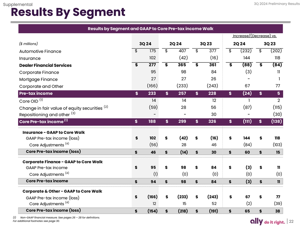 3Q 2024 Preliminary Results Supplemental Results By Segment Results by Segment and GAAP to Core Pre-tax income Walk Increase/(Decrease) vs. ($ millions) 3Q 24 2Q 24 3Q 23 2Q 24 3Q 23 $ 1 75 $ 4 07 $ 3 77 $ (232) $ (202) Automotive Finance 1 02 ( 42) ( 16) 144 118 Insurance $ 277 $ 365 $ 3 61 $ (88) $ ( 84) Dealer Financial Services 95 98 84 ( 3) 11 Corporate Finance 27 27 26 - 1 Mortgage Finance (166) (233) (243) 67 77 Corporate and Other Pre-tax income $ 2 33 $ 257 $ 228 $ ( 24) $ 5 (1) 14 14 12 1 2 Core OID (2) (59) 28 56 (87) (115) Change in fair value of equity securities (3) - - 30 - ( 30) Repositioning and other (1) Core Pre-tax income $ 188 $ 299 $ 3 26 $ (111) $ ( 138) Insurance - GAAP to Core Walk $ 1 02 $ (42) $ ( 16) $ 144 $ 118 GAAP Pre-tax income (loss) (4) (56) 28 46 (84) (103) Core Adjustments Core Pre-tax income (loss) $ 46 $ (14) $ 30 $ 60 $ 15 Corporate Finance - GAAP to Core Walk GAAP Pre-tax income $ 95 $ 98 $ 84 $ ( 3) $ 11 (4) Core Adjustments (1) (0) (0) (0) (0) Core Pre-tax income $ 94 $ 98 $ 84 $ ( 3) $ 11 Corporate & Other - GAAP to Core Walk $ ( 166) $ ( 233) $ (243) $ 67 $ 77 GAAP Pre-tax income (loss) (4) 12 15 52 (2) (39) Core Adjustments Core Pre-tax income (loss) $ (154) $ (218) $ ( 191) $ 65 $ 38 (1) Non-GAAP financial measure. See pages 26 – 28 for definitions. For additional footnotes see page 30. 22
