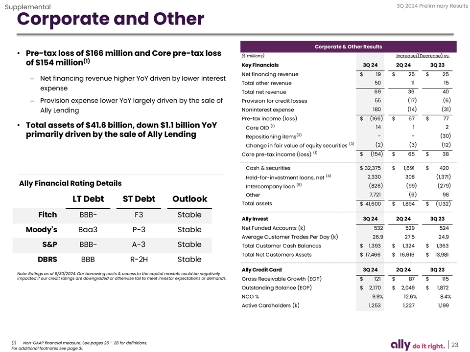 3Q 2024 Preliminary Results Supplemental Corporate and Other Corporate & Other Results • Pre-tax loss of $166 million and Core pre-tax loss ($ millions) Increase/(Decrease) vs. (1) of $154 million Key Financials 3Q 24 2Q 24 3Q 23 Net financing revenue $ 19 $ 25 $ 25 – Net financing revenue higher YoY driven by lower interest 50 11 15 Total other revenue expense Total net revenue 69 36 40 55 (17) (6) – Provision expense lower YoY largely driven by the sale of Provision for credit losses Noninterest expense 180 (14) (31) Ally Lending Pre-tax income (loss) $ ( 166) $ 67 $ 77 (1) • Total assets of $41.6 billion, down $1.1 billion YoY 14 1 2 Core OID (2) primarily driven by the sale of Ally Lending - - (30) Repositioning items (3) (2) (3) (12) Change in fair value of equity securities (1) $ (154) $ 65 $ 38 Core pre-tax income (loss) Cash & securities $ 32,375 $ 1,691 $ 420 (4) 2,330 308 (1,371) Held-for-investment loans, net Ally Financial Rating Details (5) (826) (99) (279) Intercompany loan Other 7 ,721 (6) 98 LT Debt ST Debt Outlook Total assets $ 41,600 $ 1,894 $ ( 1,132) Fitch BBB- F3 Stable Ally Invest 3Q 24 2Q 24 3Q 23 Net Funded Accounts (k) 532 529 524 Moody's Baa3 P-3 Stable Average Customer Trades Per Day (k) 26.9 27.5 24.9 S&P BBB- A-3 Stable Total Customer Cash Balances $ 1,393 $ 1,324 $ 1,363 Total Net Customers Assets $ 17,466 $ 16,616 $ 13,981 DBRS BBB R-2H Stable Ally Credit Card 3Q 24 2Q 24 3Q 23 Note: Ratings as of 9/30/2024. Our borrowing costs & access to the capital markets could be negatively impacted if our credit ratings are downgraded or otherwise fail to meet investor expectations or demands. Gross Receivable Growth (EOP) $ 121 $ 87 $ 115 Outstanding Balance (EOP) $ 2,170 $ 2,049 $ 1,872 NCO % 9.9% 12.6% 8.4% Active Cardholders (k) 1,253 1 ,227 1,199 (1) Non-GAAP financial measure. See pages 26 – 28 for definitions. 23 For additional footnotes see page 31.