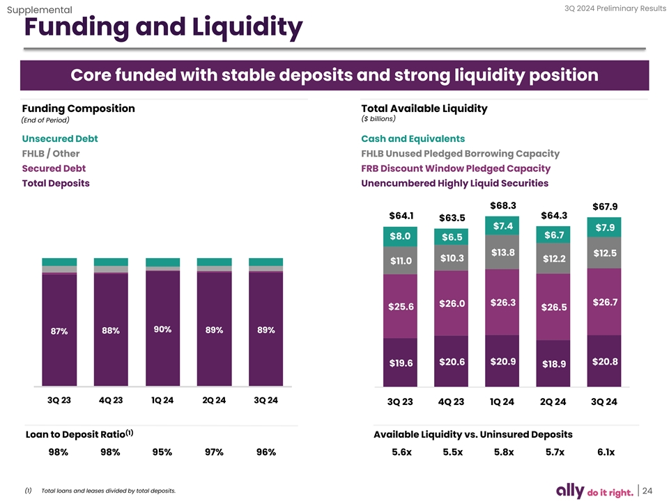 3Q 2024 Preliminary Results Supplemental Funding and Liquidity Core funded with stable deposits and strong liquidity position Funding Composition Total Available Liquidity ($ billions) (End of Period) Unsecured Debt Cash and Equivalents FHLB / Other FHLB Unused Pledged Borrowing Capacity Secured Debt FRB Discount Window Pledged Capacity Total Deposits Unencumbered Highly Liquid Securities $68.3 $67.9 $64.1 $64.3 $63.5 $7.4 $7.9 $6.7 $8.0 $6.5 $13.8 $12.5 $10.3 $12.2 $11.0 $26.7 $26.3 $26.0 $25.6 $26.5 90% 89% 89% 88% 8 % $20.9 $20.6 $20.8 $19.6 $18.9 3Q 23 4Q 23 1Q 24 2Q 24 3Q 24 3Q 23 4Q 23 1Q 24 2Q 24 3Q 24 (1) Loan to Deposit Ratio Available Liquidity vs. Uninsured Deposits 98% 98% 95% 97% 96% 5.6x 5.5x 5.8x 5.7x 6.1x (1) Total loans and leases divided by total deposits. 24