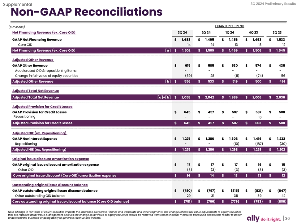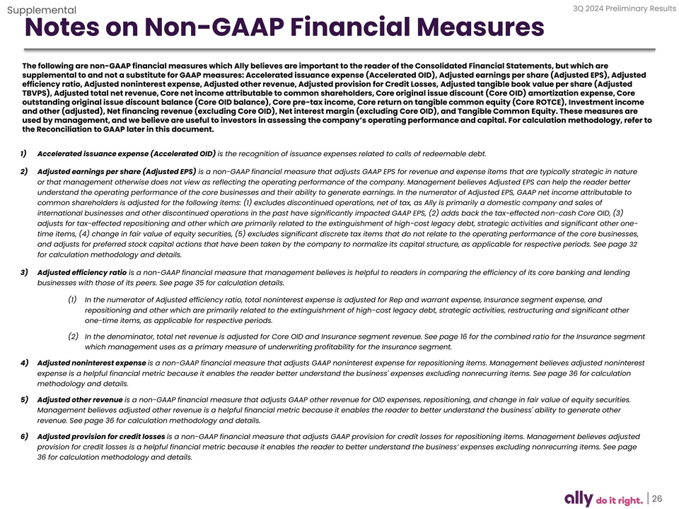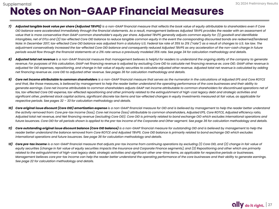 3Q 2024 Preliminary Results Supplemental Notes on Non-GAAP Financial Measures The following are non-GAAP financial measures which Ally believes are important to the reader of the Consolidated Financial Statements, but which are supplemental to and not a substitute for GAAP measures: Accelerated issuance expense (Accelerated OID), Adjusted earnings per share (Adjusted EPS), Adjusted efficiency ratio, Adjusted noninterest expense, Adjusted other revenue, Adjusted provision for Credit Losses, Adjusted tangible book value per share (Adjusted TBVPS), Adjusted total net revenue, Core net income attributable to common shareholders, Core original issue discount (Core OID) amortization expense, Core outstanding original issue discount balance (Core OID balance), Core pre-tax income, Core return on tangible common equity (Core ROTCE), Investment income and other (adjusted), Net financing revenue (excluding Core OID), Net interest margin (excluding Core OID), and Tangible Common Equity. These measures are used by management, and we believe are useful to investors in assessing the company’s operating performance and ccal apita culati l. Fo on r methodology, refer to the Reconciliation to GAAP later in this document. 1) Accelerated issuance expense (Accelerated OID) is the recognition of issuance expenses related to calls of redeemable debt. 2) Adjusted earnings per share (Adjusted EPS) is a non-GAAP financial measure that adjusts GAAP EPS for revenue and expense items that are typically strategic in nature or that management otherwise does not view as reflecting the operating performance of the company. Management believes Adjusted EPS can help the reader better understand the operating performance of the core businesses and their ability to generate earnings. In the numerator of Adjusted EPS, GAAP net income attributable to common shareholders is adjusted for the following items: (1) excludes discontinued operations, net of tax, as Ally is primarily a domestic company and sales of international businesses and other discontinued operations in the past have significantly impacted GAAP EPS, (2) adds back the tax-effected non-cash Core OID, (3) adjusts for tax-effected repositioning and other which are primarily related to the extinguishment of high-cost legacy debt, strategic activities and significant other one- time items, (4) change in fair value of equity securities, (5) excludes significant discrete tax items that do not relate to the operating performance of the core businesses, and adjusts for preferred stock capital actions that have been taken by the company to normalize its capital structure, as applicable for respective periods. See page 32 for calculation methodology and details. 3) Adjusted efficiency ratio is a non-GAAP financial measure that management believes is helpful to readers in comparing the efficiency of its core banking and lending businesses with those of its peers. See page 35 for calculation details. (1) In the numerator of Adjusted efficiency ratio, total noninterest expense is adjusted for Rep and warrant expense, Insurance segment expense, and repositioning and other which are primarily related to the extinguishment of high-cost legacy debt, strategic activities, restructuring and significant other one-time items, as applicable for respective periods. (2) In the denominator, total net revenue is adjusted for Core OID and Insurance segment revenue. See page 16 for the combined ratio for the Insurance segment which management uses as a primary measure of underwriting profitability for the Insurance segment. 4) Adjusted noninterest expense is a non-GAAP financial measure that adjusts GAAP noninterest expense for repositioning items. Management believes adjusted noninterest expense is a helpful financial metric because it enables the reader better understand the business' expenses excluding nonrecurring items. See page 36 for calculation methodology and details. 5) Adjusted other revenue is a non-GAAP financial measure that adjusts GAAP other revenue for OID expenses, repositioning, and change in fair value of equity securities. Management believes adjusted other revenue is a helpful financial metric because it enables the reader to better understand the business' ability to generate other revenue. See page 36 for calculation methodology and details. 6) Adjusted provision for credit losses is a non-GAAP financial measure that adjusts GAAP provision for credit losses for repositioning items. Management believes adjusted provision for credit losses is a helpful financial metric because it enables the reader to better understand the business’ expenses excluding nonrecurring items. See page 36 for calculation methodology and details. 26
