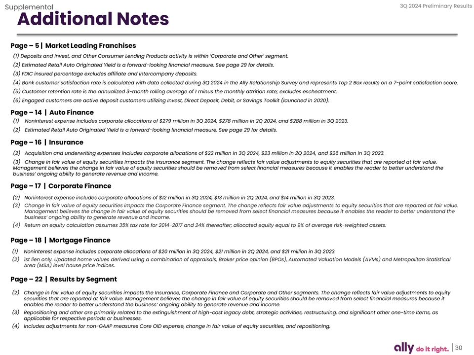 3Q 2024 Preliminary Results Supplemental Notes on Other Financial Measures 1) Change in fair value of equity securities impacts the Insurance, Corporate Finance and Corporate and Other segments. The change reflects fair value adjustments to equity securities that are reported at fair value. Management believes the change in fair value of equity securities should be removed from select financial measures because it enables the reader to better understand the business’ ongoing ability to generate revenue and income. 2) Estimated impact of CECL on regulatory capital per final rule issued by U.S. banking agencies - In December 2018, the FRB and other U.S. banking agencies approved a final rule to address the impact of CECL on regulatory capital by allowing BHCs and banks, including Ally, the option to phase in the day-one impact of CECL over a three-year period. In March 2020, the FRB and other U.S. banking agencies issued an interim final rule that became effective on March 31, 2020 and provided an alternative option for banks to temporarily delay the impacts of CECL, relative to the incurred loss methodology for estimating the allowance for loan losses, on regulatory capital. A final rule that was largely unchanged from the March 2020 interim final rule was issued by the FRB and other U.S. banking agencies in August 2020, and became effective in September 2020. For regulatory capital purposes, these rules permitted us to delay recognizing the estimated impact of CECL on regulatory capital until after a two-year deferral period, which for us extended through December 31, 2021. Beginning on January 1, 2022, we are required to phase in 25% of the previously deferred estimated capital impact of CECL, with an additional 25% to be phased in at the beginning of each subsequent year until fully phased in by the first quarter of 2025. Under these rules, firms that adopt CECL and elect the five-year transition will calculate the estimated impact of CECL on regulatory capital as the day-one impact of adoption plus 25% of the subsequent change in allowance during the two-year deferral period, which according to the final rule approximates the impact of CECL relative to an incurred loss model. We adopted this transition option during the first quarter of 2020, and beginning January 1, 2022 are phasing in the regulatory capital impacts of CECL based on this five-year transition period. 3) Estimated retail auto originated yield is a financial measure determined by calculating the estimated average annualized yield for loans originated during the period. At this time there currently is no comparable GAAP financial measure for Estimated Retail Auto Originated Yield and therefore this forecasted estimate of yield at the time of origination cannot be quantitatively reconciled to comparable GAAP information. 4) Interest rate risk modeling – We prepare our forward-looking baseline forecasts of net financing revenue taking into consideration anticipated future business growth, asset/liability positioning, and interest rates based on the implied forward curve. The analysis is highly dependent upon a variety of assumptions including the repricing characteristics of retail deposits with both contractual and non-contractual maturities. We continually monitor industry and competitive repricing activity along with other market factors when contemplating deposit pricing actions. Please see our SEC filings for more details. 5) Net charge-off ratios are calculated as annualized net charge-offs divided by average outstanding finance receivables and loans excluding loans measured at fair value and loans held-for-sale. 6) Repositioning is primarily related to the extinguishment of high-cost legacy debt, strategic activities, restructuring, amounts related to nonrecurring business transactions or pending transactions, and significant other one-time items. 7) U.S. consumer auto originations New Retail – standard and subvented rate new vehicle loans; Lease – new vehicle lease originations; Used – used vehicle loans Nonprime – originations with a FICO® score of less than 620 29