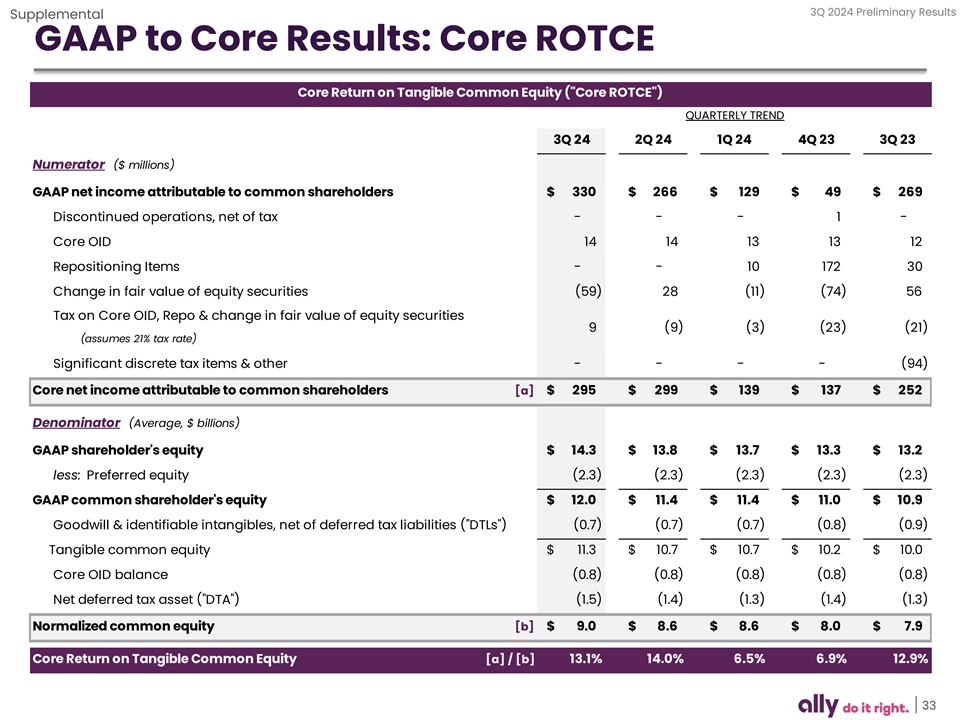 3Q 2024 Preliminary Results Supplemental Notes on Non-GAAP Financial Measures 13) Core return on tangible common equity (Core ROTCE) is a non-GAAP financial measure that management believes is helpful for readers to better understand the ongoing ability of the company to generate returns on its equity base that supports core operations. For purposes of this calculation, tangible common equity is adjusted for Core OID balance and net DTA. Ally’s Core net income attributable to common shareholders for purposes of calculating Core ROTCE is based on the actual effective tax rate for the period adjusted for significant discrete tax items including tax reserve releases, which aligns with the methodology used in calculating adjusted earnings per share. See page 33 for calculation details. (1) In the numerator of Core ROTCE, GAAP net income attributable to common shareholders is adjusted for discontinued operations net of tax, tax-effected Core OID, tax-effected repositioning and other which are primarily related to the extinguishment of high-cost legacy debt, strategic activities and significant other one- time items, change in fair value of equity securities, significant discrete tax items, and preferred stock capital actions, as applicable for respective periods. (2) In the denominator, GAAP shareholder’s equity is adjusted for goodwill and identifiable intangibles net of DTL, Core OID balance, and net DTA. 14) Investment income and other (adjusted) is a non-GAAP financial measure that adjusts GAAP investment income and other for repositioning, and the change in fair value of equity securities. Management believes investment income and other (adjusted) is a helpful financial metric because it enables the reader to better understand the business' ability to generate investment income. 15) Net financing revenue excluding core OID is calculated using a non-GAAP measure that adjusts net financing revenue by excluding Core OID. The Core OID balance is primarily related to bond exchange OID which excludes international operations and future issuances. Management believes net financing revenue ex. Core OID is a helpful financial metric because it enables the reader to better understand the business' ability to generate revenue. See pages 36 for calculation methodology and details. 16) Net interest margin excluding core OID is calculated using a non-GAAP measure that adjusts net interest margin by excluding Core OID. The Core OID balance is primarily related to bond exchange OID which excludes international operations and future issuances. Management believes net interest margin ex. Core OID is a helpful financial metric because it enables the reader to better understand the business' profitability and margins. See page 7 for calculation methodology and details. 17) Tangible Common Equity is a non-GAAP financial measure that is defined as common stockholders’ equity less goodwill and identifiable intangible assets, net of deferred tax liabilities. Ally considers various measures when evaluating capital adequacy, including tangible common equity. Ally believes that tangible common equity is important because we believe readers may assess our capital adequacy using this measure. Additionally, presentation of this measure allows readers to compare certain aspects of our capital adequacy on the same basis to other companies in the industry. For purposes of calculating Core return on tangible common equity (Core ROTCE), tangible common equity is further adjusted for Core OID balance and net deferred tax asset. See pages 34 for calculation methodology and details. 28