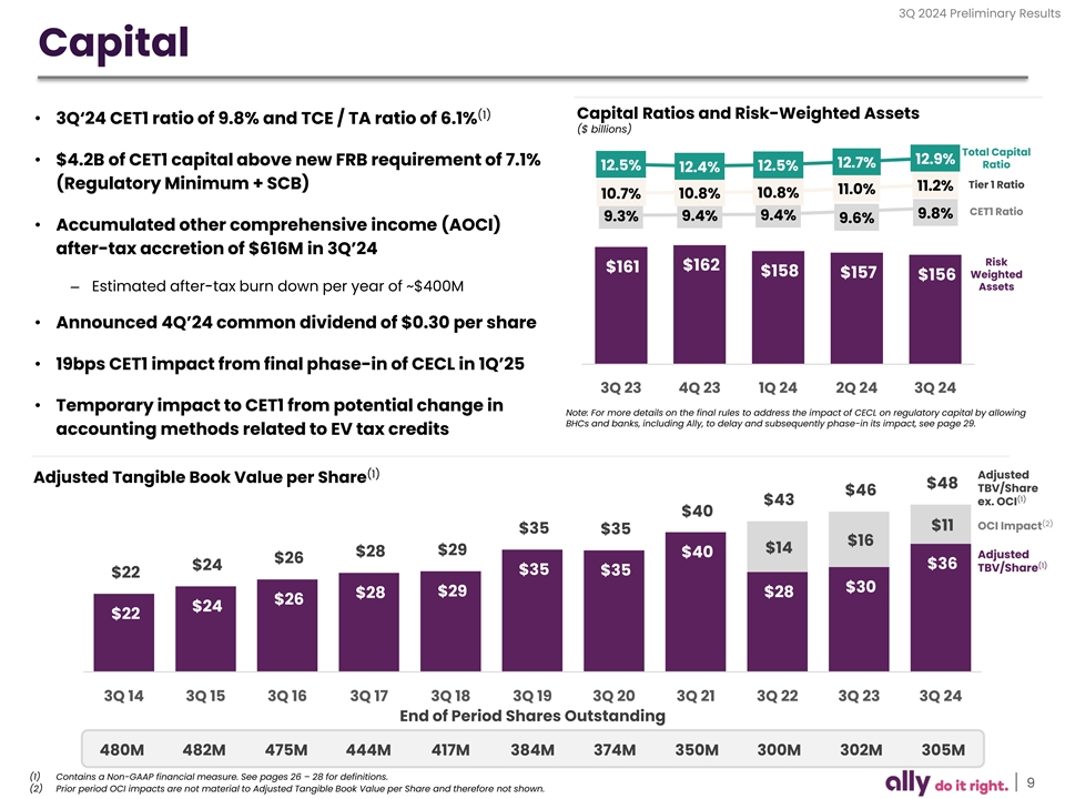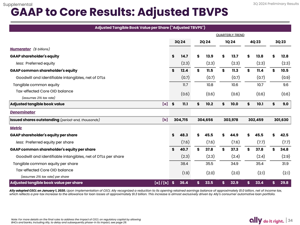 3Q 2024 Preliminary Results Supplemental GAAP to Core Results: Adjusted TBVPS Adjusted Tangible Book Value per Share ( Adjusted TBVPS ) QUARTERLY TREND 3Q 24 2Q 24 1Q 24 4Q 23 3Q 23 Numerator ($ billions) GAAP shareholder's equity $ 14.7 $ 13.9 $ 13.7 $ 13.8 $ 12.8 less: Preferred equity (2.3) (2.3) (2.3) (2.3) (2.3) GAAP common shareholder's equity $ 12.4 $ 11.5 $ 11.3 $ 11.4 $ 10.5 Goodwill and identifiable intangibles, net of DTLs (0.7) (0.7) (0.7) (0.7) (0.9) Tangible common equity 1 1.7 10.8 10.6 1 0.7 9.6 Tax-effected Core OID balance ( 0.6) ( 0.6) (0.6) (0.6) ( 0.6) (assumes 21% tax rate) [a] Adjusted tangible book value $ 11.1 $ 10.2 $ 10.0 $ 10.1 $ 9.0 Denominator [b] Issued shares outstanding (period-end, thousands) 304,715 304,656 303,978 302,459 301,630 Metric GAAP shareholder's equity per share $ 48.3 $ 45.5 $ 44.9 $ 45.5 $ 42.5 less: Preferred equity per share (7.6) (7.6) (7.6) (7.7) (7.7) GAAP common shareholder's equity per share $ 40.7 $ 3 7.8 $ 37.3 $ 37.8 $ 34.8 Goodwill and identifiable intangibles, net of DTLs per share (2.3) (2.3) (2.4) (2.4) (2.9) Tangible common equity per share 38.4 35.5 34.9 35.4 31.9 Tax-effected Core OID balance (1.9) (2.0) (2.0) (2.1) (2.1) (assumes 21% tax rate) per share Adjusted tangible book value per share [a] / [b] $ 36.4 $ 33.5 $ 3 2.9 $ 33.4 $ 29.8 Ally adopted CECL on January 1, 2020. Upon implementation of CECL Ally recognized a reduction to its opening retained earnings balance of approximately $1.0 billion, net of income tax, which reflects a pre-tax increase to the allowance for loan losses of approximately $1.3 billion. This increase is almost exclusively driven by Ally’s consumer automotive loan portfolio. Note: For more details on the final rules to address the impact of CECL on regulatory capital by allowing 34 BHCs and banks, including Ally, to delay and subsequently phase-in its impact, see page 29.
