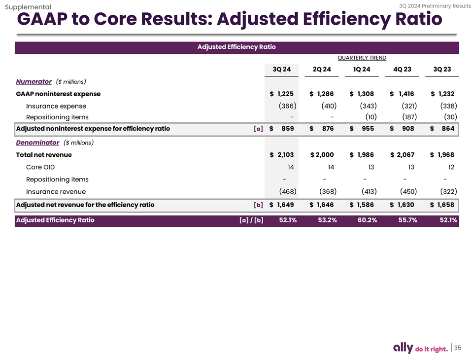 3Q 2024 Preliminary Results Supplemental GAAP to Core Results: Adjusted Efficiency Ratio Adjusted Efficiency Ratio QUARTERLY TREND 3Q 24 2Q 24 1Q 24 4Q 23 3Q 23 Numerator ($ millions) GAAP noninterest expense $ 1,225 $ 1,286 $ 1,308 $ 1,416 $ 1 ,232 Insurance expense (366) (410) ( 343) (321) (338) Repositioning items - - ( 10) (187) ( 30) Adjusted noninterest expense for efficiency ratio [a] $ 859 $ 876 $ 955 $ 908 $ 864 Denominator ($ millions) Total net revenue $ 2 ,103 $ 2 ,000 $ 1,986 $ 2 ,067 $ 1 ,968 Core OID 14 14 13 13 12 Repositioning items - - - - - Insurance revenue (468) ( 368) (413) ( 450) (322) Adjusted net revenue for the efficiency ratio [b] $ 1 ,649 $ 1,646 $ 1,586 $ 1 ,630 $ 1,658 Adjusted Efficiency Ratio [a] / [b] 52.1% 53.2% 60.2% 55.7% 52.1% 35