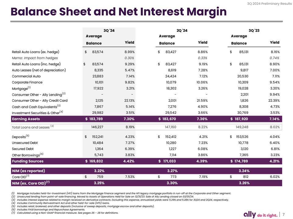 3Q 2024 Preliminary Results 3Q 2024 Financial Results Consolidated Income Statement - Quarterly Results Increase / (Decrease) vs. ($ millions; except per share data) 3Q 24 2Q 24 3Q 23 2Q 24 3Q 23 Net financing revenue $ 1,488 $ 1,495 $ 1,533 $ (7) $ (45) (1) 14 14 12 1 2 Core OID (1) 1,502 1,509 1,545 (6) (43) Net financing revenue (ex. Core OID) Other revenue $ 615 $ 505 $ 435 $ 110 $ 180 (2) (59) 28 56 ( 87) (115) Change in fair value of equity securities (1) 556 5 33 491 23 65 Adjusted other revenue Provision for credit losses $ 645 $ 457 $ 508 $ 188 $ 137 Memo: Net charge-offs 517 435 456 82 61 Memo: Provision build / (release) 128 22 52 106 76 (1) 645 457 508 1 88 137 Adjusted provision for credit losses Noninterest expense $ 1 ,225 $ 1,286 $ 1,232 $ (61) $ (7) (2) - - (30) - 30 Repositioning Items (1) 1,225 1 ,286 1 ,202 (61) 23 Adjusted noninterest expense Pre-tax income $ 233 $ 257 $ 228 $ (24) $ 5 Income tax expense / (benefit) Includes $179M in EV lease tax credits (124) (37) (68) (87) ( 56) Net income (loss) from discontinued operations - - - - - Net income $ 357 $ 294 $ 296 $ 63 $ 61 Preferred dividends 27 28 27 (1) - Net income attributable to common shareholders $ 330 $ 266 $ 269 $ 64 $ 61 GAAP EPS (diluted) $ 1 .06 $ 0 .86 $ 0 .88 $ 0.20 $ 0.18 (1) 0.04 0.04 0.03 0.00 0.00 Core OID, net of tax (2) (0.15) 0.07 0.14 ( 0.22) (0.29) Change in fair value of equity securities, net of tax (2) - - 0.08 - ( 0.08) Repositioning, discontinued ops., and other, net of tax - - (0.31) - 0.31 Significant Discrete Tax Items (1) $ 0 .95 $ 0 .97 $ 0.83 $ (0.02) $ 0 .12 Adjusted EPS (1) Non-GAAP financial measure. See pages 26 – 28 for definitions. (2) Contains Non-GAAP financial measures and other financial measures. See pages 26 – 28 for definitions. 6