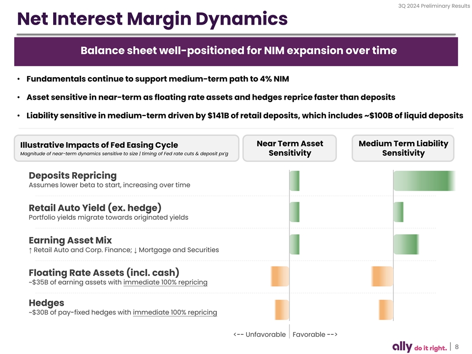 3Q 2024 Preliminary Results Balance Sheet and Net Interest Margin 3Q '24 2Q '24 3Q '23 Average Average Average Yield Yield Yield Balance Balance Balance Retail Auto Loans (ex. hedge) $ 83,574 8.99% $ 83,427 8.86% $ 85,131 8.16% Memo: Impact from hedges 0.30% 0.33% 0.74% Retail Auto Loans (inc. hedge) $ 83,574 9.29% $ 83,427 9.19% $ 8 5,131 8.90% Auto Leases (net of depreciation) 8,335 5.47% 8,619 7.28% 9,817 7.00% Commercial Auto 23,883 7.14% 2 4,424 7.12% 2 0,530 7.11% Corporate Finance 10,101 9.82% 10,079 10.06% 1 0,309 9.54% (1) 17,922 3.21% 18,302 3.26% 1 9,028 3.20% Mortgage (2) - - - - 2 ,201 9.94% Consumer Other - Ally Lending Consumer Other - Ally Credit Card 2,125 22.13% 2,001 21.59% 1,826 22.39% (3) 7,867 5.14% 7 ,276 4.90% 8,308 4.73% Cash and Cash Equivalents (4) 2 9,982 3.51% 29,542 3.66% 3 0,769 3.53% Investment Securities & Other Earning Assets $ 183,789 7.30% $ 183,670 7.36% $ 187,920 7.14% (4) 146,227 8.19% 147,160 8.22% 149,248 8.02% Total Loans and Leases (5) $ 152,241 4.23% $ 152,412 4.21% $ 153,526 4.04% Deposits Unsecured Debt 10,484 7.27% 1 0,280 7.23% 10,778 6.40% Secured Debt 1,364 6.39% 1,227 6.08% 3,120 6.81% (6) 5,743 3.83% 7,114 3.86% 7,365 3.23% Other Borrowings Funding Sources $ 169,832 4.42% $ 1 71,033 4.39% $ 174,789 4.21% NIM (as reported) 3.22% 3.27% 3.24% (7) $ 759 7.53% $ 773 7.19% $ 812 6.02% Core OID (7) NIM (ex. Core OID) 3.25% 3.30% 3.26% (1) Mortgage includes held-for-investment (HFI) loans from the Mortgage Finance segment and the HFI legacy mortgage portfolio in run-off at the Corporate and Other segment. (2) Unsecured lending from point-of-sale financing. Moved to Assets of Operations Held for Sale on 12/31/23. Sale of Ally Lending closed on 03/01/24. (3) Includes interest expense related to margin received on derivative contracts. Excluding this expense, annualized yields were 5.29% and 5.28% for 3Q24 and 2Q24, respectively. (4) Includes Community Reinvestment Act and other held-for-sale (HFS) loans. (5) Includes retail, brokered, and other deposits (inclusive of sweep deposits, mortgage escrow and other deposits). (6) Includes FHLB borrowings and Repurchase Agreements. (7) Calculated using a Non-GAAP financial measure. See pages 26 – 28 for definitions. 7