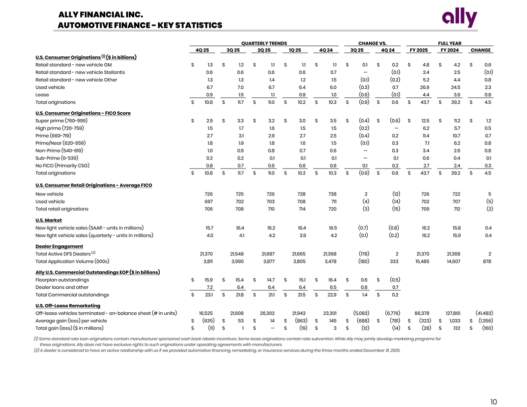 ALLY FINANCIAL INC. AUTOMOTIVE FINANCE - KEY STATISTICS QUARTERLY TRENDS CHANGE VS. FULL YEAR 4Q 25 3Q 25 2Q 25 1Q 25 4Q 24 3Q 25 4Q 24 FY 2025 FY 2024 CHANGE (1) U.S. Consumer Originations ($ in billions) Retail standard - new vehicle GM $ 1.3 $ 1.2 $ 1.1 $ 1.1 $ 1.1 $ 0.1 $ 0.2 $ 4.8 $ 4.2 $ 0.6 Retail standard - new vehicle Stellantis 0.6 0.6 0.6 0.6 0.7 — (0.1) 2.4 2.5 (0.1) Retail standard - new vehicle Other 1.3 1.3 1.4 1.2 1.5 (0.1) (0.2) 5.2 4.4 0.8 Used vehicle 6.7 7.0 6.7 6.4 6.0 (0.3) 0.7 26.9 24.5 2.3 Lease 0.9 1.5 1.1 0.9 1.0 (0.6) (0.1) 4.4 3.6 0.8 Total originations $ 10.8 $ 11.7 $ 11.0 $ 10.2 $ 10.3 $ (0.9) $ 0.6 $ 43.7 $ 39.2 $ 4.5 U.S. Consumer Originations - FICO Score Super prime (760-999) $ 2.9 $ 3.3 $ 3.2 $ 3.0 $ 3.5 $ (0.4) $ (0.6) $ 12.5 $ 11.2 $ 1.2 High prime (720-759) 1.5 1.7 1.6 1.5 1.5 (0.2) — 6.2 5.7 0.5 Prime (660-719) 2.7 3.1 2.9 2.7 2.5 (0.4) 0.2 11.4 10.7 0.7 Prime/Near (620-659) 1.8 1.9 1.8 1.6 1.5 (0.1) 0.3 7.1 6.2 0.8 Non-Prime (540-619) 1.0 0.9 0.8 0.7 0.6 — 0.3 3.4 2.6 0.8 Sub-Prime (0-539) 0.2 0.2 0.1 0.1 0.1 — 0.1 0.6 0.4 0.1 No FICO (Primarily CSG) 0.8 0.7 0.6 0.6 0.6 0.1 0.2 2.7 2.4 0.3 Total originations $ 10.8 $ 11.7 $ 11.0 $ 10.2 $ 10.3 $ (0.9) $ 0.6 $ 43.7 $ 39.2 $ 4.5 U.S. Consumer Retail Originations - Average FICO New vehicle 726 725 726 728 738 2 (12) 726 722 5 Used vehicle 697 702 703 708 711 (4) (14) 702 707 (5) Total retail originations 706 708 710 714 720 (3) (15) 709 712 (2) U.S. Market New light vehicle sales (SAAR - units in millions) 15.7 16.4 16.2 16.4 16.5 (0.7) (0.8) 16.2 15.8 0.4 New light vehicle sales (quarterly - units in millions) 4.0 4.1 4.2 3.9 4.2 (0.1) (0.2) 16.2 15.9 0.4 Dealer Engagement (2) Total Active DFS Dealers 21,370 21,548 21,687 21,665 21,368 (178) 2 21,370 21,368 2 Total Application Volume (000s) 3,811 3,990 3,877 3,805 3,478 (180) 333 15,485 14,607 878 Ally U.S. Commercial Outstandings EOP ($ in billions) Floorplan outstandings $ 15.9 $ 15.4 $ 14.7 $ 15.1 $ 16.4 $ 0.6 $ (0.5) Dealer loans and other 7.2 6.4 6.4 6.4 6.5 0.8 0.7 Total Commercial outstandings $ 23.1 $ 21.8 $ 21.1 $ 21.5 $ 22.9 $ 1.4 $ 0.2 U.S. Off-Lease Remarketing Off-lease vehicles terminated - on-balance sheet (# in units) 16,525 21,608 26,302 21,943 23,301 (5,083) (6,776) 86,378 127,861 (41,483) Average gain (loss) per vehicle $ (635) $ 53 $ 14 $ (863) $ 145 $ (688) $ (781) $ (323) $ 1,033 $ (1,356) Total gain (loss) ($ in millions) $ (11) $ 1 $ — $ (19) $ 3 $ (12) (14) $ (28) $ 132 $ (160) (1) Some standard rate loan originations contain manufacturer sponsored cash back rebate incentives. Some lease originations contain rate subvention. While Ally may jointly develop marketing programs for these originations, Ally does not have exclusive rights to such originations under operating agreements with manufacturers. (2) A dealer is considered to have an active relationship with us if we provided automotive financing, remarketing, or insurance services during the three months ended December 31, 2025. 10