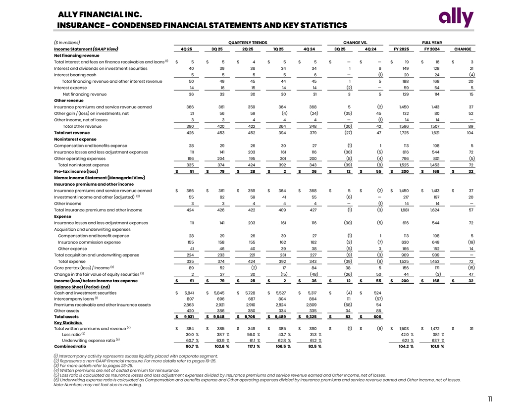 ALLY FINANCIAL INC. INSURANCE - CONDENSED FINANCIAL STATEMENTS AND KEY STATISTICS ($ in millions) QUARTERLY TRENDS CHANGE VS. FULL YEAR Income Statement (GAAP View) 4Q 25 3Q 25 2Q 25 1Q 25 4Q 24 3Q 25 4Q 24 FY 2025 FY 2024 CHANGE Net financing revenue (1) Total interest and fees on finance receivables and loans $ 5 $ 5 $ 4 $ 5 $ 5 $ — $ — $ 19 $ 16 $ 3 Interest and dividends on investment securities 40 39 36 34 34 1 6 149 128 21 Interest bearing cash 5 5 5 5 6 — (1) 20 24 (4) Total financing revenue and other interest revenue 50 49 45 44 45 1 5 188 168 20 Interest expense 14 16 15 14 14 (2) — 59 54 5 Net financing revenue 36 33 30 30 31 3 5 129 114 15 Other revenue Insurance premiums and service revenue earned 366 361 359 364 368 5 (2) 1,450 1,413 37 Other gain / (loss) on investments, net 21 56 59 (4) (24) (35) 45 132 80 52 Other income, net of losses 3 3 4 4 4 — (1) 14 14 — Total other revenue 390 420 422 364 348 (30) 42 1,596 1,507 89 Total net revenue 426 453 452 394 379 (27) 47 1,725 1,621 104 Noninterest expense Compensation and benefits expense 28 29 26 30 27 (1) 1 113 108 5 Insurance losses and loss adjustment expenses 111 141 203 161 116 (30) (5) 616 544 72 Other operating expenses 196 204 195 201 200 (8) (4) 796 801 (5) Total noninterest expense 335 374 424 392 343 (39) (8) 1,525 1,453 72 Pre-tax income (loss) $ 91 $ 79 $ 28 $ 2 $ 36 $ 12 $ 55 $ 200 $ 168 $ 32 Memo: Income Statement (Managerial View) Insurance premiums and other income Insurance premiums and service revenue earned $ 366 $ 361 $ 359 $ 364 $ 368 $ 5 $ (2) $ 1,450 $ 1,413 $ 37 (2) Investment income and other (adjusted) 55 62 59 41 55 (6) — 217 197 20 Other income 3 3 4 4 4 — (1) 14 14 — Total insurance premiums and other income 424 426 422 409 427 (1) (3) 1,681 1,624 57 Expense Insurance losses and loss adjustment expenses 111 141 203 161 116 (30) (5) 616 544 72 Acquisition and underwriting expenses Compensation and benefit expense 28 29 26 30 27 (1) 1 113 108 5 Insurance commission expense 155 158 155 162 162 (3) (7) 630 649 (19) Other expense 41 46 40 39 38 (5) 3 166 152 14 Total acquisition and underwriting expense 224 233 221 231 227 (9) (3) 909 909 — Total expense 335 374 424 392 343 (39) (8) 1,525 1,453 72 (2) Core pre-tax (loss) / income 89 52 (2) 17 84 38 5 156 171 (15) (3) Change in the fair value of equity securities 2 27 30 (15) (48) (26) 50 44 (3) 47 Income (loss) before income tax expense $ 91 $ 79 $ 28 $ 2 $ 36 $ 12 $ 55 $ 200 $ 168 $ 32 Balance Sheet (Period-End) Cash and investment securities $ 5,841 $ 5,845 $ 5,728 $ 5,527 $ 5,317 $ (4) $ 524 (1) Intercompany loans 807 696 687 804 864 111 (57) Premiums receivable and other insurance assets 2,863 2,921 2,910 2,824 2,809 (58) 54 Other assets 420 386 380 334 335 34 85 Total assets $ 9,931 $ 9,848 $ 9,705 $ 9,489 $ 9,325 $ 83 $ 606 Key Statistics (4) Total written premiums and revenue $ 384 $ 385 $ 349 $ 385 $ 390 $ (1) $ (6) $ 1,503 $ 1,472 $ 31 (5) Loss ratio 30.0 % 3 8.7 % 56.0 % 4 3.7 % 3 1.3 % 4 2.0 % 38.1 % (6) Underwriting expense ratio 60.7 % 6 3.9 % 61.1 % 6 2.8 % 61.2 % 6 2.1 % 63.7 % Combined ratio 9 0.7 % 1 02.6 % 117.1 % 106.5 % 92.5 % 104.2 % 101.9 % (1) Intercompany activity represents excess liquidity placed with corporate segment. (2) Represents a non-GAAP financial measure. For more details refer to pages 19-25. (3) For more details refer to pages 23-25. (4) Written premiums are net of ceded premium for reinsurance. (5) Loss ratio is calculated as Insurance losses and loss adjustment expenses divided by Insurance premiums and service revenue earned and Other Income, net of losses. (6) Underwriting expense ratio is calculated as Compensation and benefits expense and Other operating expenses divided by Insurance premiums and service revenue earned and Other income, net of losses. Note: Numbers may not foot due to rounding. 11