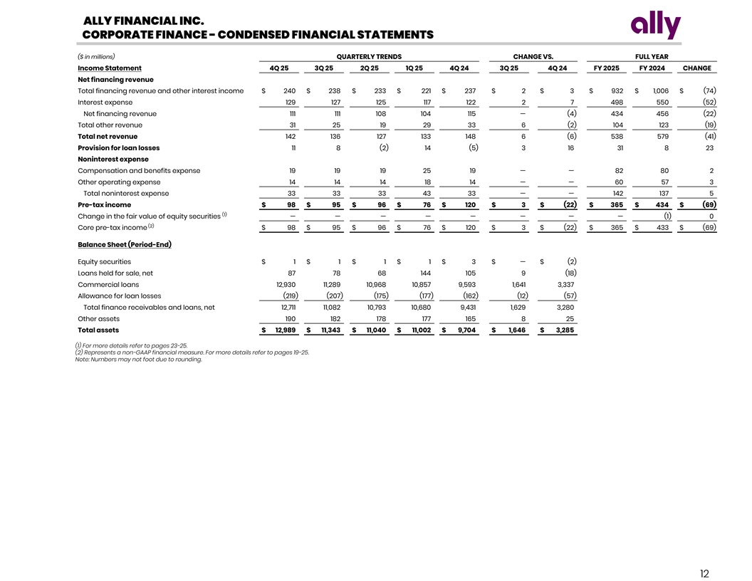 ALLY FINANCIAL INC. CORPORATE FINANCE - CONDENSED FINANCIAL STATEMENTS ($ in millions) QUARTERLY TRENDS CHANGE VS. FULL YEAR Income Statement 4Q 25 3Q 25 2Q 25 1Q 25 4Q 24 3Q 25 4Q 24 FY 2025 FY 2024 CHANGE Net financing revenue Total financing revenue and other interest income $ 240 $ 238 $ 233 $ 221 $ 237 $ 2 $ 3 $ 932 $ 1,006 $ (74) Interest expense 129 127 125 117 122 2 7 498 550 (52) Net financing revenue 111 111 108 104 115 — (4) 434 456 (22) Total other revenue 31 25 19 29 33 6 (2) 104 123 (19) Total net revenue 142 136 127 133 148 6 (6) 538 579 (41) Provision for loan losses 11 8 (2) 14 (5) 3 16 31 8 23 Noninterest expense Compensation and benefits expense 19 19 19 25 19 — — 82 80 2 Other operating expense 14 14 14 18 14 — — 60 57 3 Total noninterest expense 33 33 33 43 33 — — 142 137 5 Pre-tax income $ 98 $ 95 $ 96 $ 76 $ 120 $ 3 $ (22) $ 365 $ 434 $ (69) (1) Change in the fair value of equity securities — — — — — — — — (1) 0 (2) Core pre-tax income $ 98 $ 95 $ 96 $ 76 $ 120 $ 3 $ (22) $ 365 $ 433 $ (69) Balance Sheet (Period-End) Equity securities $ 1 $ 1 $ 1 $ 1 $ 3 $ — $ (2) Loans held for sale, net 87 78 68 144 105 9 (18) Commercial loans 12,930 11,289 10,968 10,857 9,593 1,641 3,337 Allowance for loan losses (219) (207) (175) (177) (162) (12) (57) Total finance receivables and loans, net 12,711 11,082 10,793 10,680 9,431 1,629 3,280 Other assets 190 182 178 177 165 8 25 Total assets $ 12,989 $ 11,343 $ 11,040 $ 11,002 $ 9,704 $ 1,646 $ 3,285 (1) For more details refer to pages 23-25. (2) Represents a non-GAAP financial measure. For more details refer to pages 19-25. Note: Numbers may not foot due to rounding. 12