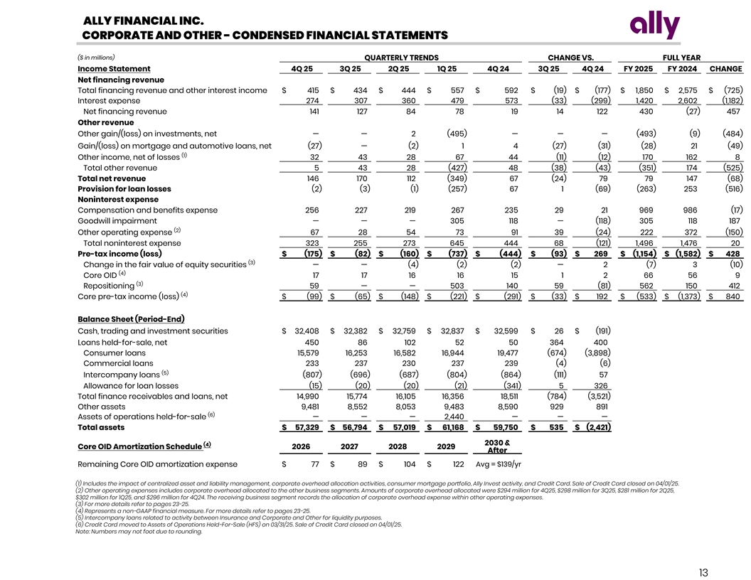 ALLY FINANCIAL INC. CORPORATE AND OTHER - CONDENSED FINANCIAL STATEMENTS ($ in millions) QUARTERLY TRENDS CHANGE VS. FULL YEAR Income Statement 4Q 25 3Q 25 2Q 25 1Q 25 4Q 24 3Q 25 4Q 24 FY 2025 FY 2024 CHANGE Net financing revenue Total financing revenue and other interest income $ 415 $ 434 $ 444 $ 557 $ 592 $ (19) $ (177) $ 1,850 $ 2,575 $ (725) Interest expense 274 307 360 479 573 (33) (299) 1,420 2,602 (1,182) Net financing revenue 141 127 84 78 19 14 122 430 (27) 457 Other revenue Other gain/(loss) on investments, net — — 2 (495) — — — (493) (9) (484) Gain/(loss) on mortgage and automotive loans, net (27) — (2) 1 4 (27) (31) (28) 21 (49) (1) Other income, net of losses 32 43 28 67 44 (11) (12) 170 162 8 Total other revenue 5 43 28 (427) 48 (38) (43) (351) 174 (525) Total net revenue 146 170 112 (349) 67 (24) 79 79 147 (68) Provision for loan losses (2) (3) (1) (257) 67 1 (69) (263) 253 (516) Noninterest expense Compensation and benefits expense 256 227 219 267 235 29 21 969 986 (17) Goodwill impairment — — — 305 118 — (118) 305 118 187 (2) Other operating expense 67 28 54 73 91 39 (24) 222 372 (150) Total noninterest expense 323 255 273 645 444 68 (121) 1,496 1,476 20 Pre-tax income (loss) $ (175) $ (82) $ (160) $ (737) $ (444) $ (93) $ 269 $ (1,154) $ (1,582) $ 428 (3) Change in the fair value of equity securities — — (4) (2) (2) — 2 (7) 3 (10) (4) Core OID 17 17 16 16 15 1 2 66 56 9 (3) Repositioning 59 — — 503 140 59 (81) 562 150 412 (4) Core pre-tax income (loss) $ (99) $ (65) $ (148) $ (221) $ (291) $ (33) $ 192 $ (533) $ (1,373) $ 840 Balance Sheet (Period-End) Cash, trading and investment securities $ 32,408 $ 32,382 $ 32,759 $ 32,837 $ 32,599 $ 26 $ (191) Loans held-for-sale, net 450 86 102 52 50 364 400 Consumer loans 15,579 16,253 16,582 16,944 19,477 (674) (3,898) Commercial loans 233 237 230 237 239 (4) (6) (5) Intercompany loans (807) (696) (687) (804) (864) (111) 57 Allowance for loan losses (15) (20) (20) (21) (341) 5 326 Total finance receivables and loans, net 14,990 15,774 16,105 16,356 18,511 (784) (3,521) Other assets 9,481 8,552 8,053 9,483 8,590 929 891 (6) Assets of operations held-for-sale — — — 2,440 — — — Total assets $ 57,329 $ 56,794 $ 57,019 $ 61,168 $ 59,750 $ 535 $ (2,421) 2030 & (4) Core OID Amortization Schedule 2026 2027 2028 2029 After Remaining Core OID amortization expense $ 77 $ 89 $ 104 $ 122 Avg = $139/yr (1) Includes the impact of centralized asset and liability management, corporate overhead allocation activities, consumer mortgage portfolio, Ally Invest activity, and Credit Card. Sale of Credit Card closed on 04/01/25. (2) Other operating expenses includes corporate overhead allocated to the other business segments. Amounts of corporate overhead allocated were $294 million for 4Q25, $298 million for 3Q25, $281 million for 2Q25, $302 million for 1Q25, and $296 million for 4Q24. The receiving business segment records the allocation of corporate overhead expense within other operating expenses. (3) For more details refer to pages 23-25. (4) Represents a non-GAAP financial measure. For more details refer to pages 23-25. (5) Intercompany loans related to activity between Insurance and Corporate and Other for liquidity purposes. (6) Credit Card moved to Assets of Operations Held-For-Sale (HFS) on 03/31/25. Sale of Credit Card closed on 04/01/25. Note: Numbers may not foot due to rounding. 13