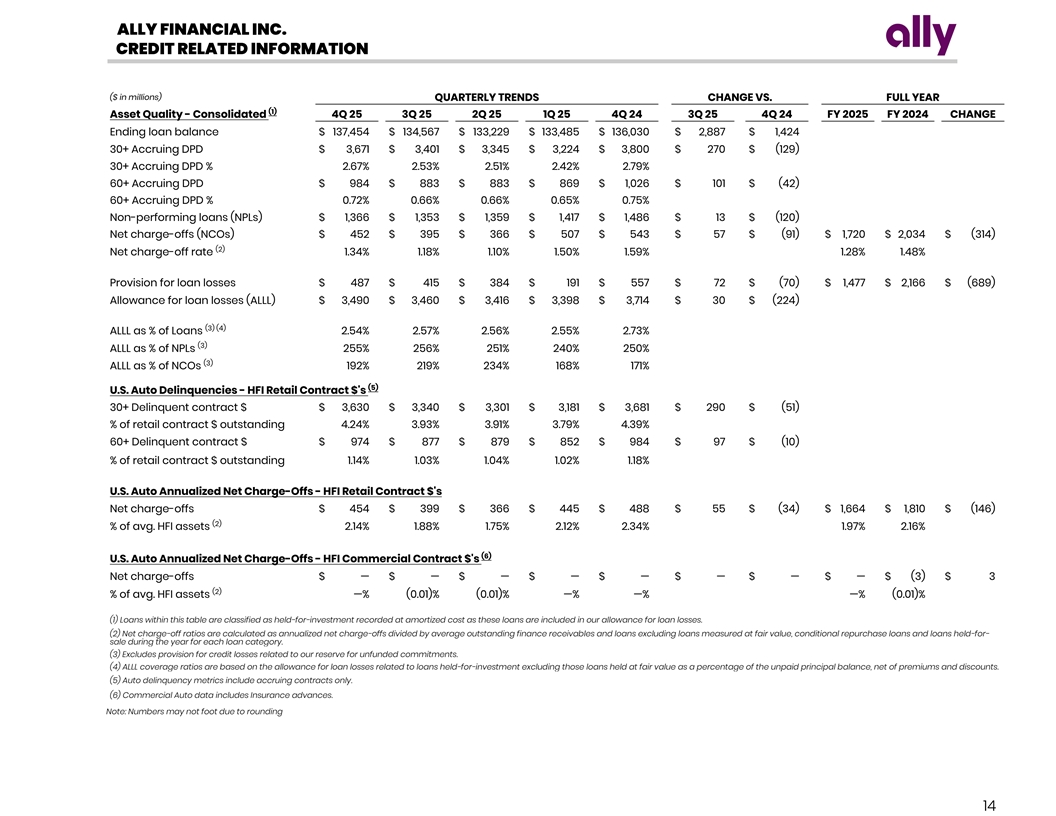 ALLY FINANCIAL INC. CREDIT RELATED INFORMATION ($ in millions) QUARTERLY TRENDS CHANGE VS. FULL YEAR (1) Asset Quality - Consolidated 4Q 25 3Q 25 2Q 25 1Q 25 4Q 24 3Q 25 4Q 24 FY 2025 FY 2024 CHANGE Ending loan balance $ 137,454 $ 134,567 $ 133,229 $ 133,485 $ 136,030 $ 2,887 $ 1,424 30+ Accruing DPD $ 3,671 $ 3,401 $ 3,345 $ 3,224 $ 3,800 $ 270 $ (129) 30+ Accruing DPD % 2 .67 % 2 .53% 2 .51% 2.42% 2.79% 60+ Accruing DPD $ 984 $ 883 $ 883 $ 869 $ 1,026 $ 101 $ (42) 60+ Accruing DPD % 0.72% 0.66% 0.66% 0 .65 % 0 .75 % Non-performing loans (NPLs) $ 1,366 $ 1,353 $ 1,359 $ 1,417 $ 1,486 $ 13 $ (120) Net charge-offs (NCOs) $ 452 $ 395 $ 366 $ 507 $ 543 $ 57 $ (91) $ 1,720 $ 2,034 $ (314) (2) Net charge-off rate 1.34 % 1.18 % 1 .10% 1.50% 1.59% 1 .28 % 1 .48 % Provision for loan losses $ 487 $ 415 $ 384 $ 191 $ 557 $ 72 $ (70) $ 1,477 $ 2,166 $ (689) Allowance for loan losses (ALLL) $ 3,490 $ 3,460 $ 3,416 $ 3,398 $ 3,714 $ 30 $ (224) (3) (4) ALLL as % of Loans 2 .54 % 2.57 % 2 .56% 2.55% 2.73 % (3) ALLL as % of NPLs 2 55% 256 % 251% 240% 250 % (3) ALLL as % of NCOs 192% 219% 2 34 % 168% 1 71% (5) U.S. Auto Delinquencies - HFI Retail Contract $'s 30+ Delinquent contract $ $ 3,630 $ 3,340 $ 3,301 $ 3,181 $ 3,681 $ 290 $ (51) % of retail contract $ outstanding 4 .24 % 3 .93 % 3 .91% 3.79% 4 .39% 60+ Delinquent contract $ $ 974 $ 877 $ 879 $ 852 $ 984 $ 97 $ (10) % of retail contract $ outstanding 1 .14 % 1 .03% 1.04% 1.02% 1.18% U.S. Auto Annualized Net Charge-Offs - HFI Retail Contract $'s Net charge-offs $ 454 $ 399 $ 366 $ 445 $ 488 $ 55 $ (34) $ 1,664 $ 1,810 $ (146) (2) % of avg. HFI assets 2.14 % 1.88% 1 .75 % 2 .12 % 2.34% 1.97% 2 .16 % (6) U.S. Auto Annualized Net Charge-Offs - HFI Commercial Contract $'s Net charge-offs $ — $ — $ — $ — $ — $ — $ — $ — $ (3) $ 3 (2) % of avg. HFI assets — % (0.01) % (0.01) % — % — % — % (0.01) % (1) Loans within this table are classified as held-for-investment recorded at amortized cost as these loans are included in our allowance for loan losses. (2) Net charge-off ratios are calculated as annualized net charge-offs divided by average outstanding finance receivables and loans excluding loans measured at fair value, conditional repurchase loans and loans held-for- sale during the year for each loan category. (3) Excludes provision for credit losses related to our reserve for unfunded commitments. (4) ALLL coverage ratios are based on the allowance for loan losses related to loans held-for-investment excluding those loans held at fair value as a percentage of the unpaid principal balance, net of premiums and discounts. (5) Auto delinquency metrics include accruing contracts only. (6) Commercial Auto data includes Insurance advances. Note: Numbers may not foot due to rounding 14