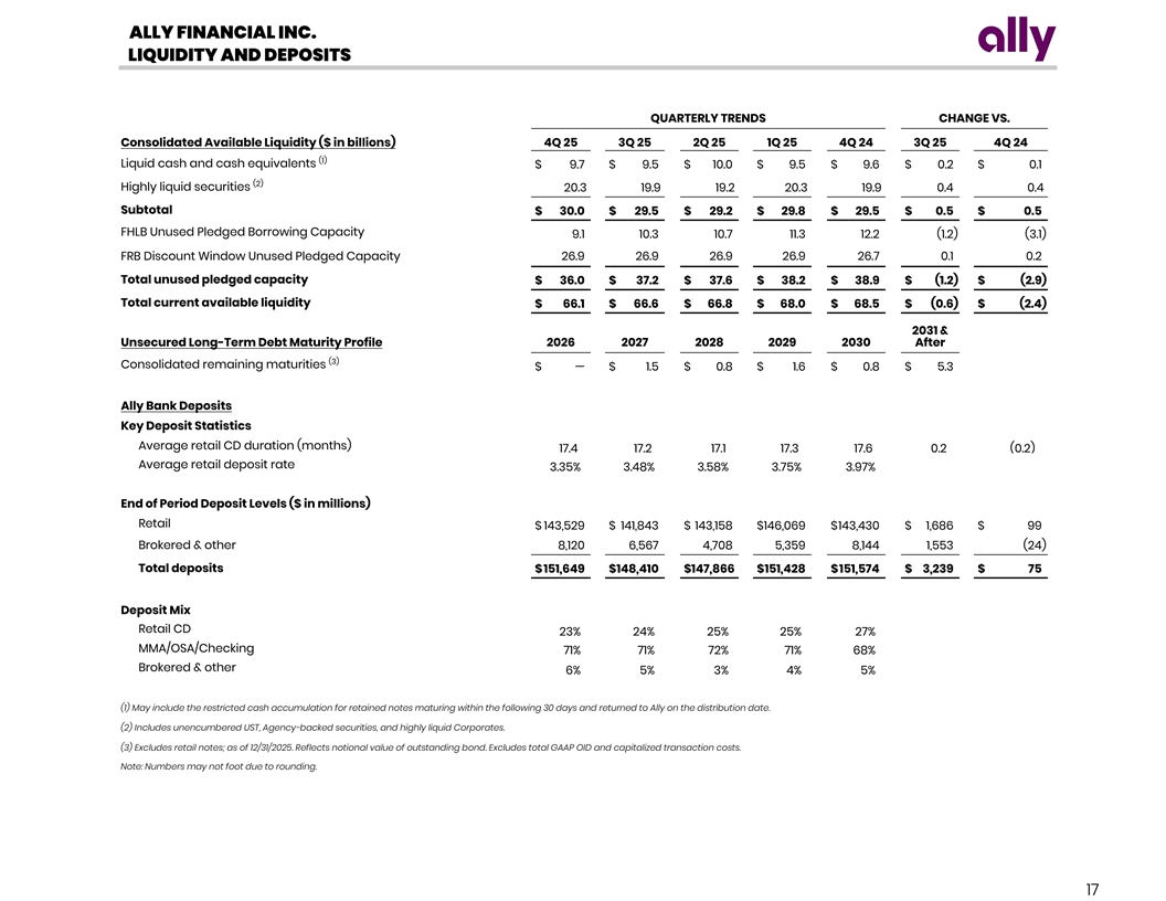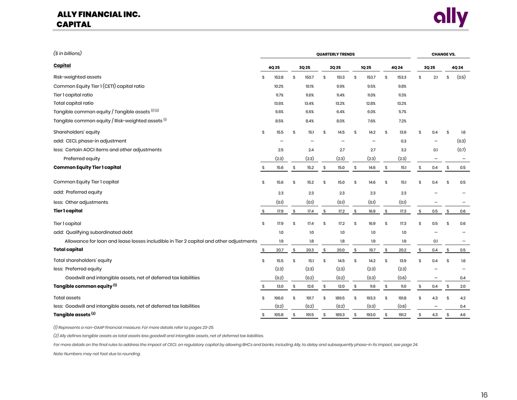 ALLY FINANCIAL INC. CAPITAL ($ in billions) QUARTERLY TRENDS CHANGE VS. Capital 4Q 25 3Q 25 2Q 25 1Q 25 4Q 24 3Q 25 4Q 24 Risk-weighted assets $ 152.8 $ 150.7 $ 151.3 $ 153.7 $ 153.3 $ 2.1 $ (0.5) 10.2 % 1 0.1% 9.9 % 9.5% 9 .8% Common Equity Tier 1 (CET1) capital ratio Tier 1 capital ratio 11.7 % 1 1.6% 1 1.4 % 1 1.0 % 11.3 % Total capital ratio 13.6% 1 3.4 % 1 3.2% 12.8% 13.2% (1) (2) 6 .6% 6 .6 % 6 .4% 6 .0% 5.7% Tangible common equity / Tangible assets (1) Tangible common equity / Risk-weighted assets 8.5 % 8 .4 % 8 .0 % 7 .6% 7.2 % Shareholders’ equity $ 15.5 $ 15.1 $ 14.5 $ 14.2 $ 13.9 $ 0.4 $ 1.6 add: CECL phase-in adjustment — — — — 0.3 — (0.3) less: Certain AOCI items and other adjustments 2.5 2.4 2.7 2.7 3.2 0.1 (0.7) Preferred equity (2.3) (2.3) (2.3) (2.3) (2.3) — — Common Equity Tier 1 capital $ 15.6 $ 15.2 $ 15.0 $ 14.6 $ 15.1 $ 0.4 $ 0.5 Common Equity Tier 1 capital $ 15.6 $ 15.2 $ 15.0 $ 14.6 $ 15.1 $ 0.4 $ 0.5 add: Preferred equity 2.3 2.3 2.3 2.3 2.3 — — less: Other adjustments (0.1) (0.1) (0.1) (0.1) (0.1) — — Tier 1 capital $ 17.9 $ 17.4 $ 17.2 $ 16.9 $ 17.3 $ 0.5 $ 0.6 $ 17.9 $ 17.4 $ 17.2 $ 16.9 $ 17.3 $ 0.5 $ 0.6 Tier 1 capital add: Qualifying subordinated debt 1.0 1.0 1.0 1.0 1.0 — — 1.9 1.8 1.8 1.9 1.9 0.1 — Allowance for loan and lease losses includible in Tier 2 capital and other adjustments Total capital $ 20.7 $ 20.3 $ 20.0 $ 19.7 $ 20.2 $ 0.4 $ 0.5 Total shareholders' equity $ 15.5 $ 15.1 $ 14.5 $ 14.2 $ 13.9 $ 0.4 $ 1.6 less: Preferred equity (2.3) (2.3) (2.3) (2.3) (2.3) — — Goodwill and intangible assets, net of deferred tax liabilities (0.2) (0.2) (0.2) (0.3) (0.6) — 0.4 (1) $ 13.0 $ 12.6 $ 12.0 $ 11.6 $ 11.0 $ 0.4 $ 2.0 Tangible common equity Total assets $ 196.0 $ 191.7 $ 189.5 $ 193.3 $ 191.8 $ 4.3 $ 4.2 less: Goodwill and intangible assets, net of deferred tax liabilities (0.2) (0.2) (0.2) (0.3) (0.6) — 0.4 (2) Tangible assets $ 195.8 $ 191.5 $ 189.3 $ 193.0 $ 191.2 $ 4.3 $ 4.6 (1) Represents a non-GAAP financial measure. For more details refer to pages 23-25. (2) Ally defines tangible assets as total assets less goodwill and intangible assets, net of deferred tax liabilities. For more details on the final rules to address the impact of CECL on regulatory capital by allowing BHCs and banks, including Ally, to delay and subsequently phase-in its impact, see page 24. Note: Numbers may not foot due to rounding. 16