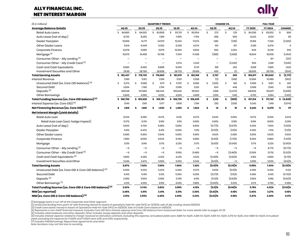 ALLY FINANCIAL INC. NET INTEREST MARGIN ($ in millions) QUARTERLY TRENDS CHANGE VS. FULL YEAR 4Q 25 3Q 25 2Q 25 1Q 25 4Q 24 3Q 25 4Q 24 FY 2025 FY 2024 CHANGE Average Balance Details $ 84,865 $ 84,592 $ 83,858 $ 83,701 $ 83,554 $ 273 $ 1,311 $ 84,258 $ 83,652 $ 606 Retail Auto Loans 8,753 8,255 7,919 7,955 7,794 498 959 8,223 8,133 90 Auto Lease (net of dep.) 15,956 14,771 14,570 15,324 17,074 1,185 (1,118) 15,156 17,361 (2,205) Dealer Floorplan Other Dealer Loans 6,541 6,348 6,293 6,339 6,374 193 167 6,381 6,370 11 12,078 11,085 11,079 10,304 9,824 993 2,254 11,141 10,216 925 Corporate Finance (1) Mortgage 16,070 16,458 16,798 17,104 17,438 (388) (1,368) 16,604 18,058 (1,454) (2) Consumer Other - Ally Lending — — — — — — — — 317 (317) (3) Consumer Other - Ally Credit Card — — — 2,274 2,220 — (2,220) 555 2,081 (1,526) Cash and Cash Equivalents 8,983 8,465 8,888 9,345 8,721 518 262 8,918 7,895 1,023 29,191 28,756 28,658 28,733 29,169 435 22 28,835 29,759 (924) Investment Securities and Other Total Earning Assets $ 182,437 $ 178,730 $ 178,063 $ 181,079 $ 182,168 $ 3,707 $ 269 $ 180,071 $ 183,842 $ (3,771) Interest Revenue 3,160 3,162 3,109 3,153 3,308 (2) (148) 12,584 13,486 (902) (4) $ 11,273 $ 11,598 $ 11,171 $ 11,797 $ 11,083 $ (325) $ 190 $ 11,459 $ 11,167 $ 292 Unsecured Debt (ex. Core OID balance) 2,604 1,780 1,794 2,096 2,155 824 449 2,068 1,540 528 Secured Debt (5) 149,028 147,660 148,444 150,640 151,502 1,368 (2,474) 148,935 152,871 (3,936) Deposits Other Borrowings 5,845 4,590 4,352 4,204 4,699 1,255 1,146 4,752 6,164 (1,412) (4) $ 168,750 $ 165,628 $ 165,761 $ 168,738 $ 169,439 $ 3,122 $ (689) $ 167,214 $ 171,742 $ (4,528) Total Funding Sources (ex. Core OID balance) (4) 1,545 1,561 1,577 1,659 1,784 (16) (239) 6,342 7,416 (1,074) Interest Expense (ex. Core OID) (4) Net Financing Revenue (ex. Core OID) $ 1,615 $ 1,601 $ 1,532 $ 1,494 $ 1,524 $ 14 $ 91 $ 6,242 $ 6,070 $ 171 Net Interest Margin (yield details) Retail Auto Loan 9 .32% 9 .28 % 9.27% 9 .21% 9 .27 % 0.04% 0 .05 % 9.27 % 9 .20% 0 .07% Retail Auto Loan (excl. hedge impact) 9 .27 % 9 .21 % 9 .19% 9 .11 % 9.09% 0 .06% 0 .18% 9.19 % 8.90 % 0 .29% Auto Lease (net of dep.) 5 .93% 6 .70 % 6.88% 5 .69% 6 .60% (0.77)% ( 0.67) % 6 .30% 7.60% (1.30)% 5 .91% 6 .42% 6 .41% 6 .50% 7.01 % (0.51)% ( 1.10) % 6.30 % 7 .51 % ( 1.21) % Dealer Floorplan Other Dealer Loans 5 .68% 5.66% 5 .64% 5 .66% 5.60% 0 .02% 0.08% 5 .65% 5 .63 % 0 .02% Corporate Finance 7 .98% 8.59% 8 .52 % 8.78 % 9.68 % ( 0.61)% ( 1.70)% 8 .45% 9.88 % (1.43) % Mortgage 3 .13% 3 .14 % 3 .17 % 3 .23% 3 .17% ( 0.01) % ( 0.04)% 3 .17% 3 .22% (0.05) % (2) Consumer Other - Ally Lending —% —% — % — % — % — % — % — % 8 .77% ( 8.77)% (3) Consumer Other - Ally Credit Card — % —% —% 21.16% 2 1.48% — % ( 21.48) % 21.39% 21.71% ( 0.32)% (6) 3 .89% 4 .28 % 4.32 % 4 .23 % 4 .52% (0.39)% ( 0.63)% 4 .18% 4 .89% ( 0.71) % Cash and Cash Equivalents Investment Securities and Other 3.34 % 3.47 % 3.50% 3 .26% 3.34% ( 0.13)% — % 3 .39% 3.53% (0.14)% Total Earning Assets 6.87% 7.02 % 7 .00% 7 .06% 7 .22 % ( 0.15)% ( 0.35) % 6.99 % 7 .34% (0.35) % (4) Unsecured Debt (ex. Core OID & Core OID balance) 6 .36 % 6 .33% 6.42 % 6 .40 % 6 .37 % 0 .03% (0.01) % 6.38% 6.26% 0 .12% 5 .14% 5 .41% 5 .51 % 5.55 % 6.29% (0.27)% ( 1.15) % 5 .38% 6 .14% (0.76) % Secured Debt (5) Deposits 3 .38 % 3 .50% 3.59 % 3 .78 % 4 .01 % ( 0.12) % ( 0.63) % 3 .56% 4 .18 % ( 0.62)% (7) Other Borrowings 4 .21 % 4 .26% 4 .15 % 4 .03 % 3 .88 % ( 0.05)% 0.33 % 4 .17% 3.79 % 0.38 % (4) Total Funding Sources (ex. Core OID & Core OID balance) 3 .63 % 3.74 % 3 .82 % 3 .99 % 4 .19% ( 0.11)% ( 0.56)% 3 .79% 4.32% ( 0.53)% 3.48 % 3.51% 3 .41% 3 .31% 3 .30% (0.03)% 0.18 % 3.43% 3.27 % 0 .16% NIM (as reported) (4) 3 .51 % 3.55% 3.45 % 3.35 % 3 .33% (0.04)% 0 .18 % 3 .47% 3.30% 0 .17% NIM (ex. Core OID & Core OID balance) (1) Mortgage loans in run-off at the Corporate and Other segment. (2) Unsecured lending from point-of-sale financing. Moved to assets of operations held-for-sale (HFS) on 12/31/23; sale of Ally Lending closed 03/01/24. (3) Credit card assets moved to Assets of Operations Held-for-Sale (HFS) on 03/31/25. Sale of Credit Card closed on 04/01/25. (4) Represents a non-GAAP financial measure. Excludes Core OID from interest expense and Core OID balance from Unsecured Debt. For more details refer to pages 23-25. (5) Includes retail, brokered, and other deposits. Other includes sweep deposits and other deposits. (6) Includes interest expense related to margin received on derivative contracts. Excluding this expense, annualized yields were 3.88% for 4Q25, 4.28% for 3Q25, 4.35% for 2Q25, 4.37% for 1Q25, and 4.68% for 4Q24. Annualized yields excluding this expense for FY2025 and FY2024 were 4.21% and 5.15%, respectively. (7) Includes FHLB Borrowings, Repurchase Agreements and other. Note: Numbers may not foot due to rounding. 18