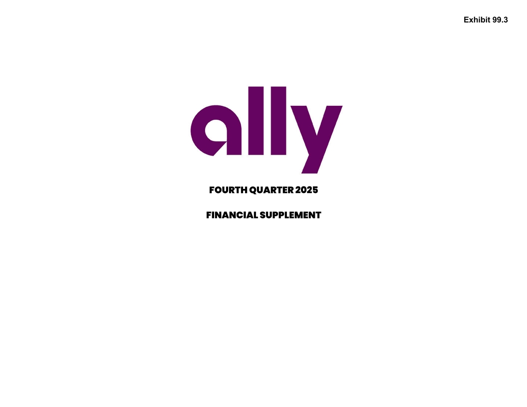 ALLY FINANCIAL INC. FORWARD-LOOKING STATEMENTS AND ADDITIONAL INFORMATION This document and related communications should be read in conjunction with the financial statements, notes, and other information contained in our Annual Reports on Form 10-K, Quarterly Reports on Form 10-Q, and Current Reports on Form 8-K. This information is preliminary and based on company and third-party data available at the time of the presentation or related communication. This document and related communications contain forward-looking statements within the meaning of the Private Securities Litigation Reform Act of 1995. These statements can be identified by the fact that they do not relate strictly to historical or current facts—such as statements about the outlook for financial and operating metrics and performance and future capital allocation and actions. Forward-looking statements often use words such as “believe,” “expect,” “anticipate,” “intend,” “pursue,” “seek,” “continue,” “estimate,” “project,” “outlook,” “forecast,” “potential,” “target,” “objective,” “trend,” “plan,” “goal,” “initiative,” “priorities,” or other words of comparable meaning or future-tense or conditional verbs such as “may,” “will,” “should,” “would,” or “could.” Forward-looking statements convey our expectations, intentions, or forecasts about future events, circumstances, or results. All forward-looking statements, by their nature, are subject to assumptions, risks, and uncertainties, which may change over time and many of which are beyond our control. In particular, forward-looking statements about Ally’s outlook, including expectations regarding net interest margin, adjusted other revenue, net-charge offs, non-interest expenses and average earning assets, and other forward-looking statements are based on our current expectations and are subject to various important factors that could cause actual results to differ materially, including general economic conditions, expectations regarding interest rates and inflation, monetary and fiscal policies in the United States and other jurisdictions, the composition of our balance sheet, including with respect to our loan and securities portfolios, the impact of our strategic initiatives, including recent initiatives involving our Credit Card and Mortgage operations, demand for new and used vehicles, demand for auto loans and leases and the impact of escalating tariffs and other trade policies on us, our customers and our strategic partners, and the economic impacts, volatility and uncertainty resulting therefrom. You should not rely on any forward-looking statement as a prediction or guarantee about the future. Actual future objectives, strategies, plans, prospects, performance, conditions, or results may differ materially from those set forth in any forward-looking statement. Some of the factors that may cause actual results or other future events or circumstances to differ from those in forward-looking statements are described above and in our Annual Report on Form 10-K for the year ended December 31, 2024, our subsequent Quarterly Reports on Form 10-Q or Current Reports on Form 8-K, or other applicable documents that are filed or furnished with the U.S. Securities and Exchange Commission (collectively, our “SEC filings”). Any forward-looking statement made by us or on our behalf speaks only as of the date that it was made. We do not undertake to update any forward-looking statement to reflect the impact of events, circumstances, or results that arise after the date that the statement was made, except as required by applicable securities laws. You, however, should consult further disclosures (including disclosures of a forward-looking nature) that we may make in any subsequent SEC filings. This document and related communications contain specifically identified non-GAAP financial measures, which supplement the results that are reported according to U.S. generally accepted accounting principles (“GAAP”). These non-GAAP financial measures may be useful to investors but should not be viewed in isolation from, or as a substitute for, GAAP results. Differences between non-GAAP financial measures and comparable GAAP financial measures are reconciled in the presentation. This presentation also includes forward-looking non-GAAP financial measures, such as outlooks for Net Interest Margin (ex. OID), Adjusted Other Revenue and Adjusted Noninterest Expense. We are unable to provide a reconciliation of these forward-looking non-GAAP financial measures to their most directly comparable GAAP financial measures because we are unable to provide, without unreasonable effort, a meaningful or accurate calculation or estimation of amounts that would be necessary for the reconciliation due to the inherent difficulty in forecasting and quantifying the occurrence and financial impact of various items that have not yet occurred, are out of our control or cannot be reasonably predicted. Forward-looking non-GAAP financial measures may vary materially from the corresponding GAAP financial measures. Unless the context otherwise requires, the following definitions apply. The term “loans” means the following consumer and commercial products associated with our direct and indirect financing activities: loans, retail installment sales contracts, lines of credit, and other financing products excluding operating leases. The term “operating leases” means consumer- and commercial-vehicle lease agreements where Ally is the lessor and the lessee is generally not obligated to acquire ownership of the vehicle at lease-end or compensate Ally for the vehicle’s residual value. The terms “lend,” “finance,” and “originate” mean our direct extension or origination of loans, our purchase or acquisition of loans, or our purchase of operating leases, as applicable. The term “consumer” means all cons